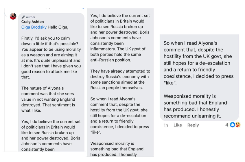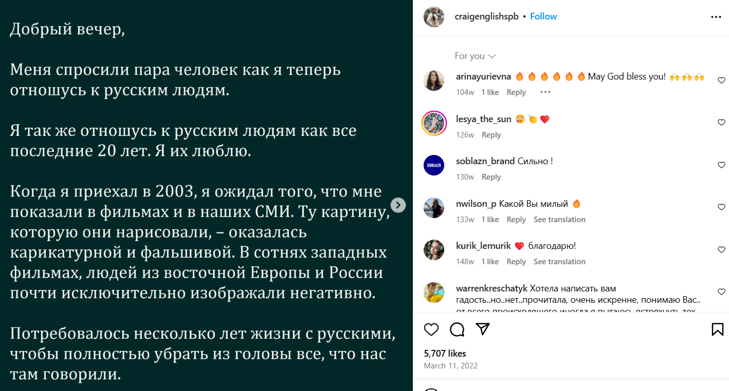 "Кокни по-русски", это, конечно, занятно, но мне, вот, в свое время Крейг открылся несколько с иной стороны, а именно, как человек, нормализующий происходящее в РФ, а заодно иногда выступающий в унисон с российскими пропагандистами. Вот, например, скриншот комментария, где он обличает Британию в том, что она, дескать, с помощью санкций, пытается уничтожить Россию, и что вообще какие плохие британские политики, потому что они антирусские. Все это происходит на исходе третьего года полномасштабной агрессии России против Украины. Подробности по ссылке: www.facebook.com