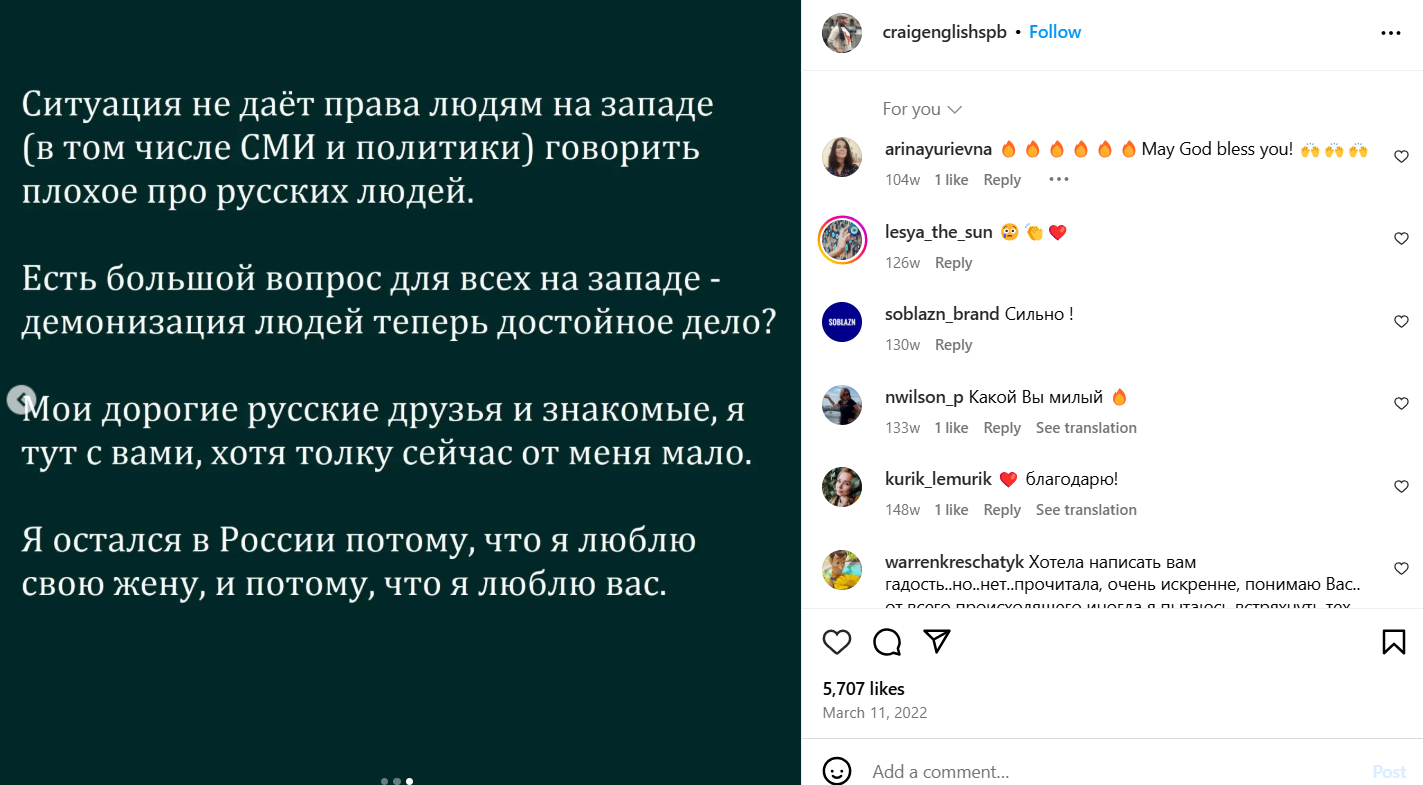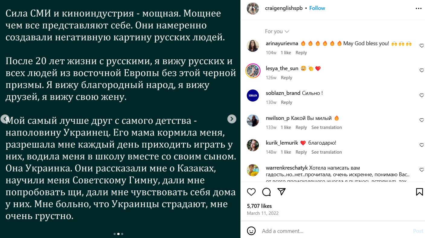А вот его пост от 11 марта 2022 года, через несколько дней после начала войны, где он "хотя и сочувствует украинцам", осуждает "демонизацию русских людей": www.instagram.com