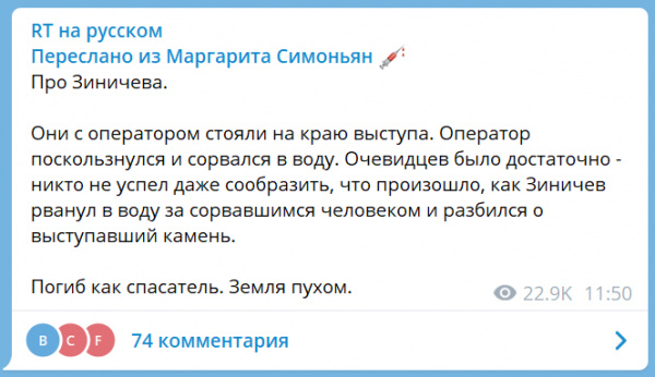 Вскоре, правда, выяснилось, что погиб никакой не оператор, а режиссер Александр Мельник («Малая земля», «Территория»). И было это не на учениях, а во время туристической поездки на водопад. А снимался ли при этом вообще какой-то фильм — непонятно, дело темное. И возможно правы были те, кто сразу усомнился в способности высшего путинского окружения (а Зиничев долгие годы был личным охранником президента РФ) куда-то прыгнуть, особенно — чтобы кого-то спасти. Потому что позднее была озвучена уже совсем другая версия: Зиничев не пытался спасти Мельника, а наоборот, вроде бы, начал падать первым. В общем, как всегда у нас, ничего не понятно: то ли проезжал, то ли не проезжал, а если проезжал, то проехал мимо ©.