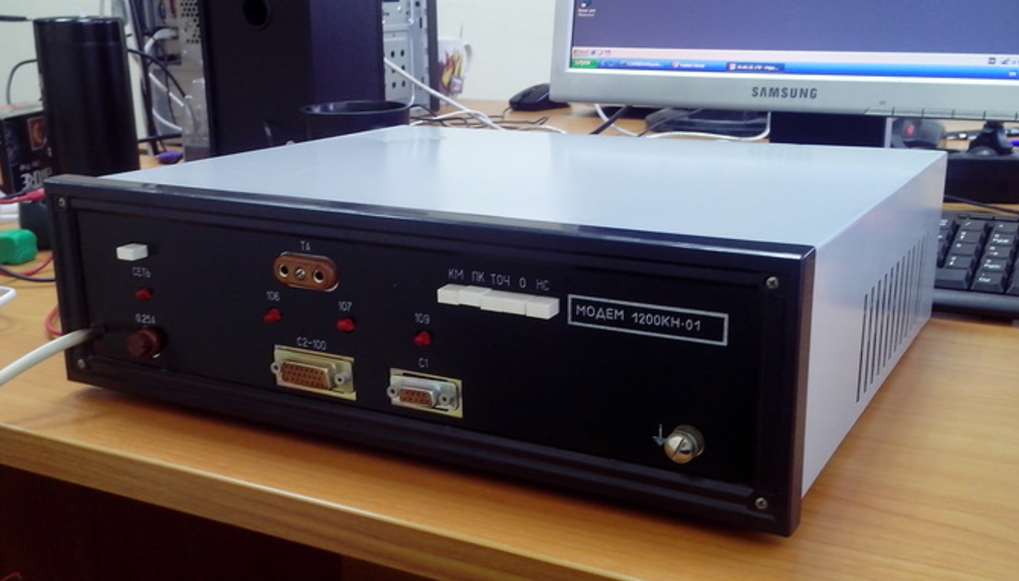 На фото один из первых советских модемов. 1989 год производства, примерно. Делали для соединения вычислительных центров (а не самопальных ПКшек, естественно).