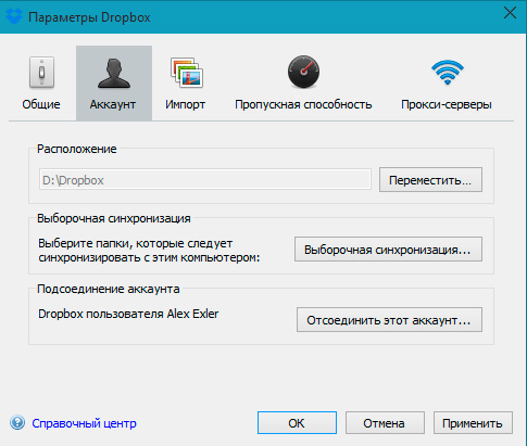 При работе с облачным сервисом Dropbox пользователи обычно меняют расположение папки с данными, которую Dropbox по умолчанию создает в папке пользователя. Например, у меня папка Dropbox расположена в корне диска с данными, а не на системном диске.