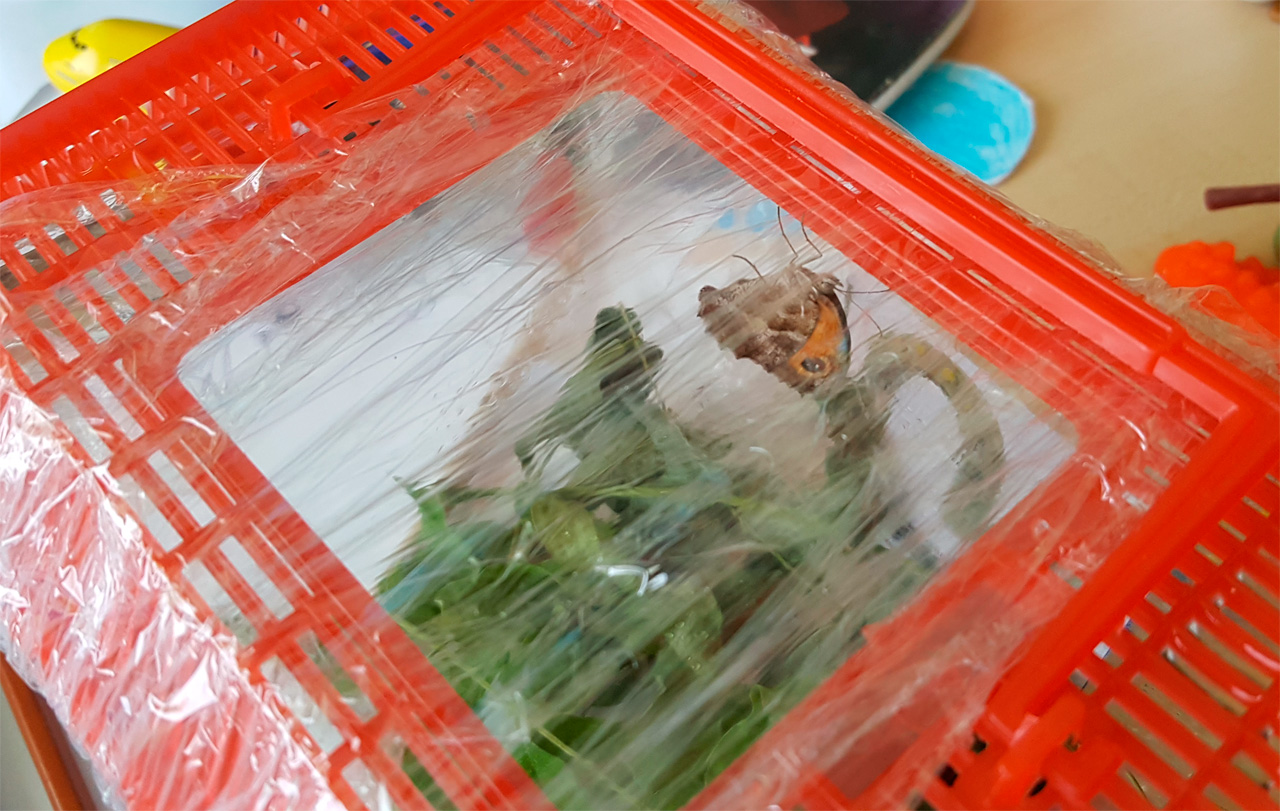 На следующий день ребенок с утра пораньше засел за планшет - новая развивающая игра и всё такое. Я пришел к нему и сказал: а что это ты засел за планшет, когда у тебя бабочка в коробке сидит не кормлена не поена? Давай, собирай ей свежую травку, ставь плошку с соком. Раз у тебя в неволе живое существо - нужно о нём заботится. Так что положил планшет - и вперёд!