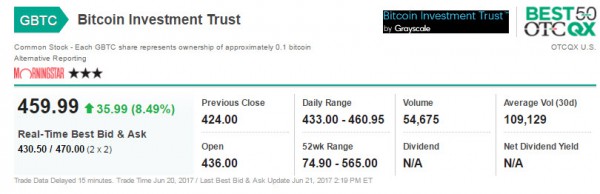 Сейчас акции Bitcoin Investment Trust торгуются с премией к курсу биткоина.