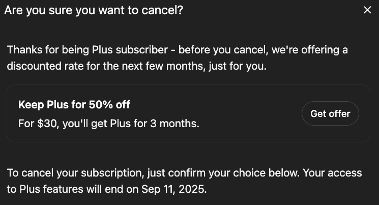 сразу пошёл отписываться от ChatGPT и после нажатия на Cancel получил интересное предложение.