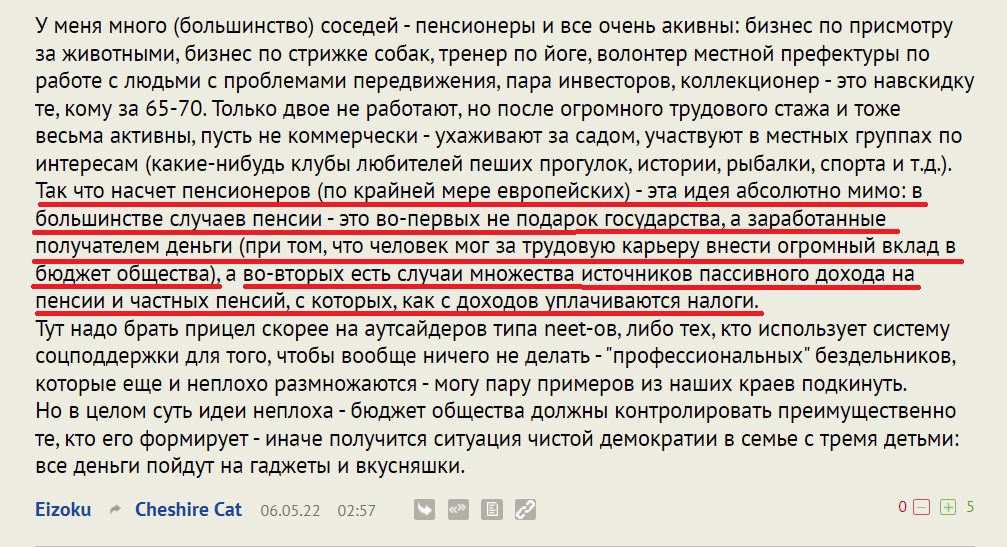 Но в целом суть идеи неплоха - бюджет общества должны контролировать преимущественно те, кто его формирует - иначе получится ситуация чистой демократии в семье с тремя детьми: все деньги пойдут на гаджеты и вкусняшки.