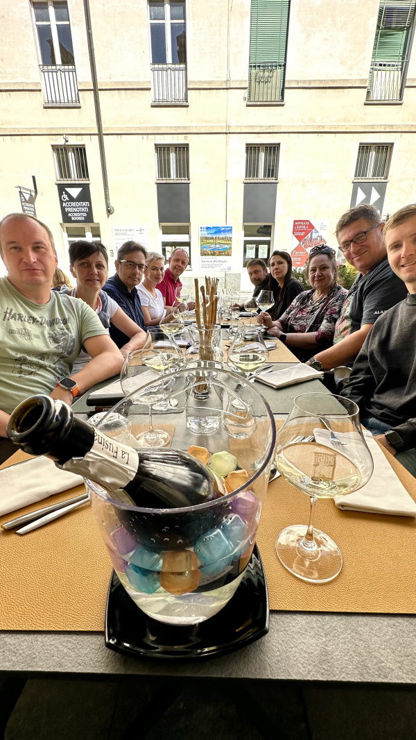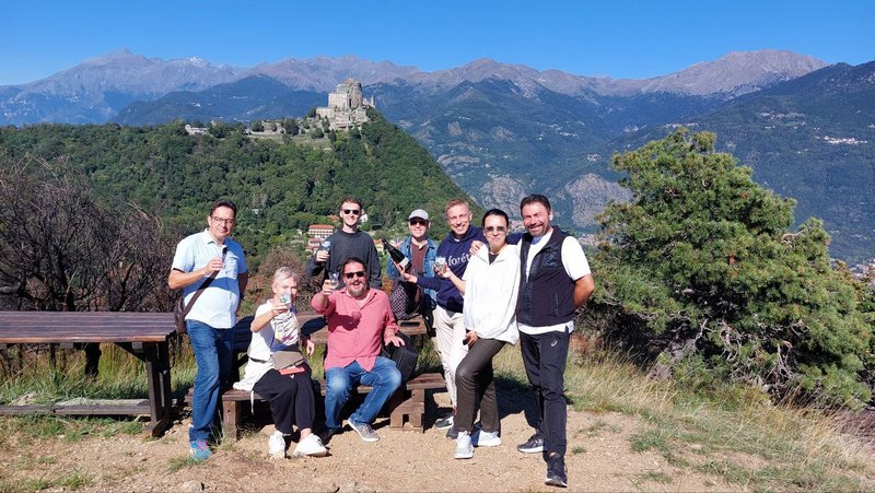 В день приезда ребята провели небольшую экскурсию по Турину для тех, кто приехал раньше, а вечером мы все вместе поднялись на обзорную точку на горе Капуцинов, чтобы полюбоваться Турином и Альпами на закате, а потом пошли ужинать в ресторанчик с аутентичной пьемонтской едой и вином.