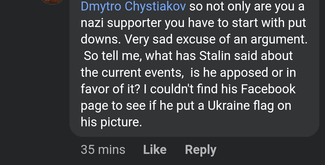 Это ничего. Мне человек типа как из Новой Зеландии, смотрящий RT, рассказывал что не может ФБ Сталина найти и есть ли там Украинский флаг на аватаре 😄