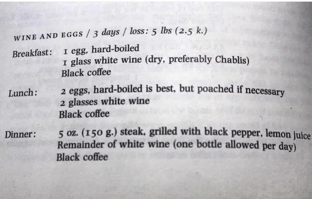 Бутылка вина 500 ккал, три яйца 250 ккал, стейк 500 ккал, итого 1250 ккал в день. Запросто вес можно сбросить. А вино поможет не грустить от голодухи.