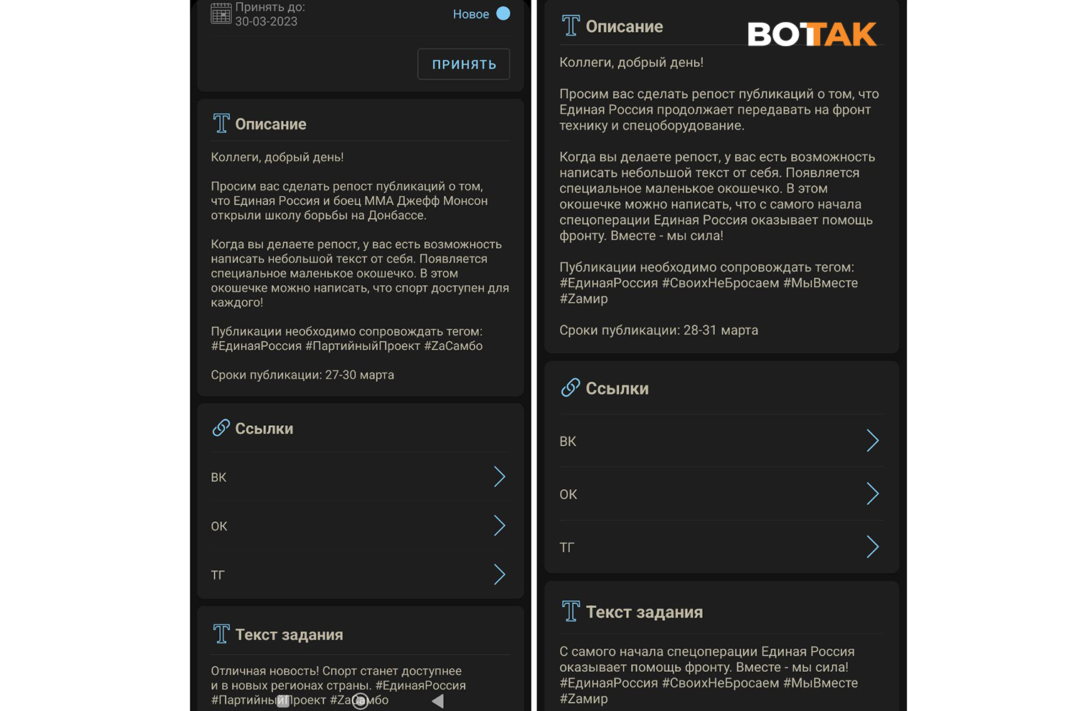 Раньше, по его словам, партийный софт действительно использовался для продвижения кандидатов, их информационной поддержки и других активностей в выборный период. Сейчас же задания в основном связаны с войной и ее поддержкой, говорит собеседник «Вот Так», называя приложение «фабрикой троллей, но бесплатной и из бюджетников».