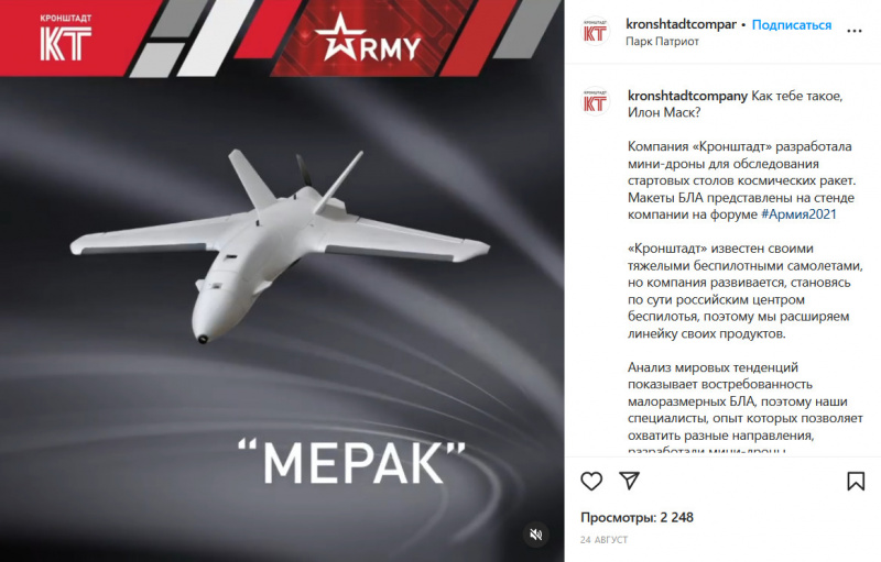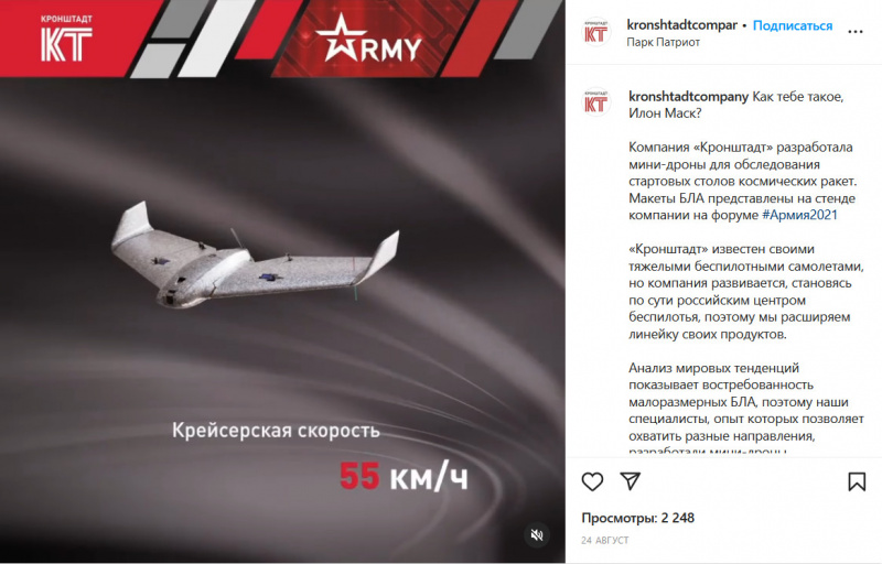 Компания "Кронштадт", которая себя называет "лидером беспилотной индустрии в России", разработала мини-дроны для обследования стартовых столов космических ракет. Макеты БЛА были представлены на стенде компании на форуме "Армия2021", о чем компания и отчиталась в своем Инстаграме, сопроводив это гордым "Как тебе такое, Илон Маск"?!!