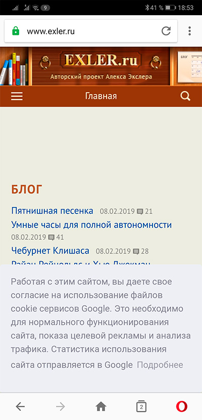 Как убрать сообщение о куках на Exler.ru в мобильной Opera