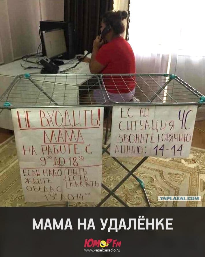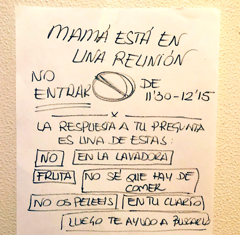 По испанским соцсетям распространяется вот такая картинка, которую мамы, работающие удаленно, вешают на дверь, когда им нужно провести совещание в онлайне. (Я ее увидел вот здесь, у писателя Артуро Переса-Реверте.)