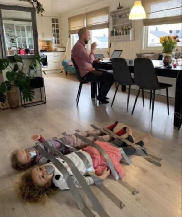Зять на балконе организовал кабинет, садится перед ноутом в рубашке с галстуком и в шортах. И тоже, как в ролике пришёл сын во время видеоконференции и говорит : "Папа, пошли потанцуем".