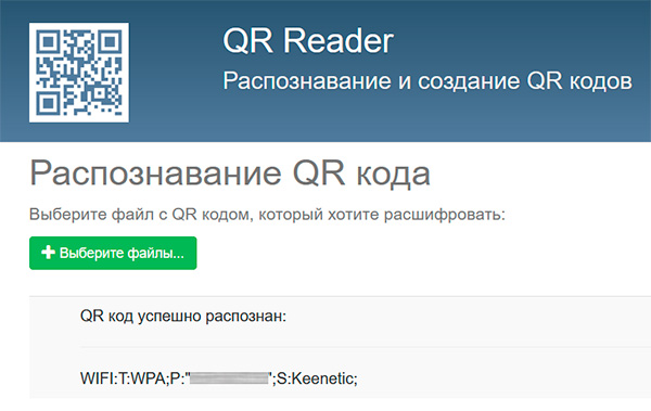 И как, вы спросите, просканировать его тем же смартфоном? А его не нужно сканировать смартфоном, так пароль-то как раз и не узнать. Скриншот с QR-кодом нужно загрузить на какой-нибудь сайт с онлайновым распознаванием - я использовал вот этот.