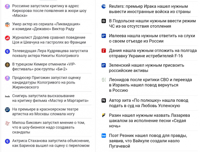 Слева - просто сегодняшняя лента новостей из Дзена. Справа - коллаж читателя, составленный из январских заголовков в ленте новостей. Видимо, ИИ "Сбербанка" генерирует какое-нибудь очередное идиотское словосочетание, вроде "нашел нужным" или "запустил", после чего это пихается во все заголовки. Смотрится феерично совершенно.