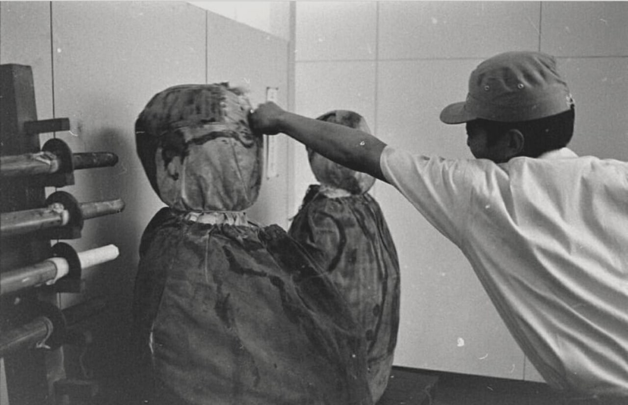 Сотрудники завода Matsusita Electric снимают стресс, избивая манекены в комнате отдыха, Япония, 1964 г.