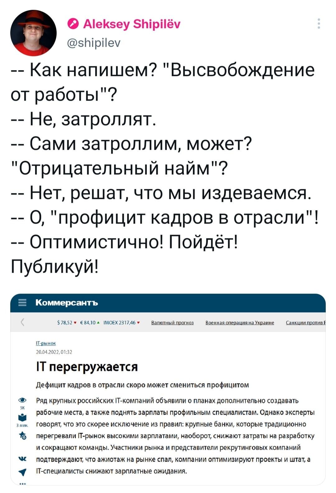 Из-за массового ухода иностранных компаний и из-за кучи проблем у российских компаний, у которых оборвались все цепочки поставок, работу потеряли и потеряют огромное количество людей. Но родина их не бросит. Всем помогут.