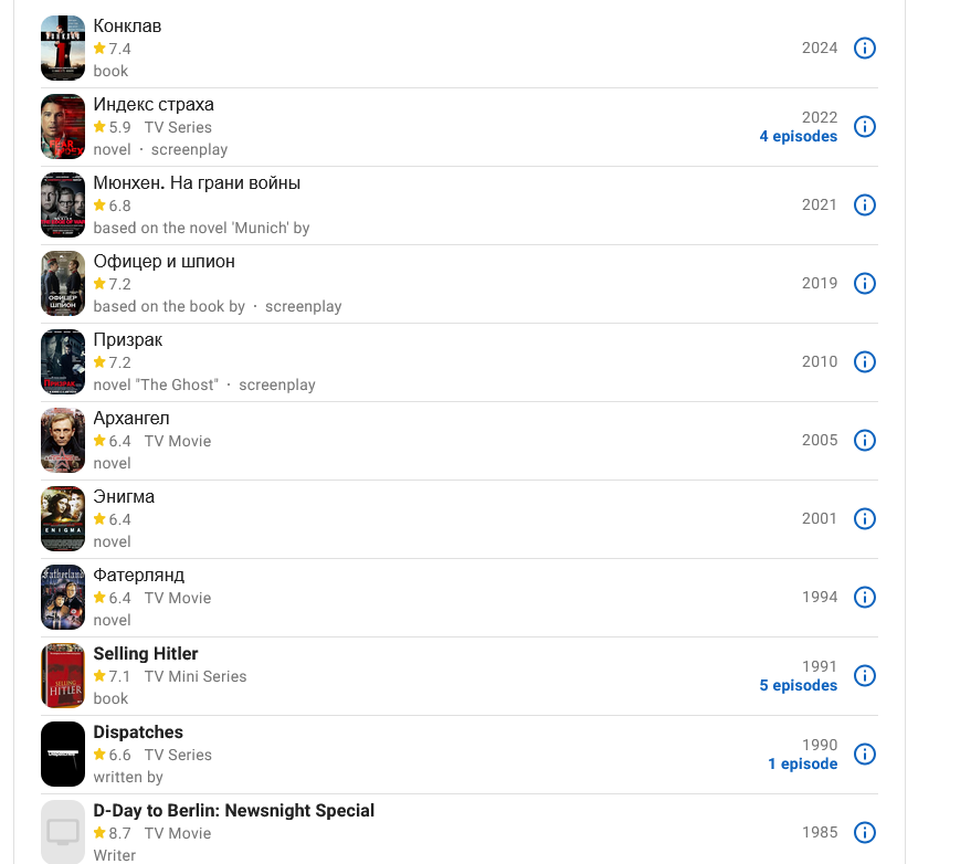 Теперь у нас действительно полный список фильмов по произведениям Роберта Харриса. Надеюсь, это поможет. Вы уже читали какие-то из этих книг или смотрели фильмы?