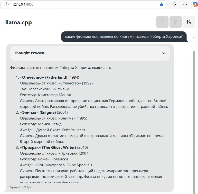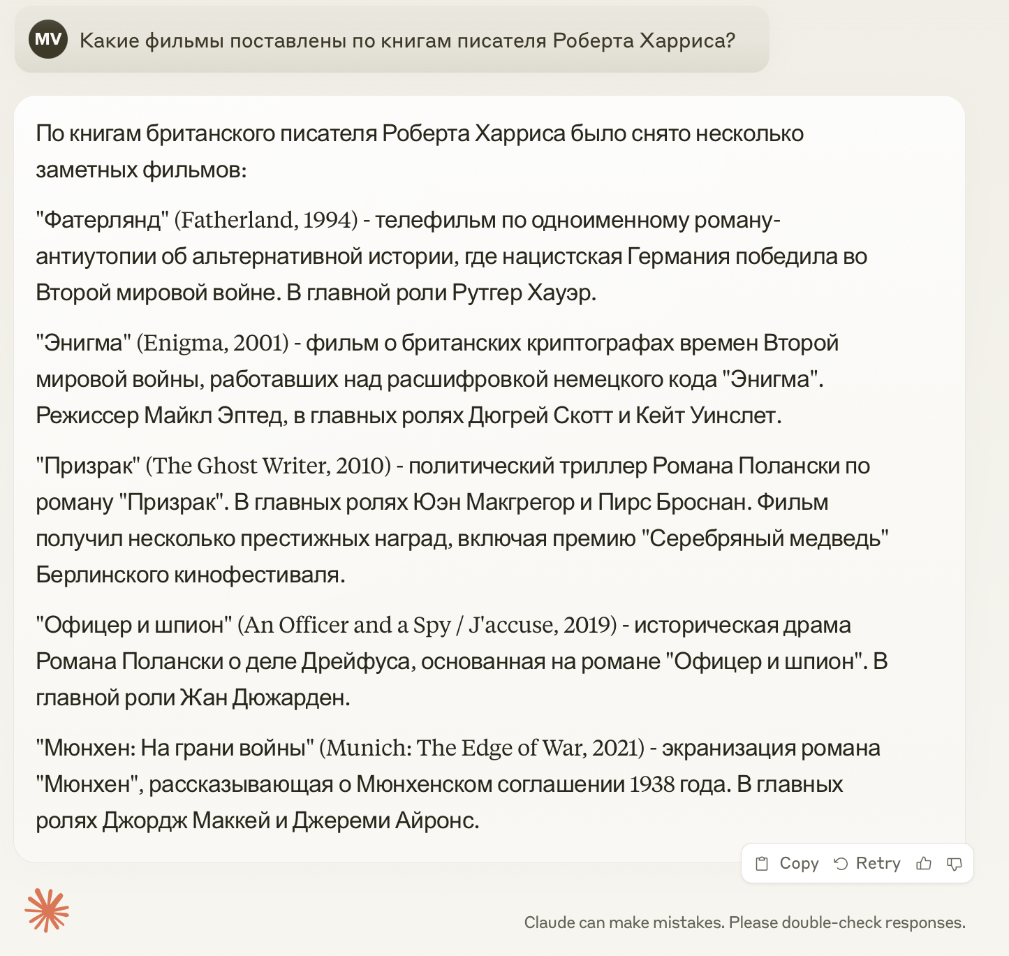 Например, спрашиваю модель ChatGPT-4o mini (которая, дескать, быстрая и подходит для большинства запросов) о том, какие фильмы поставлены по книгам писателя Роберта Харриса.