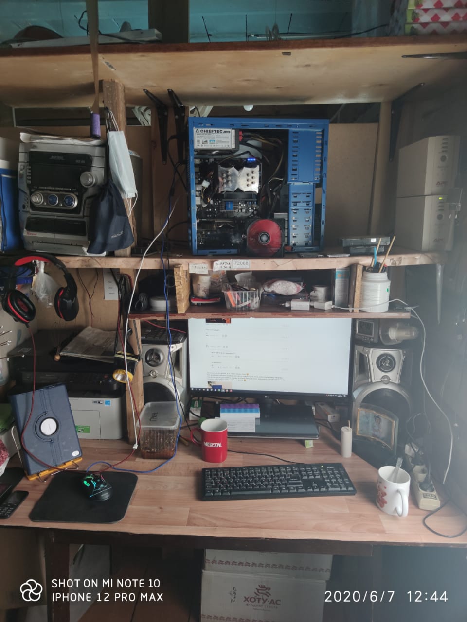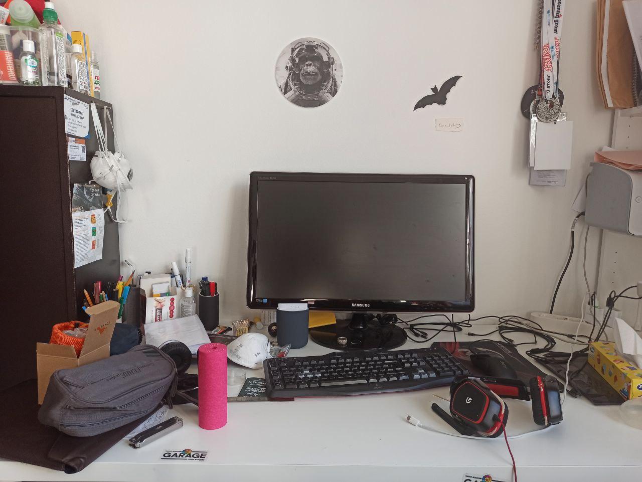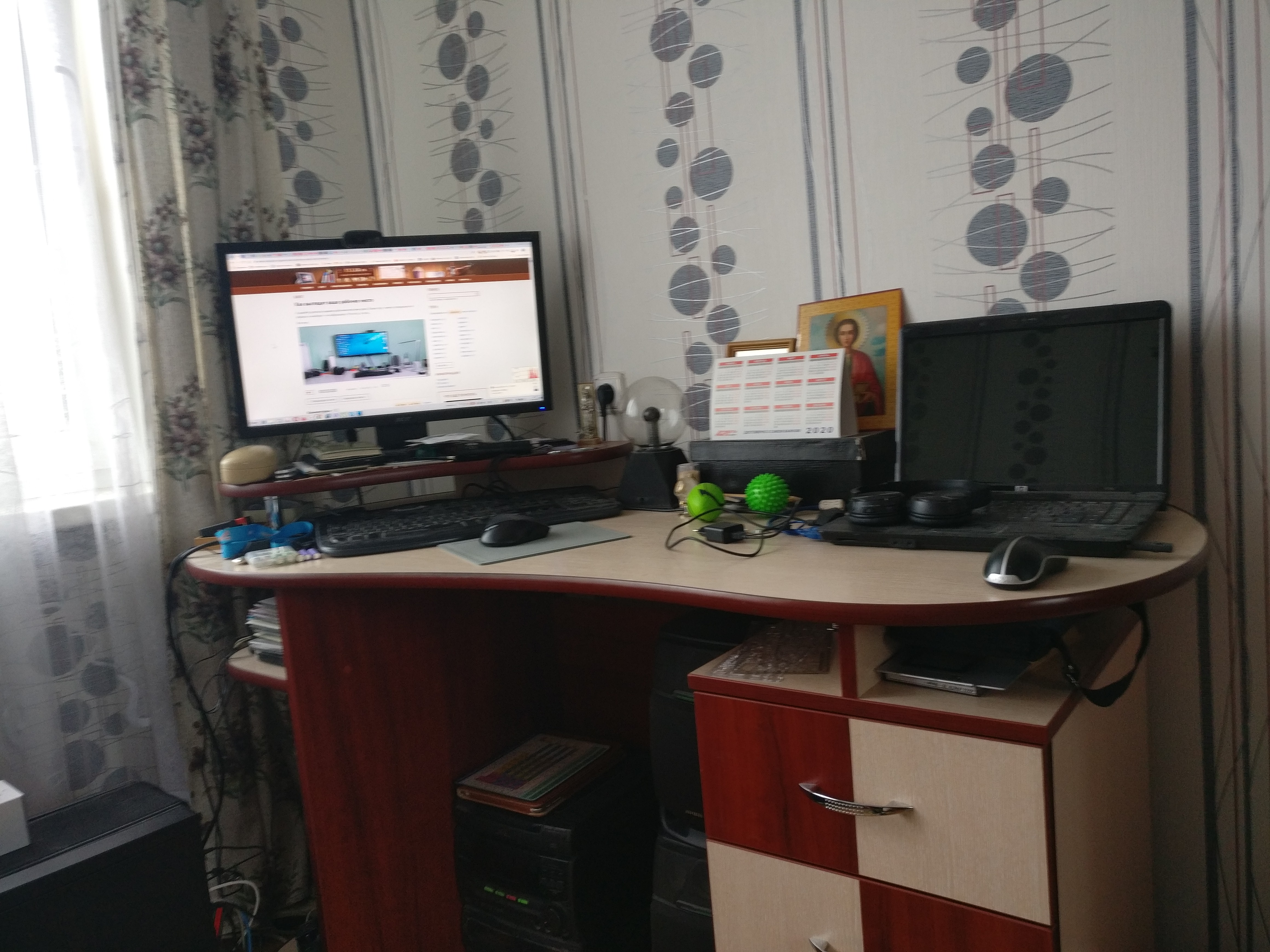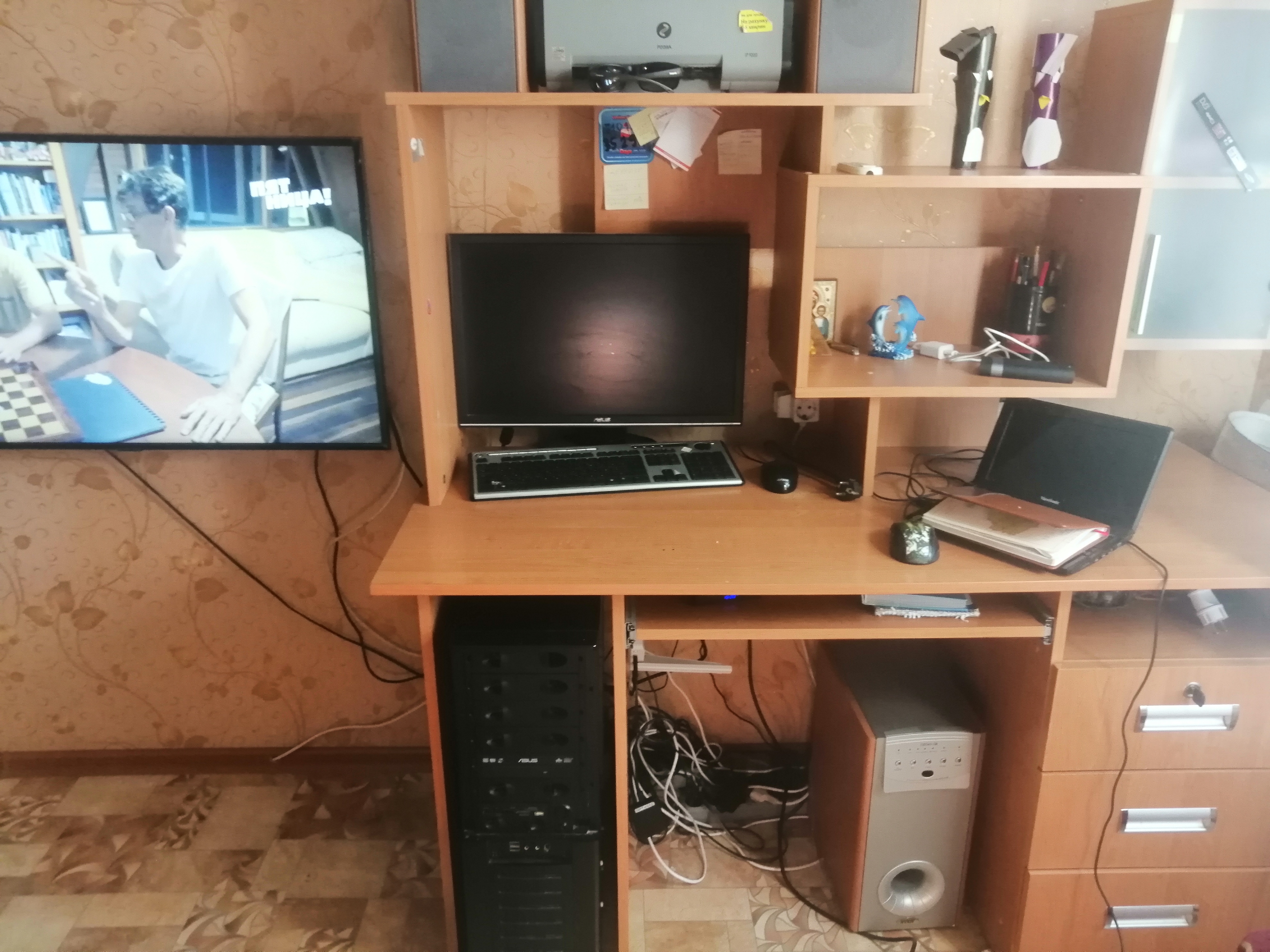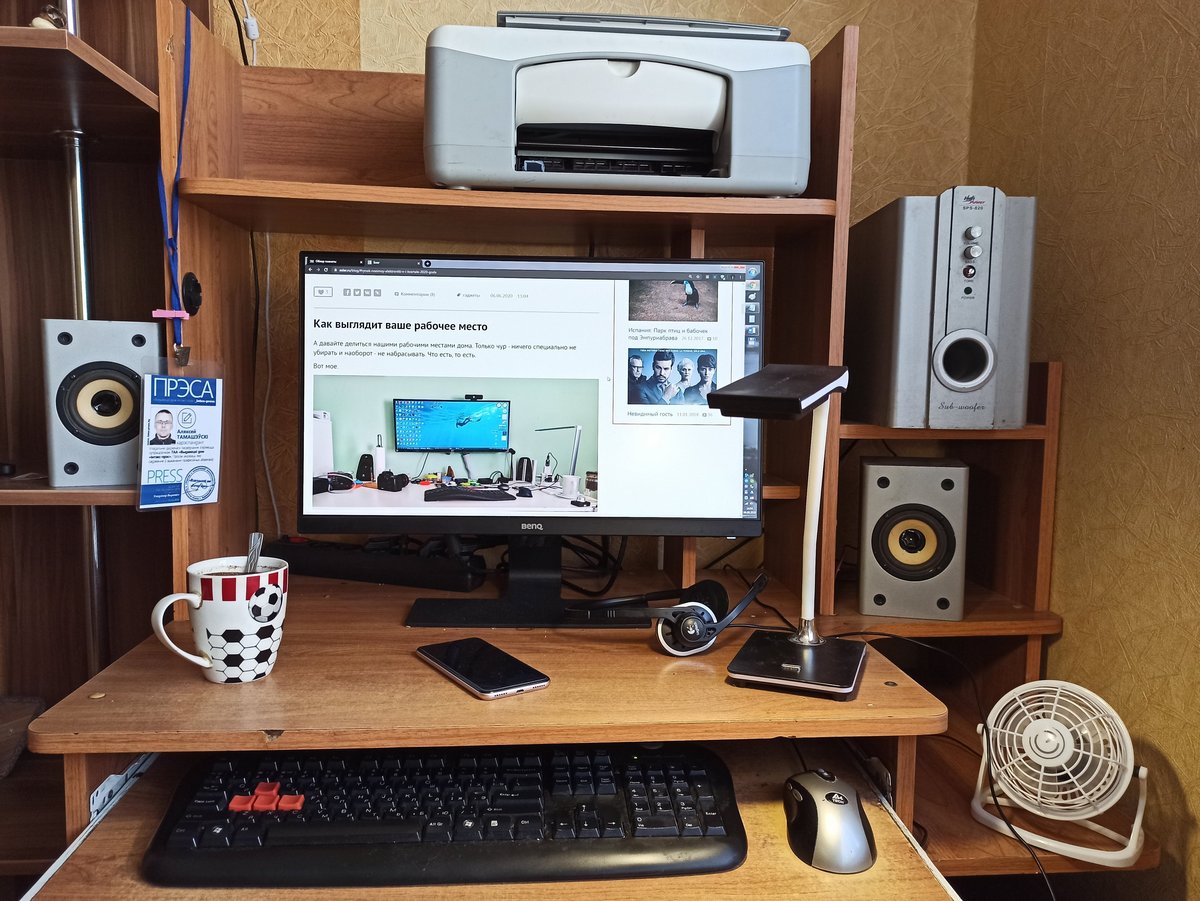 Под монитором ноутбук, слева - мёд гречичный в контейнере, две кружки, в одной кофе, в другой вода, компу уже лет 10, а его корпусу лет 20. Слева рядом с муз.центром висит тонометр японский. Возраст заставляет контролировать давление 😄