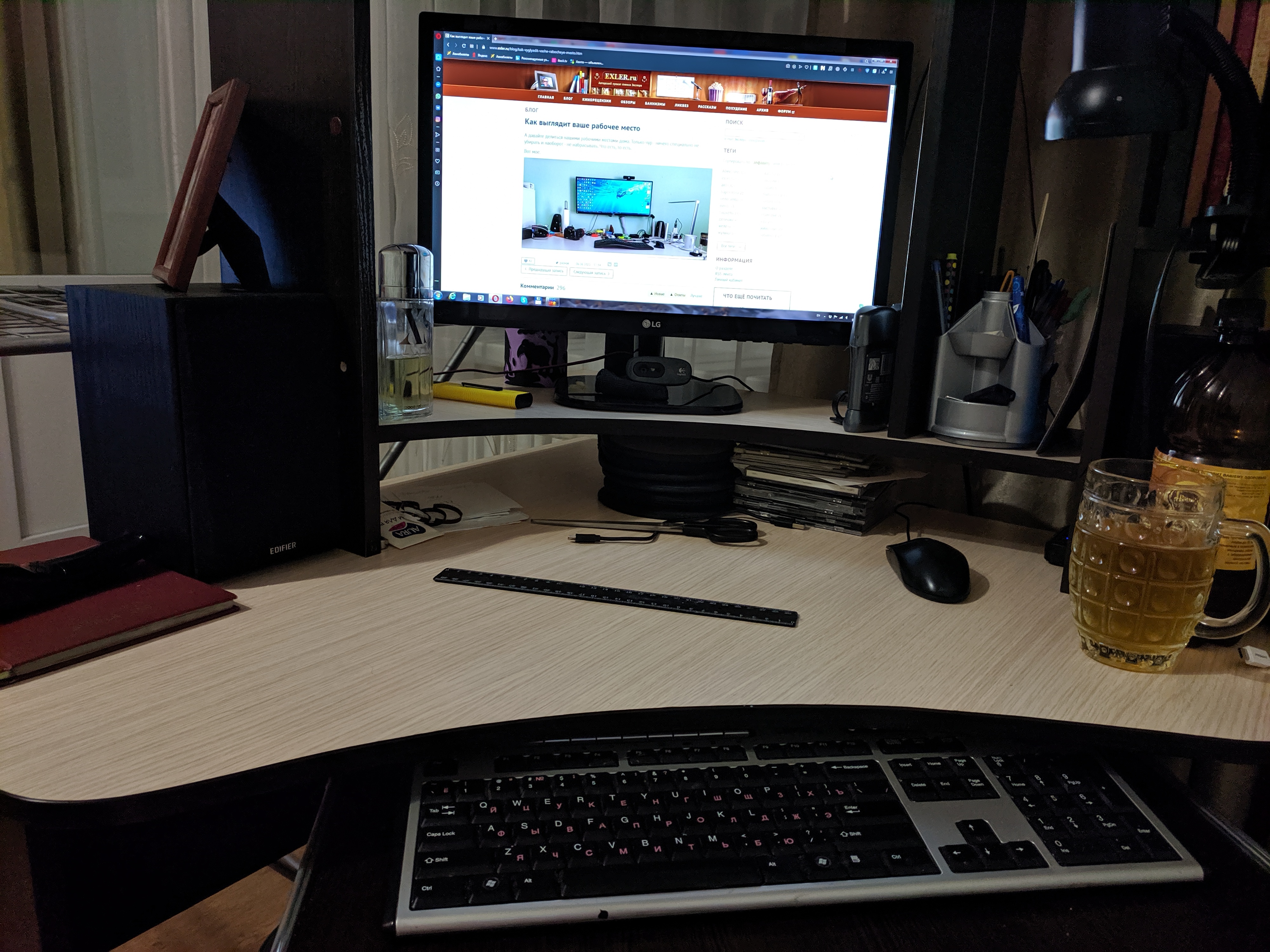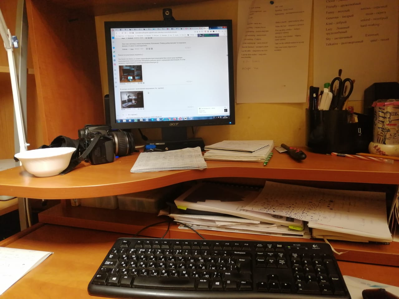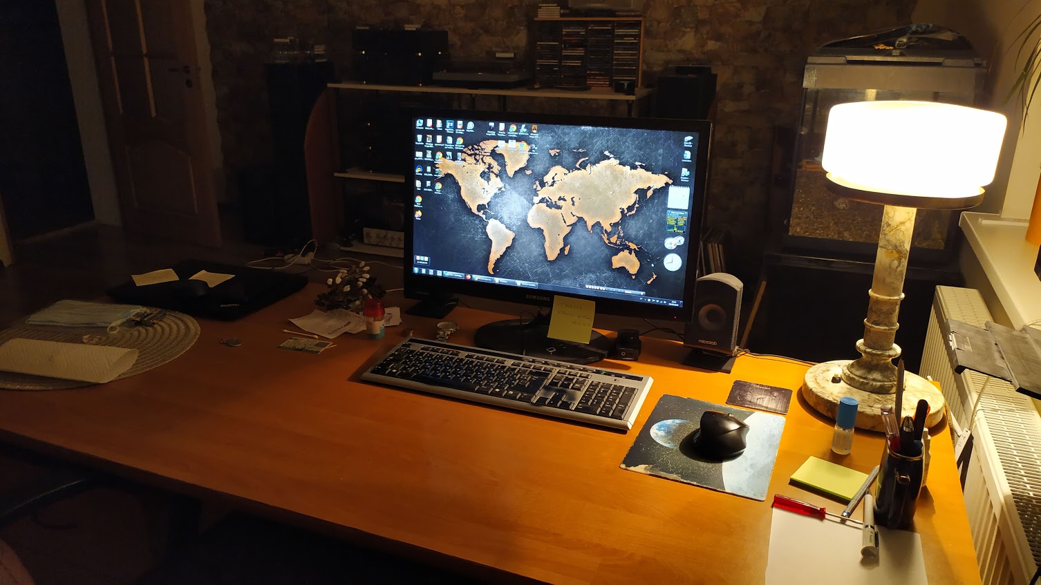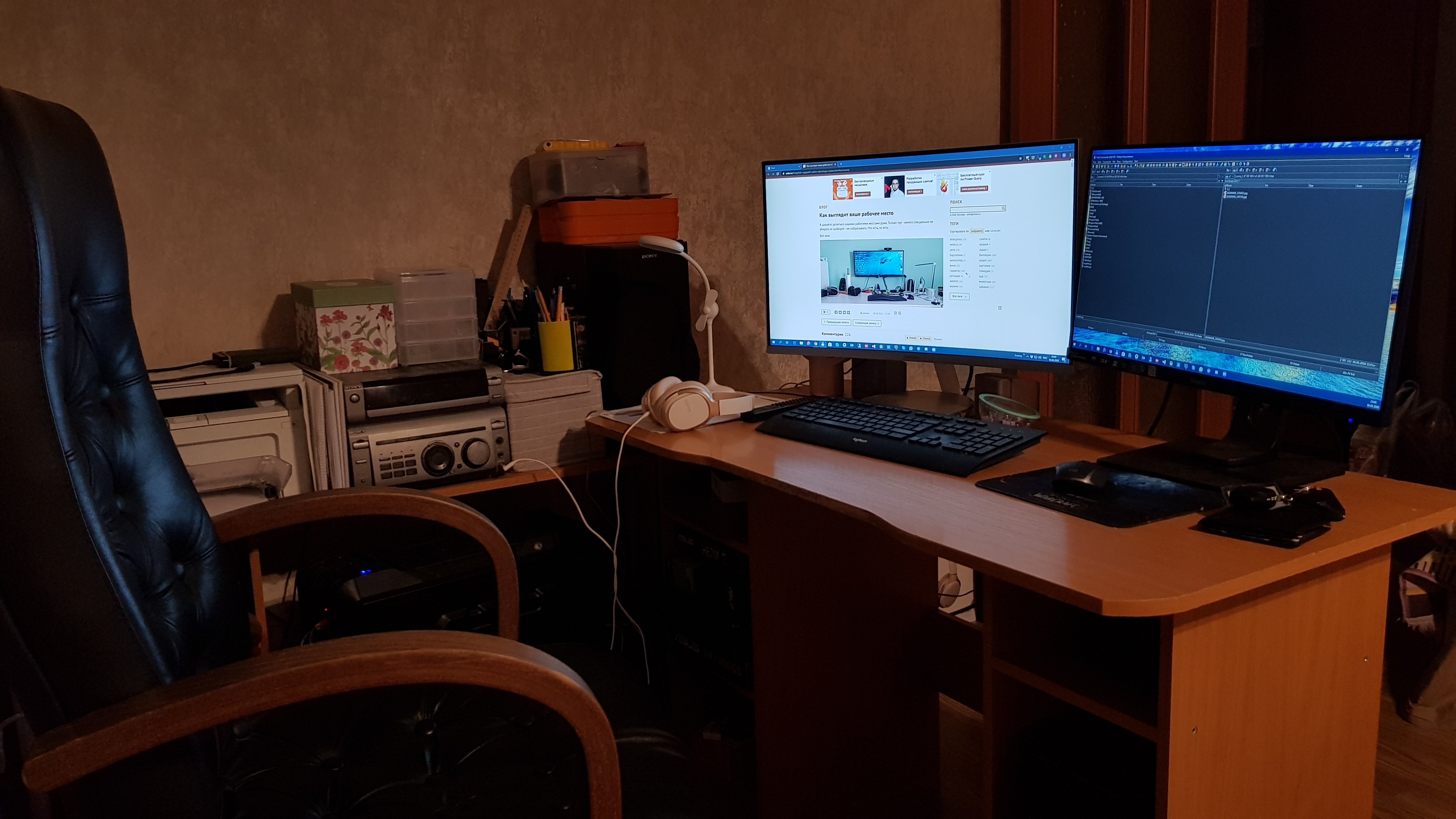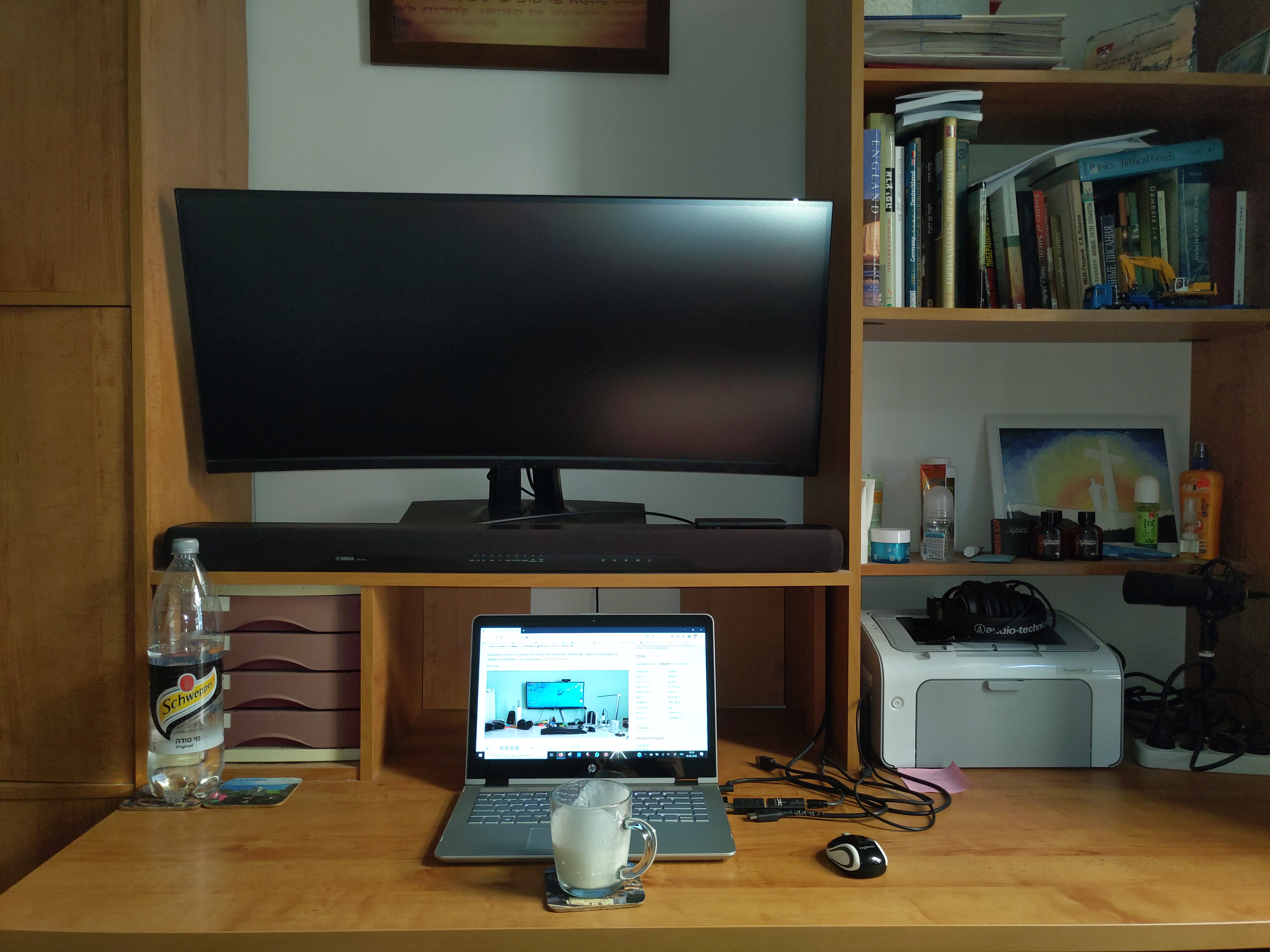 Под монитором ноутбук, слева - мёд гречичный в контейнере, две кружки, в одной кофе, в другой вода, компу уже лет 10, а его корпусу лет 20. Слева рядом с муз.центром висит тонометр японский. Возраст заставляет контролировать давление 😄