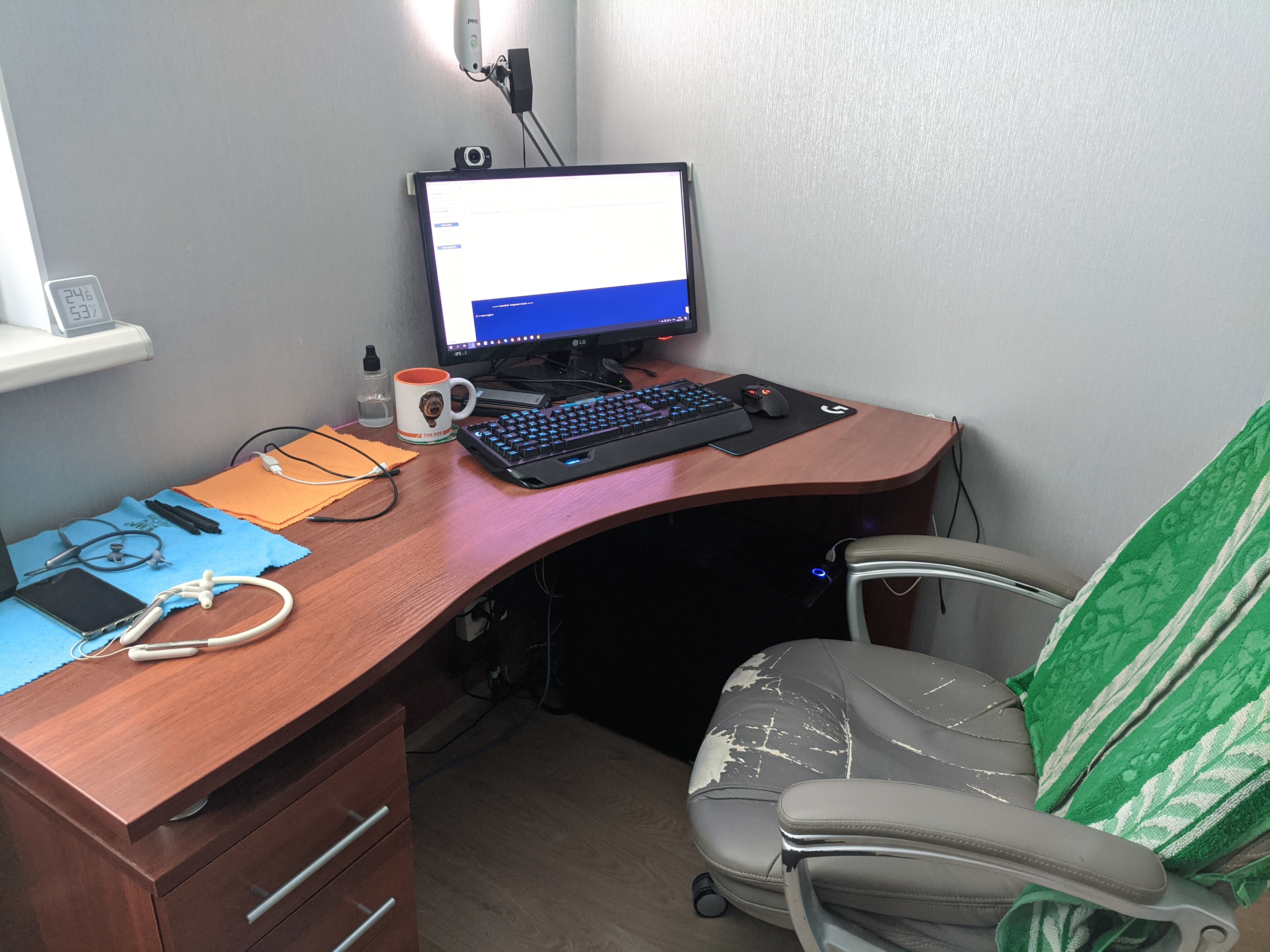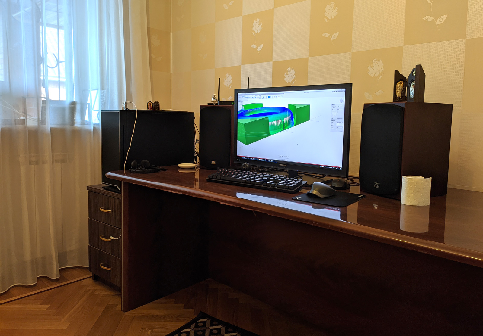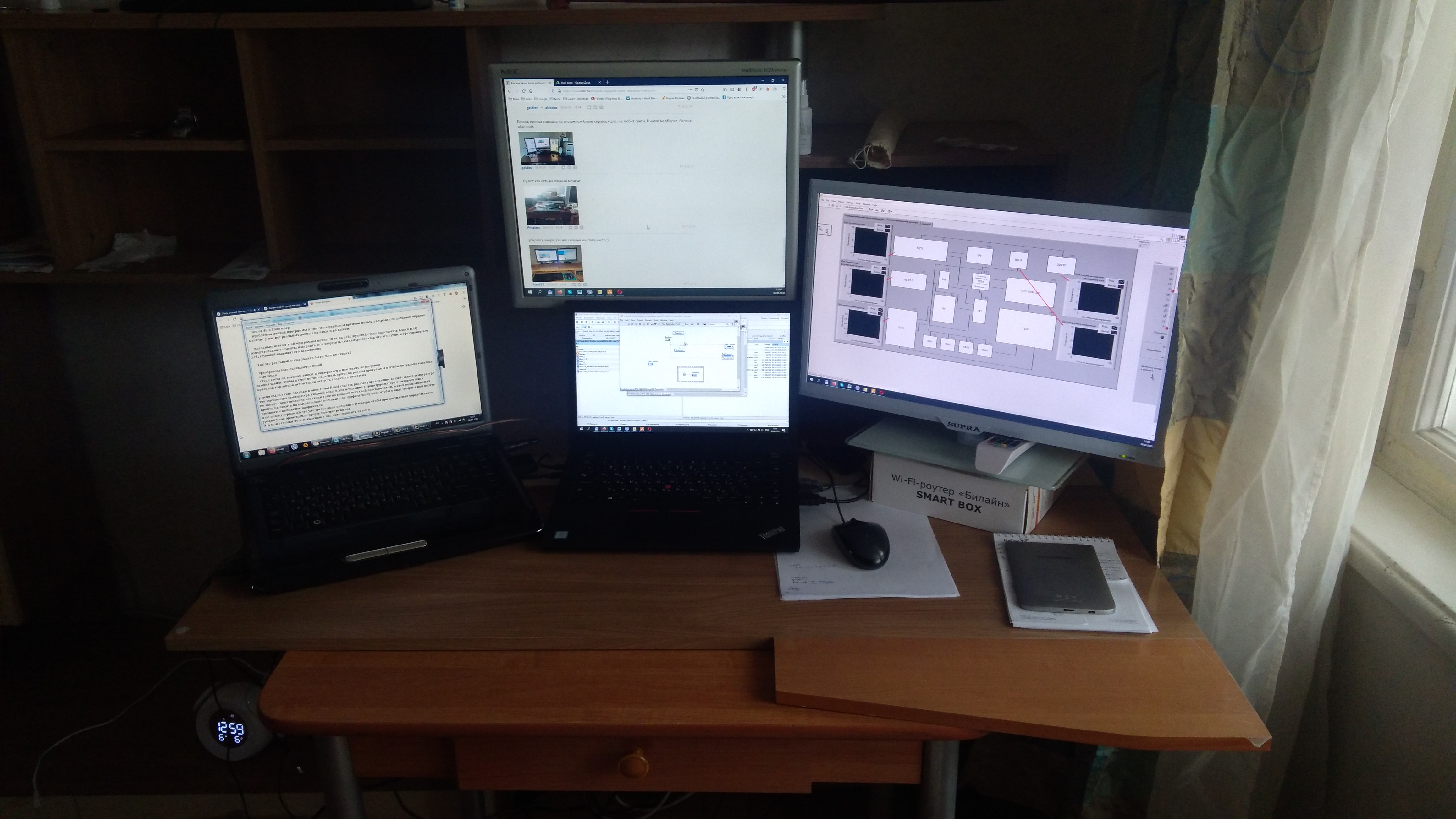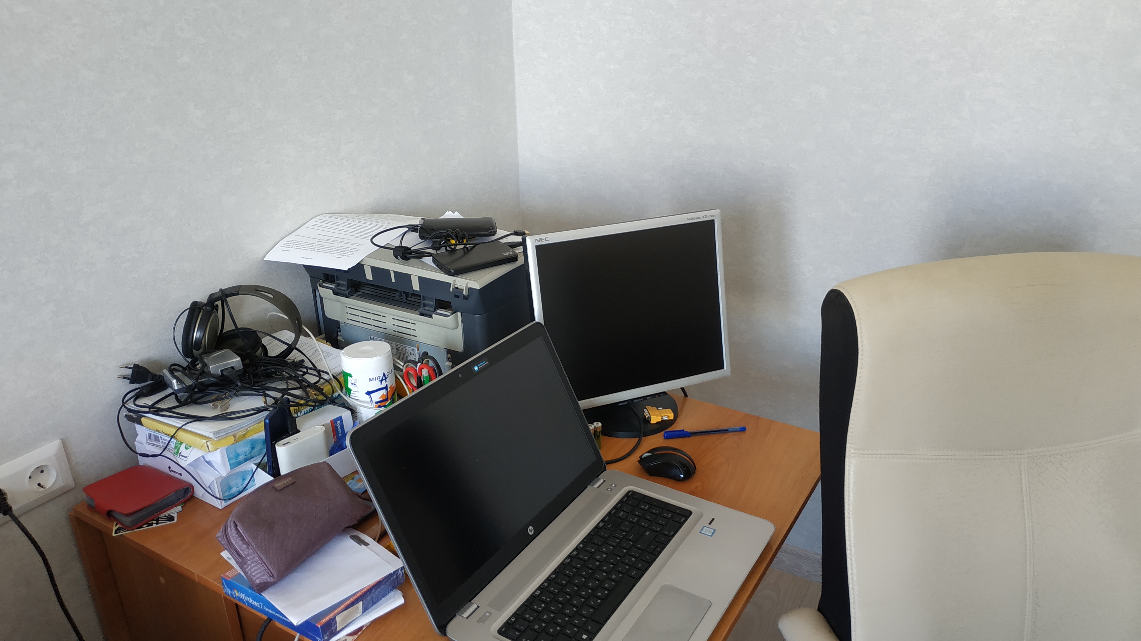 Под монитором ноутбук, слева - мёд гречичный в контейнере, две кружки, в одной кофе, в другой вода, компу уже лет 10, а его корпусу лет 20. Слева рядом с муз.центром висит тонометр японский. Возраст заставляет контролировать давление 😄