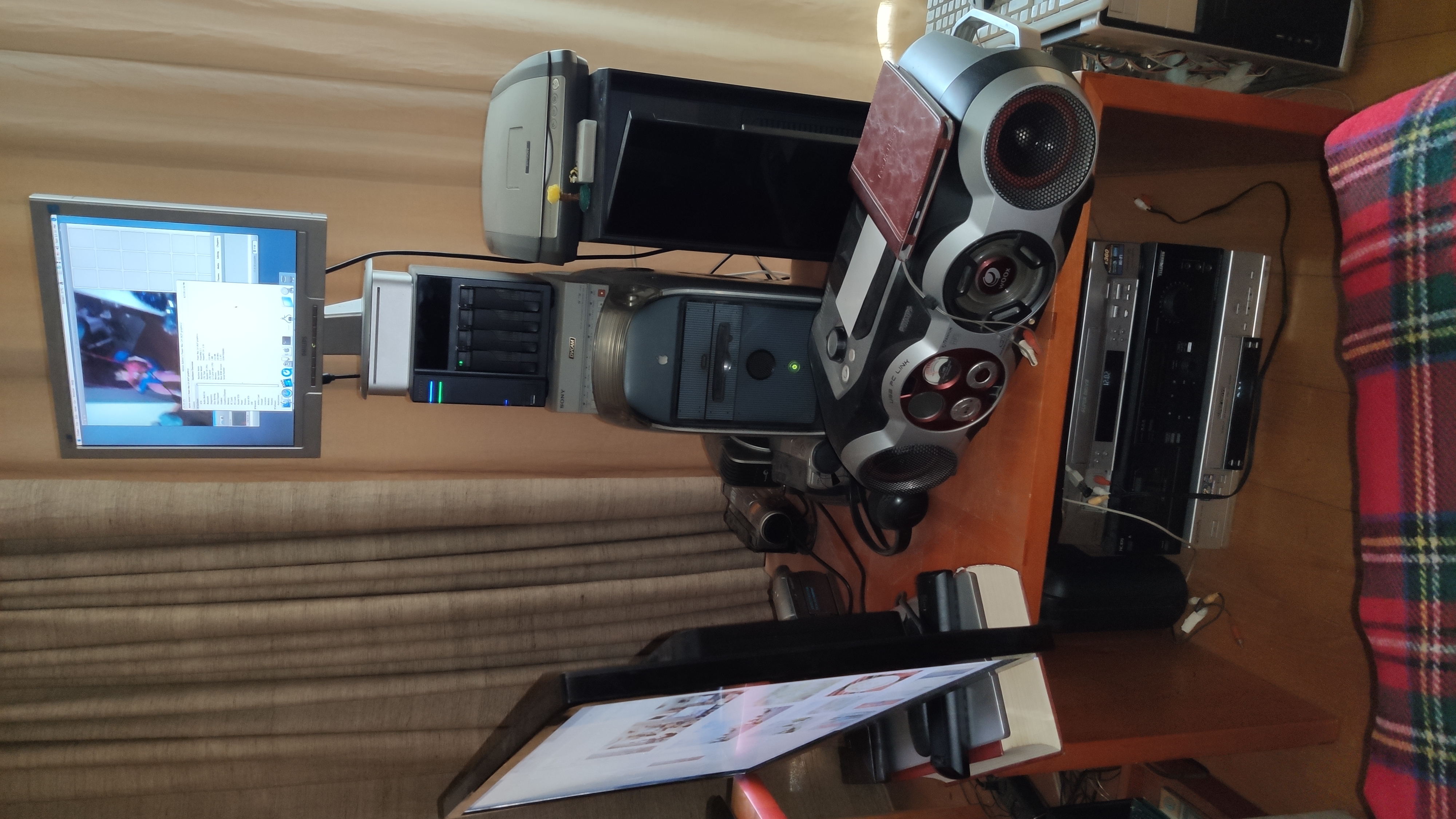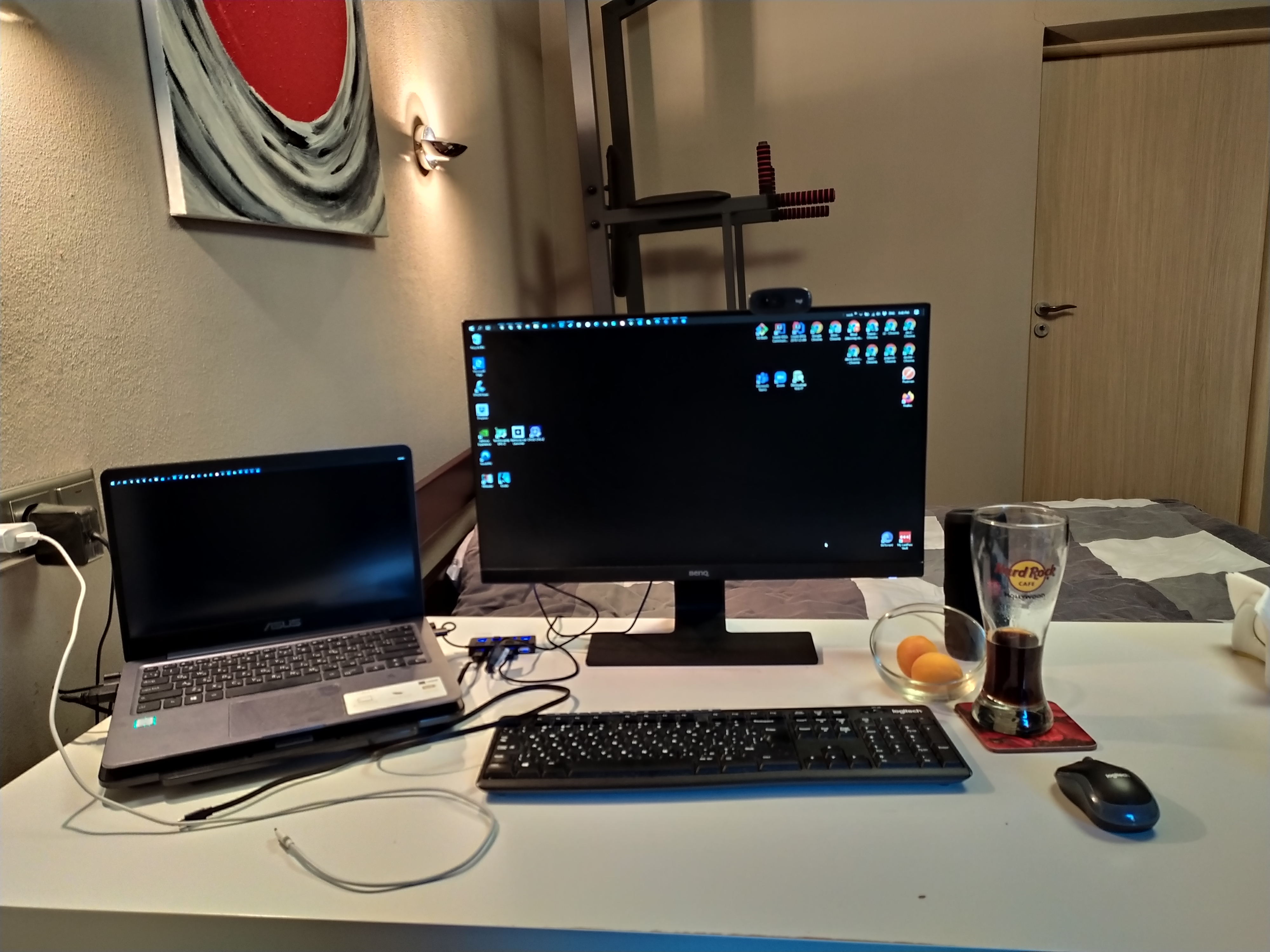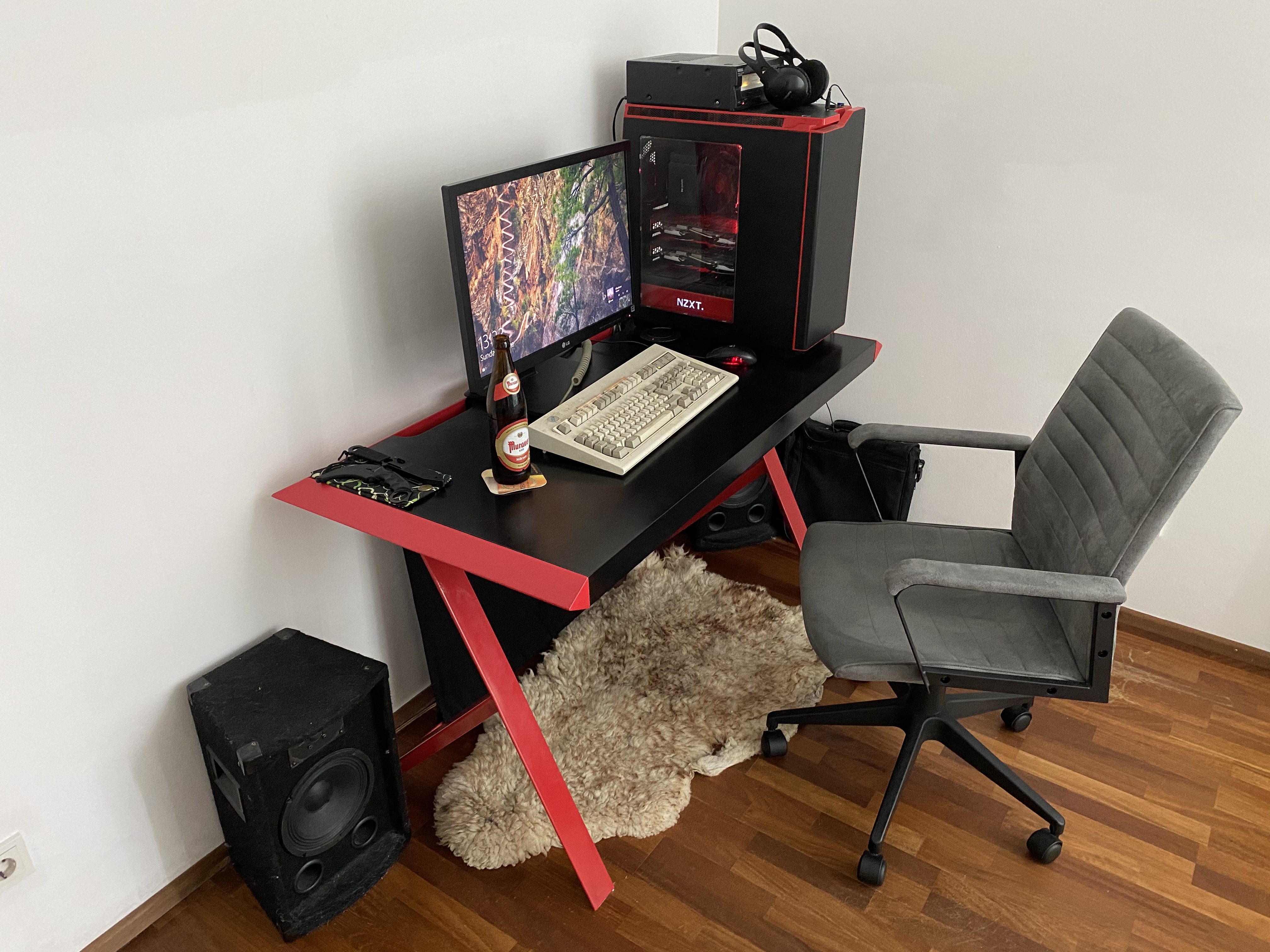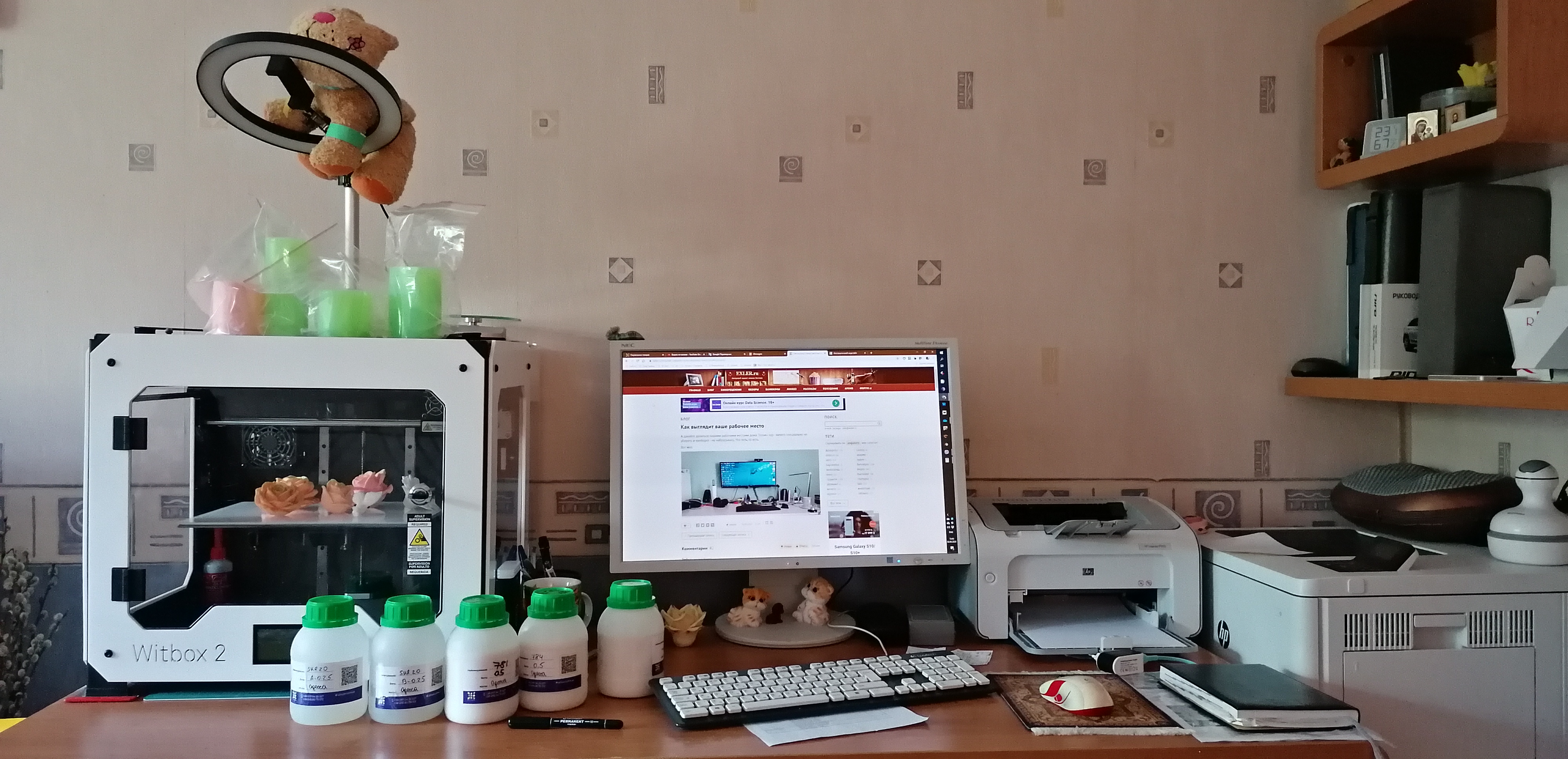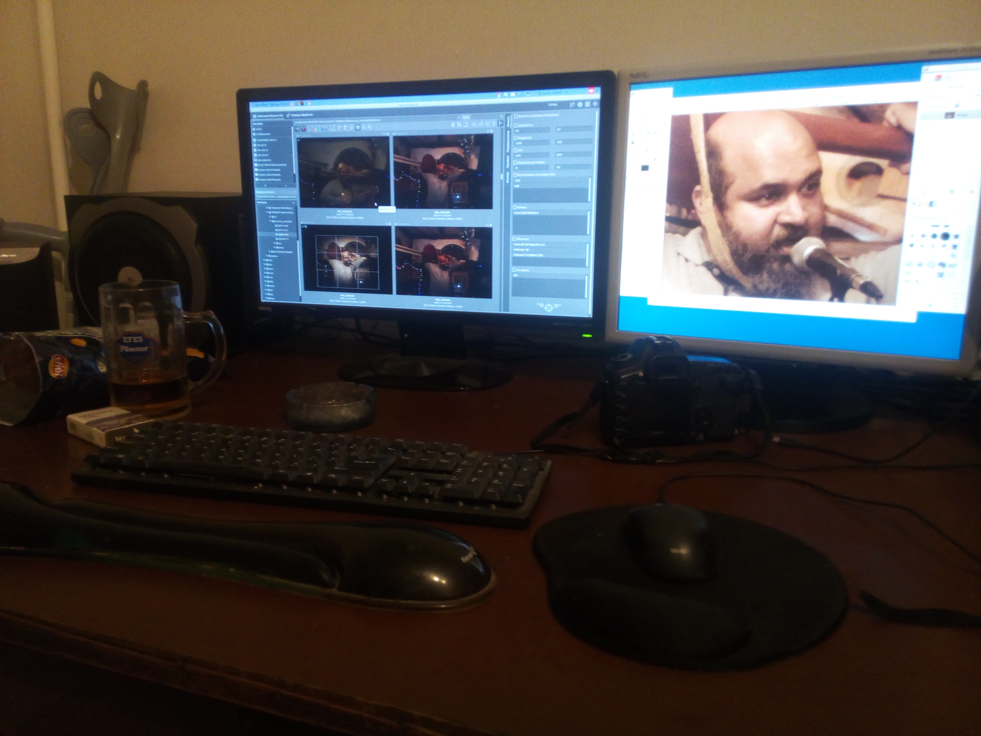 Под монитором ноутбук, слева - мёд гречичный в контейнере, две кружки, в одной кофе, в другой вода, компу уже лет 10, а его корпусу лет 20. Слева рядом с муз.центром висит тонометр японский. Возраст заставляет контролировать давление 😄