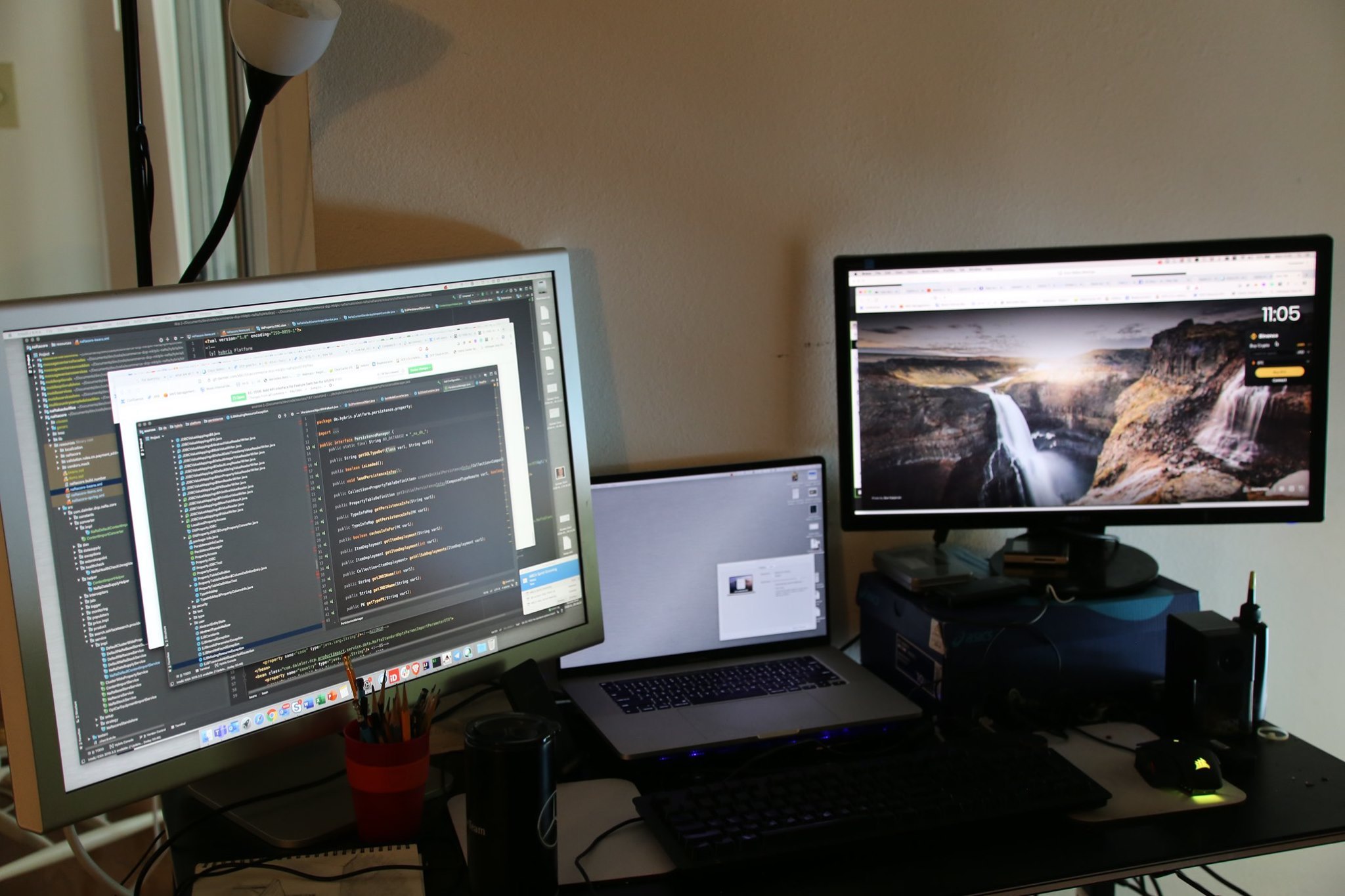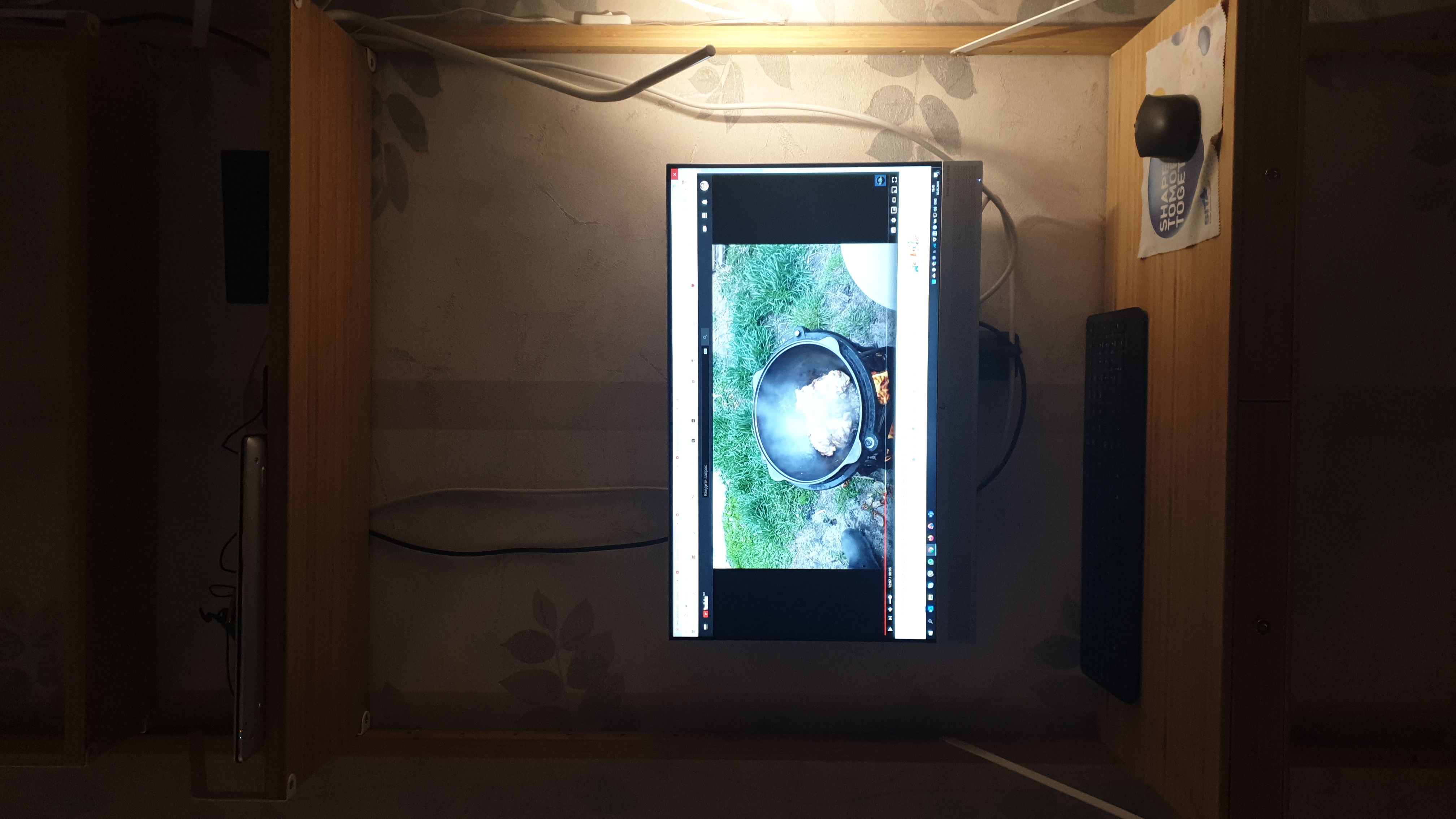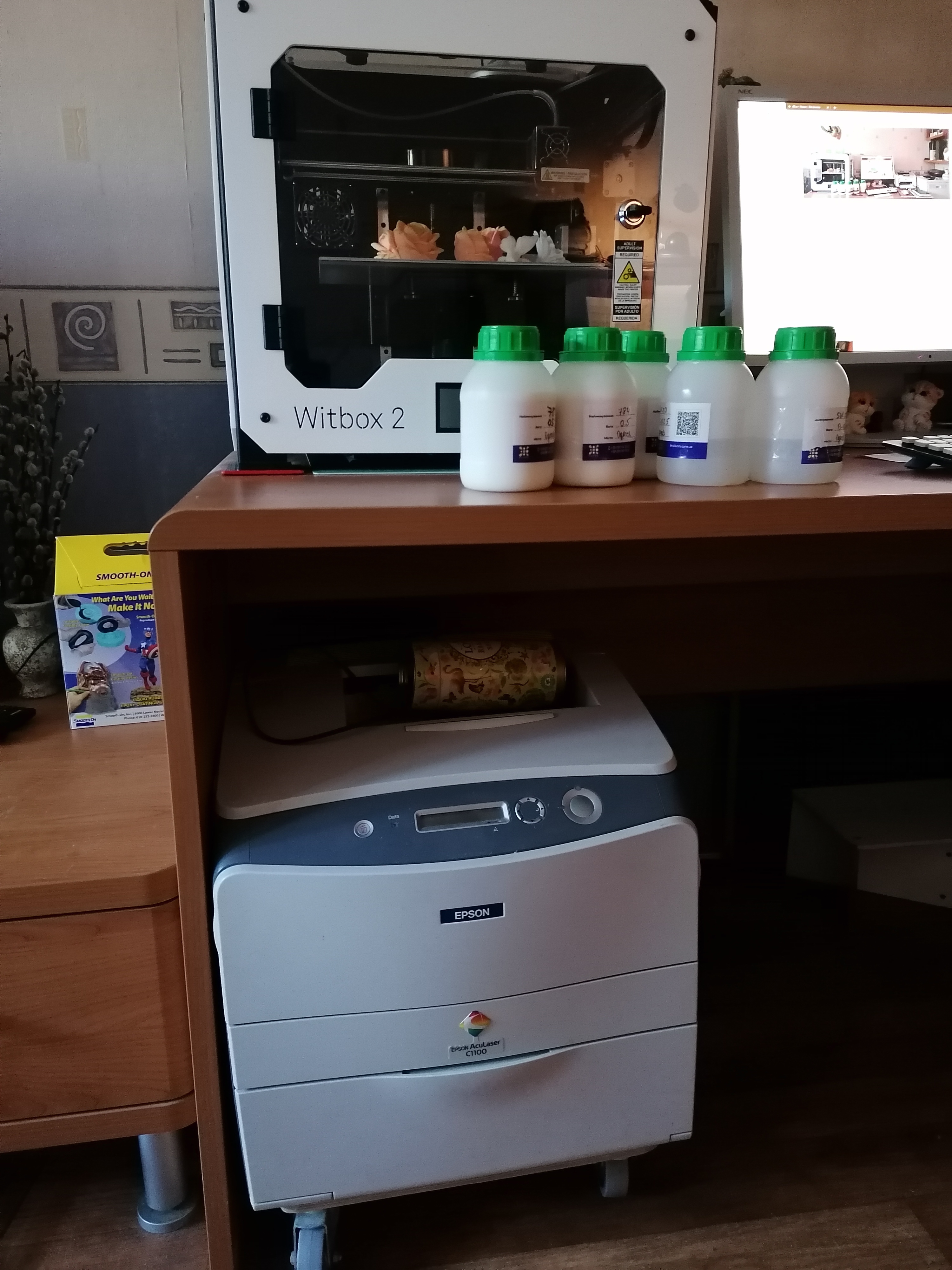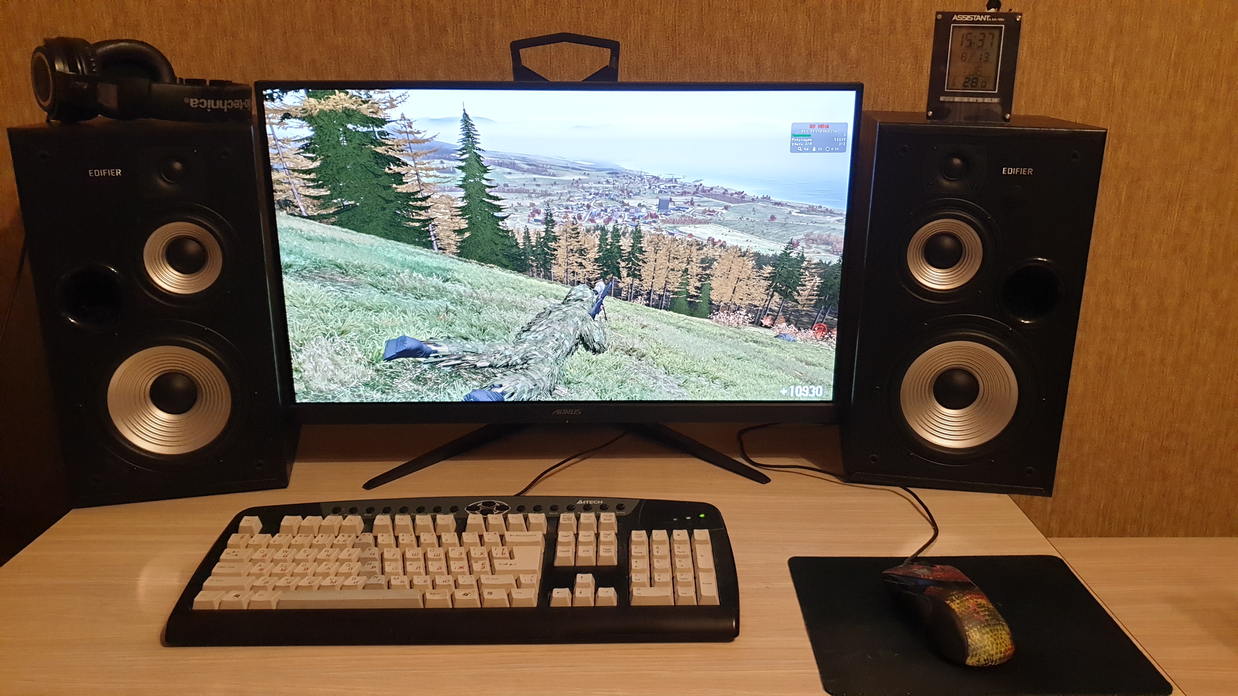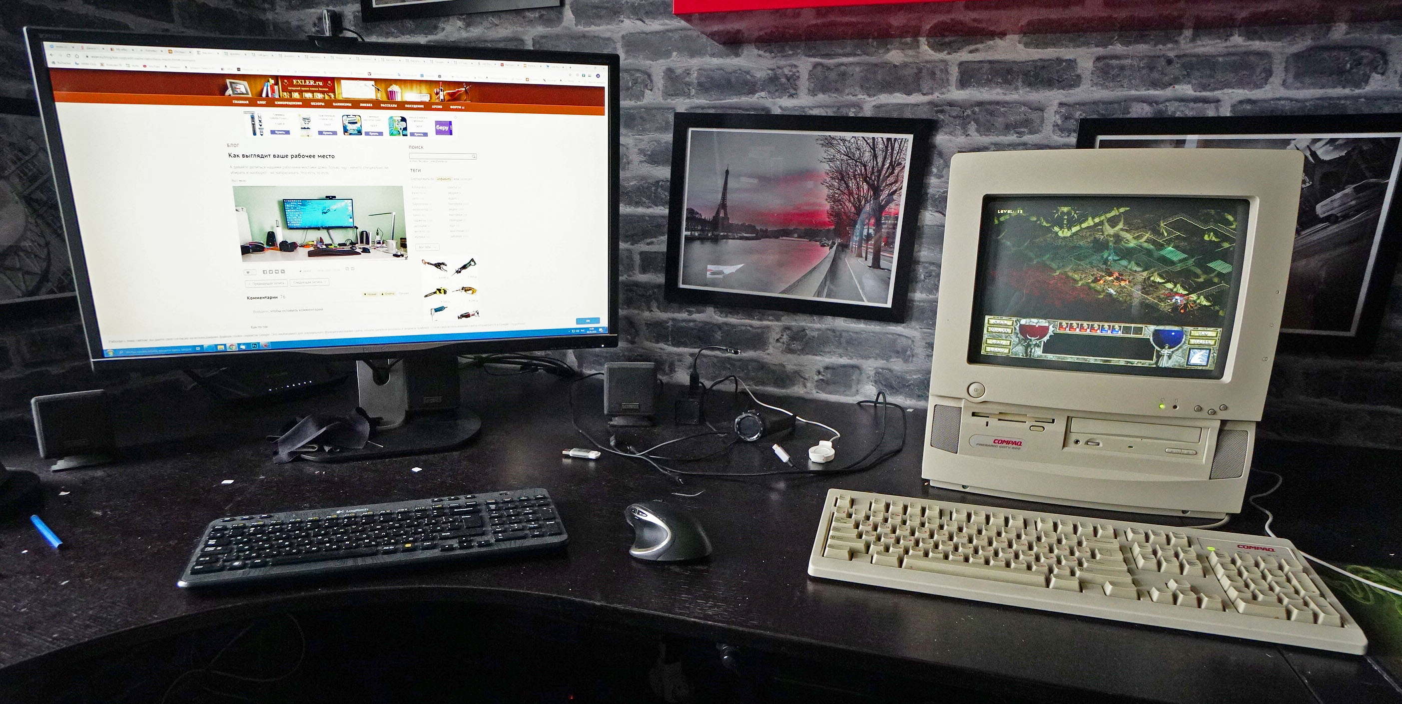 Под монитором ноутбук, слева - мёд гречичный в контейнере, две кружки, в одной кофе, в другой вода, компу уже лет 10, а его корпусу лет 20. Слева рядом с муз.центром висит тонометр японский. Возраст заставляет контролировать давление 😄