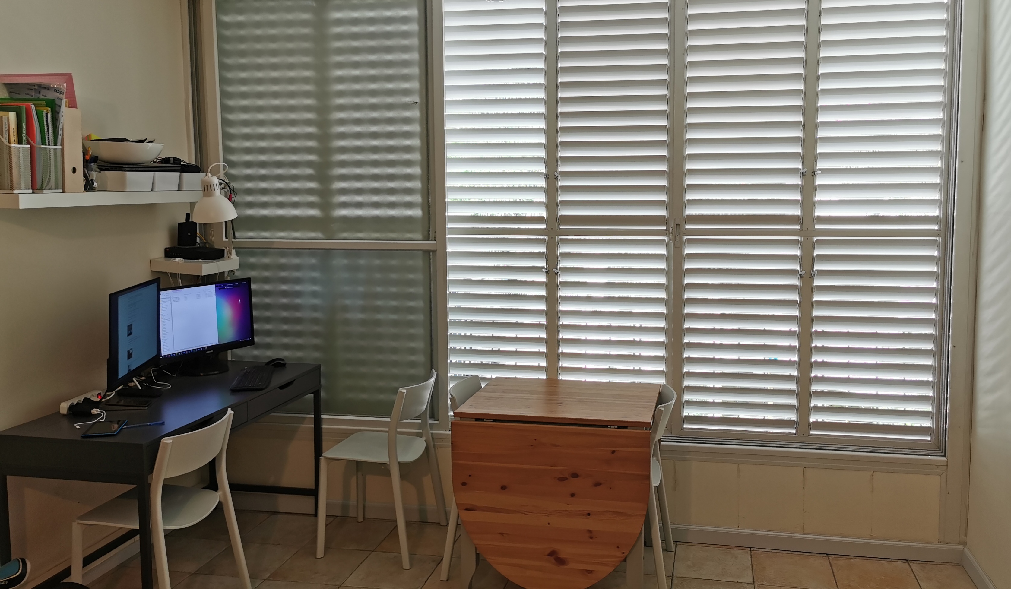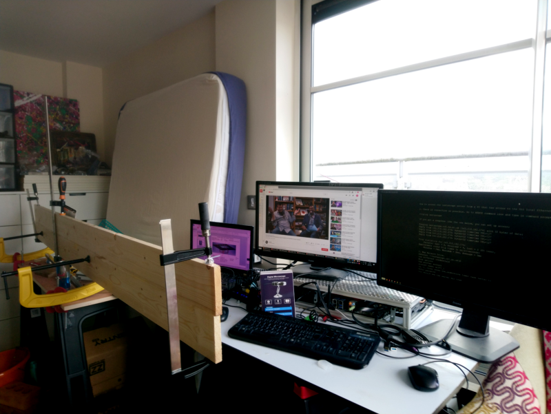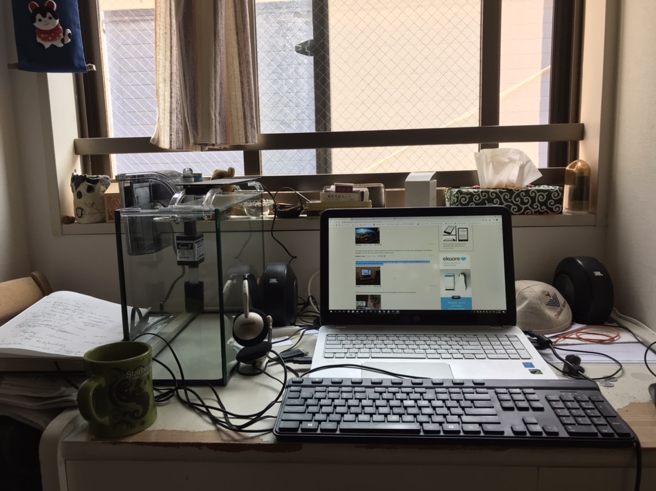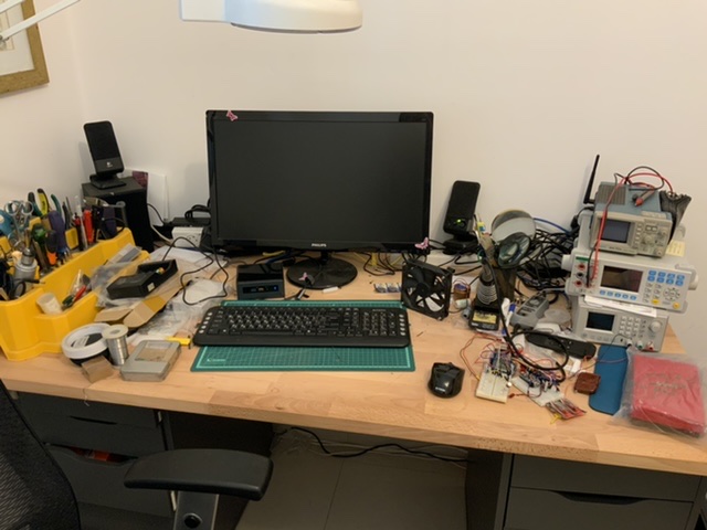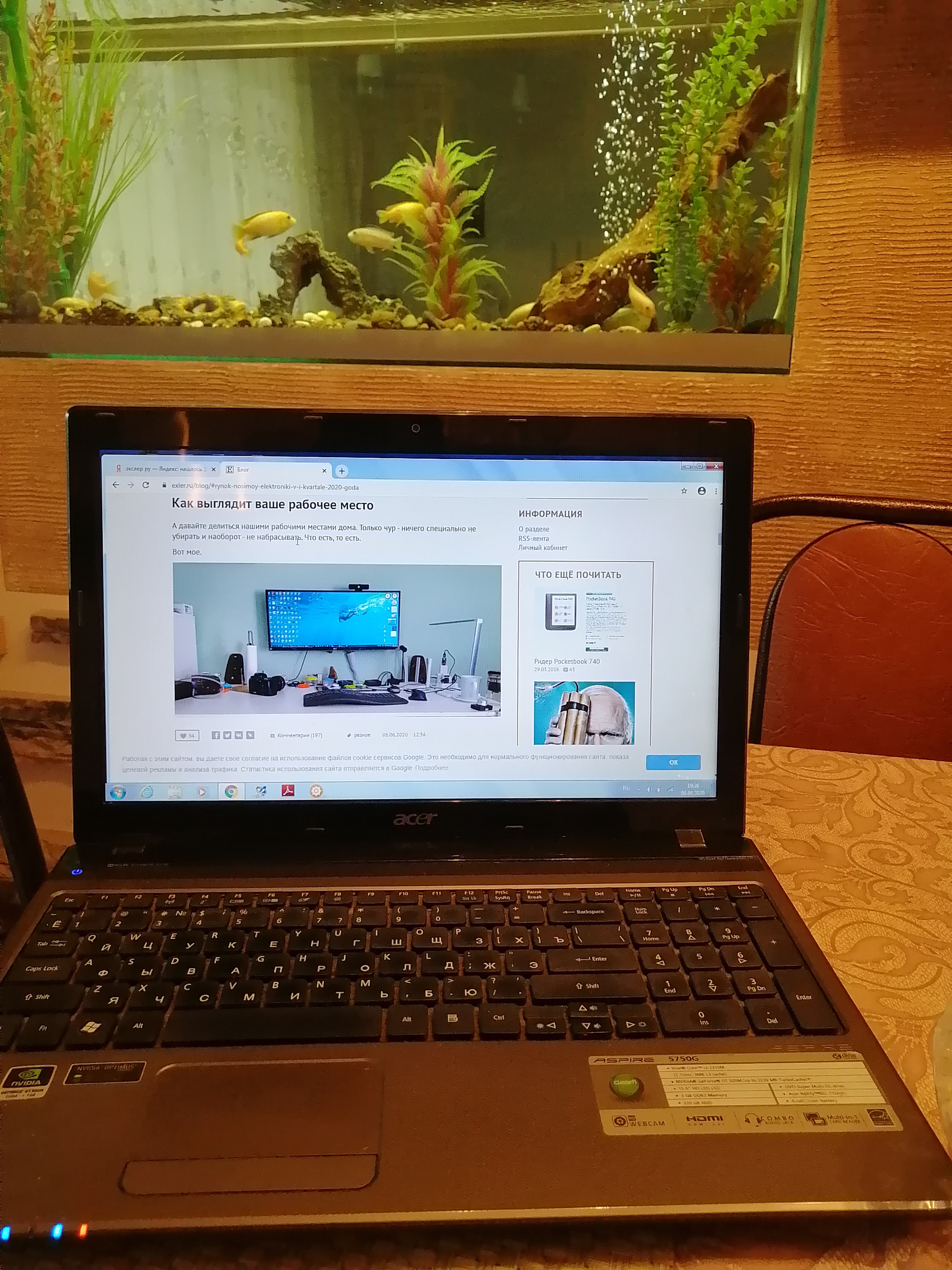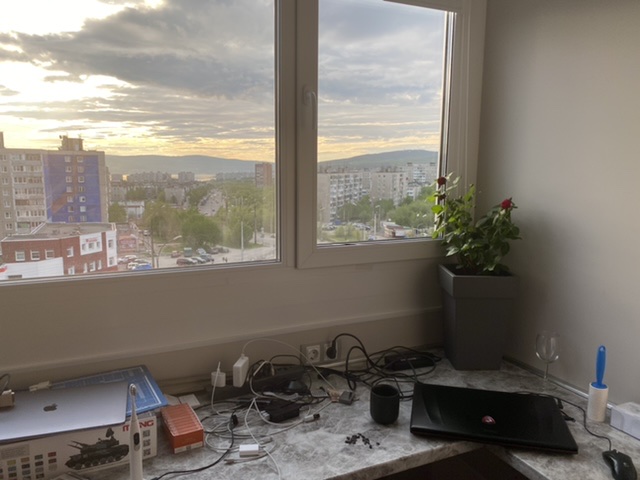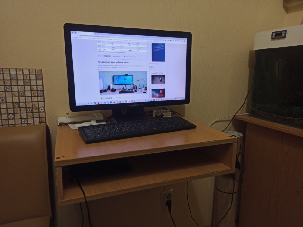 Работаю из офиса - там все платы и пристойные машины. Из дома - телеконференции и по мелочам что-нибудь посчитать. Так что вот такой закуток. Аквариум только что купил и поставил, но он ещё пустой - аквариумные магазины были закрыты из-за пандемии.