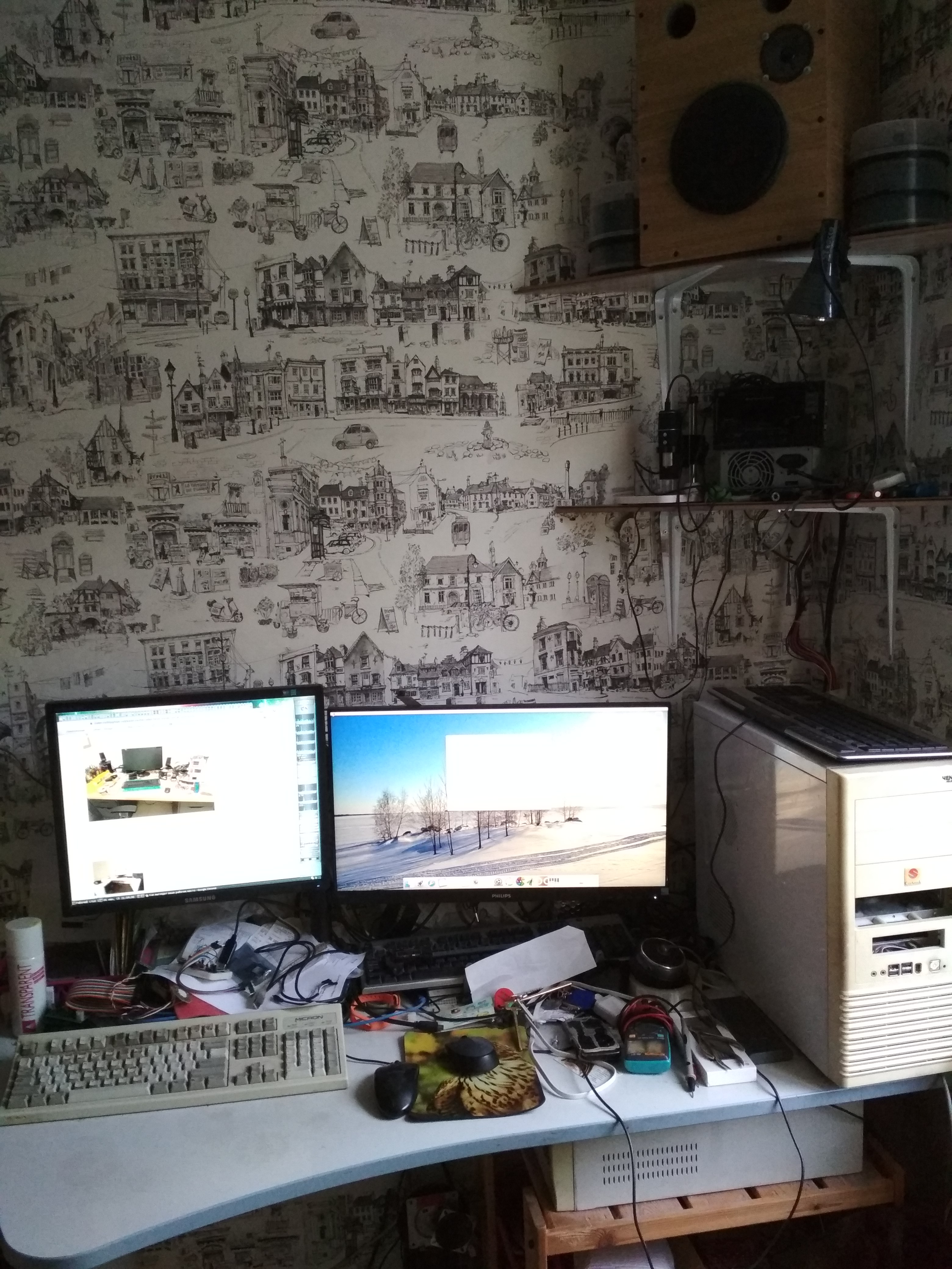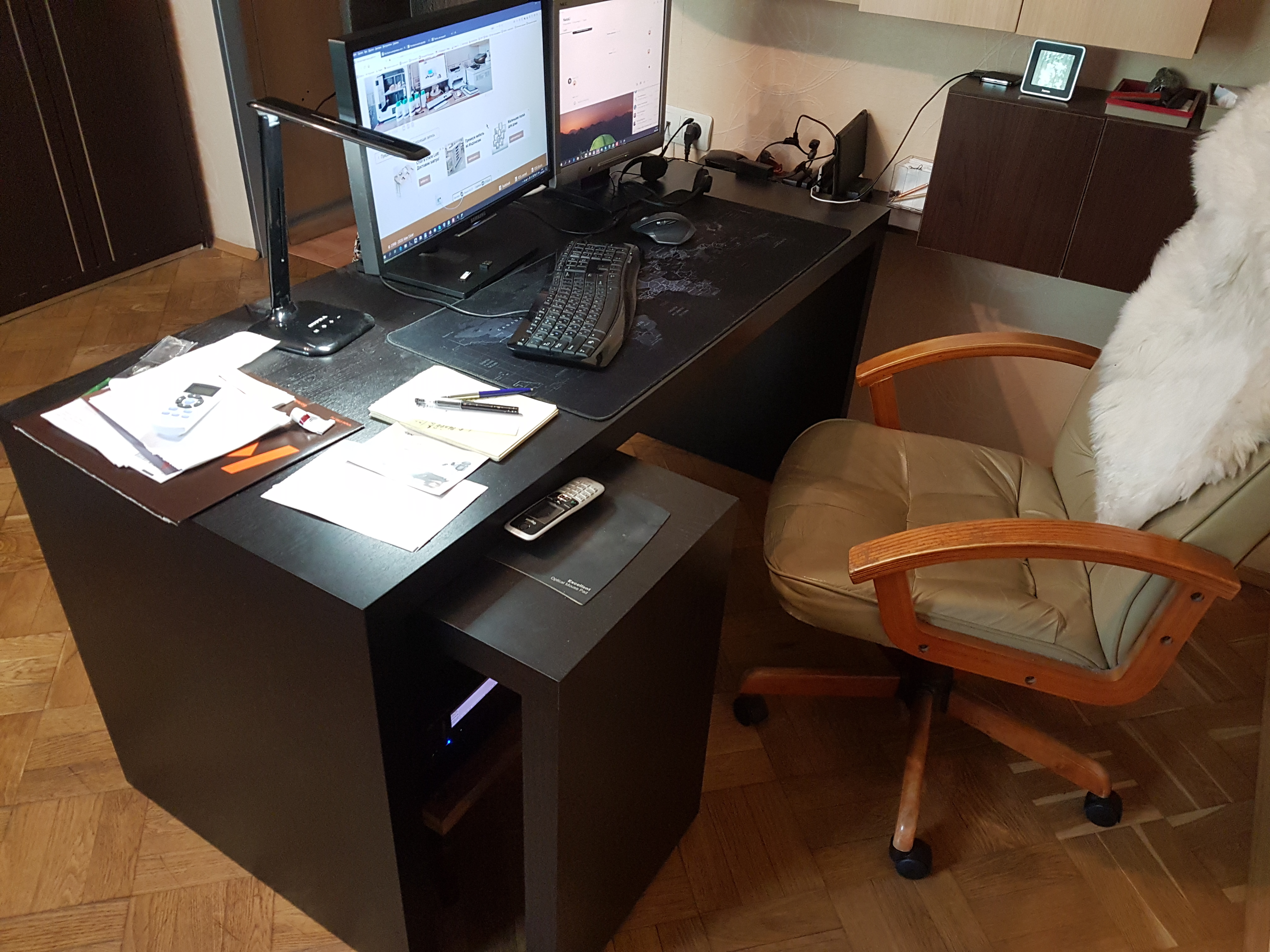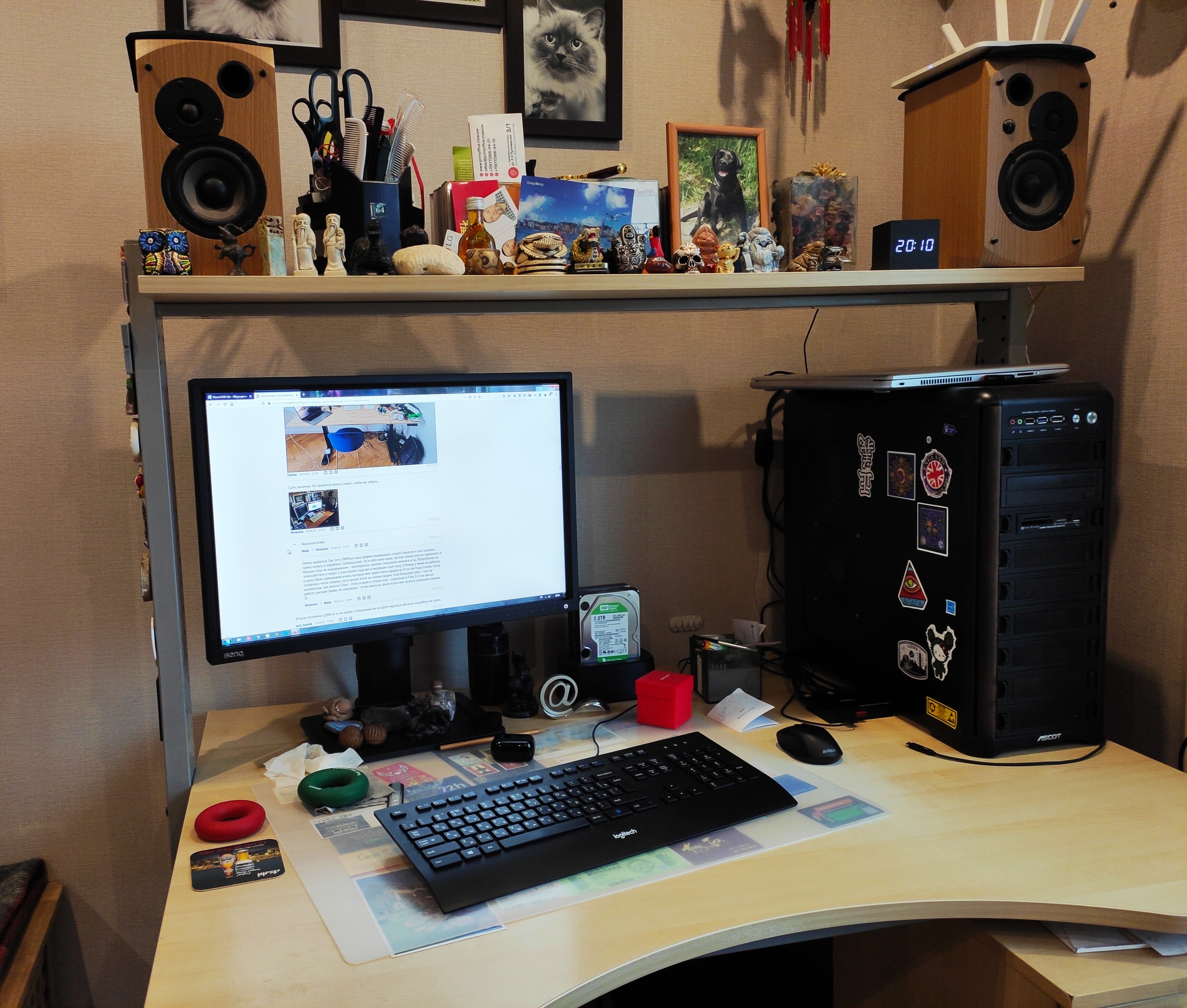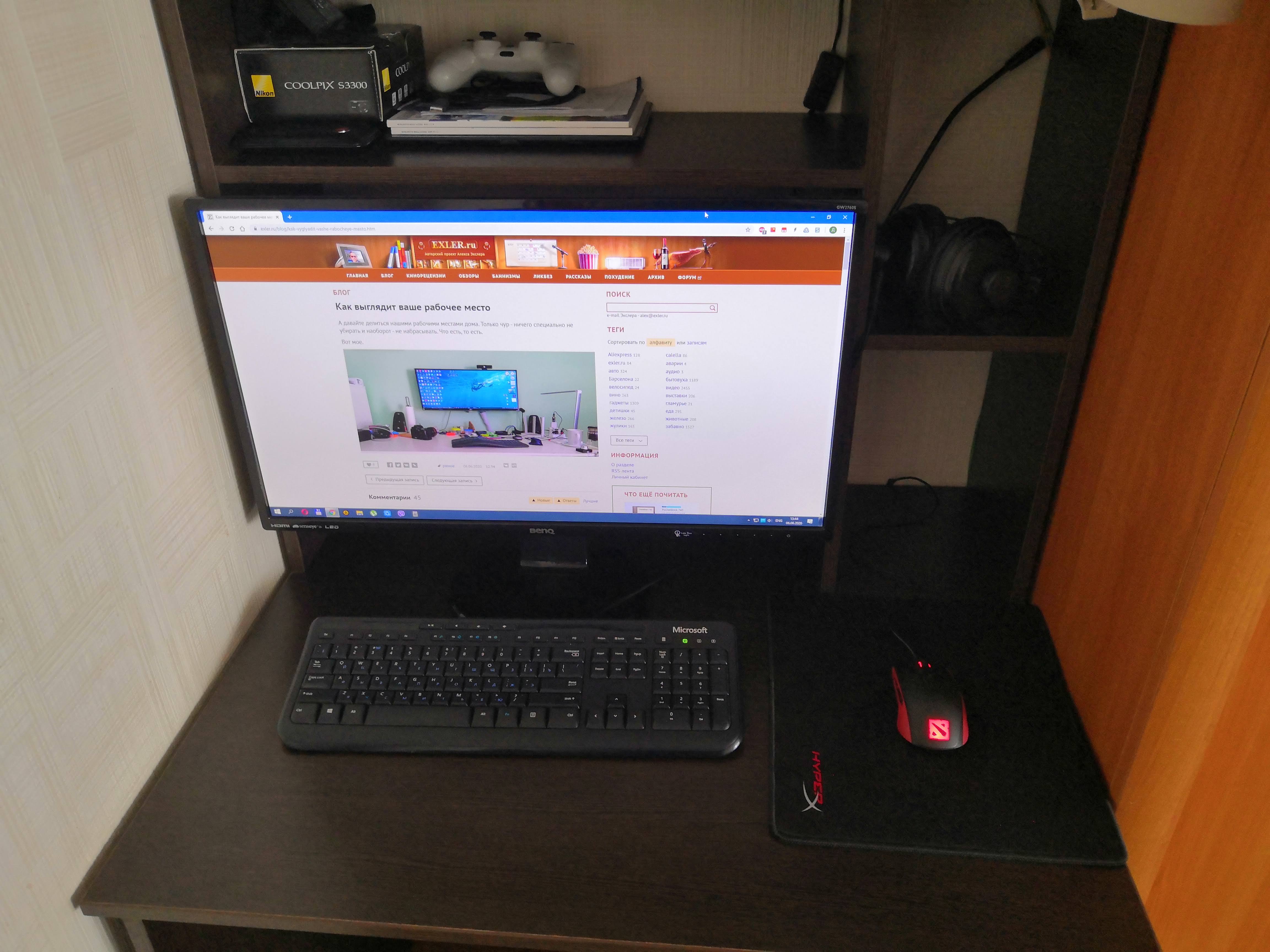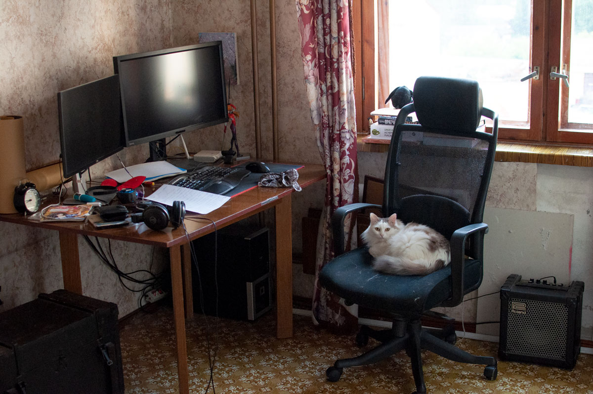 Кошка, иногда сидящая на системном блоке справа, ушла, не любит суеты. Ничего не убирал, бардак обычный.