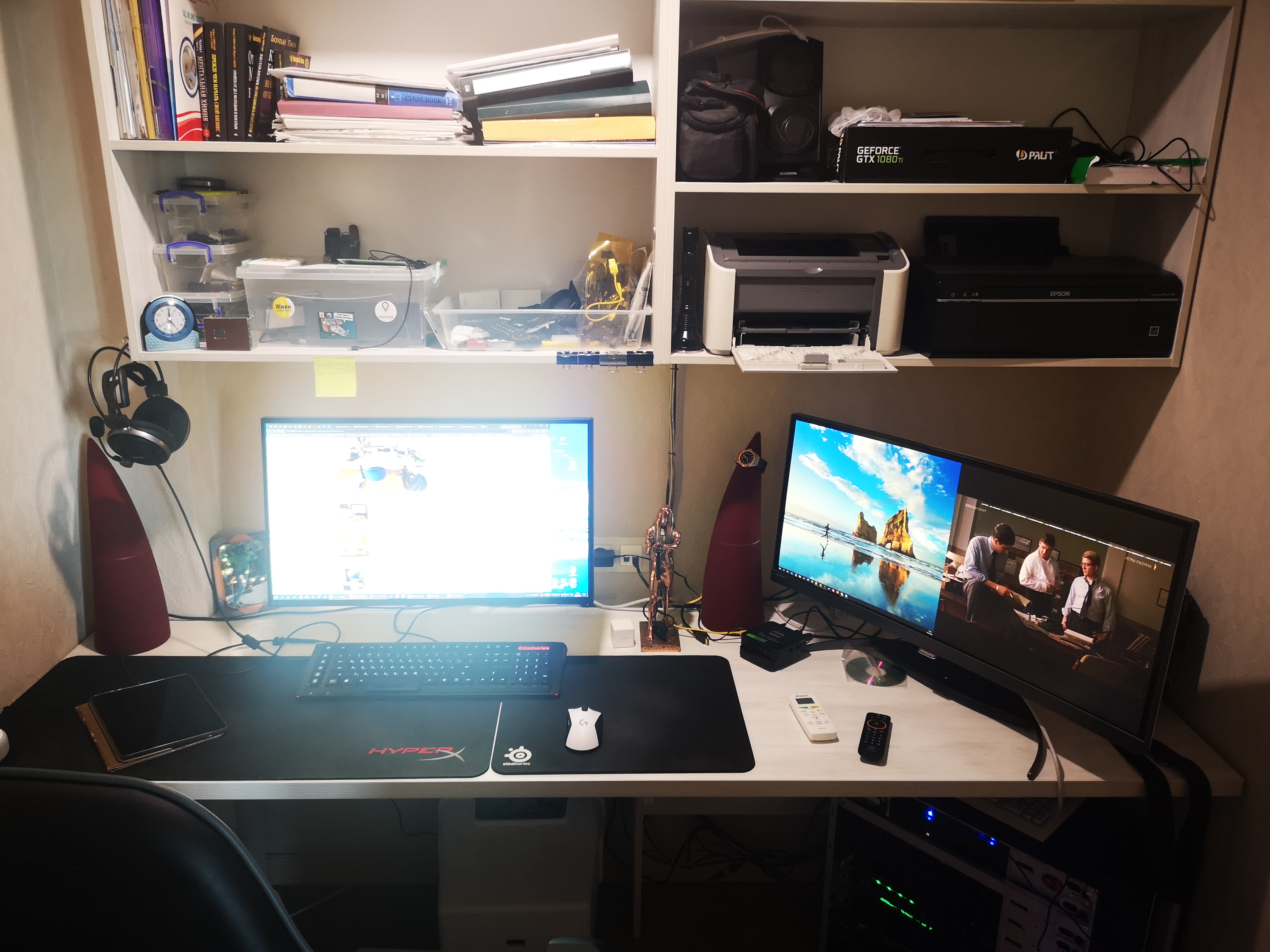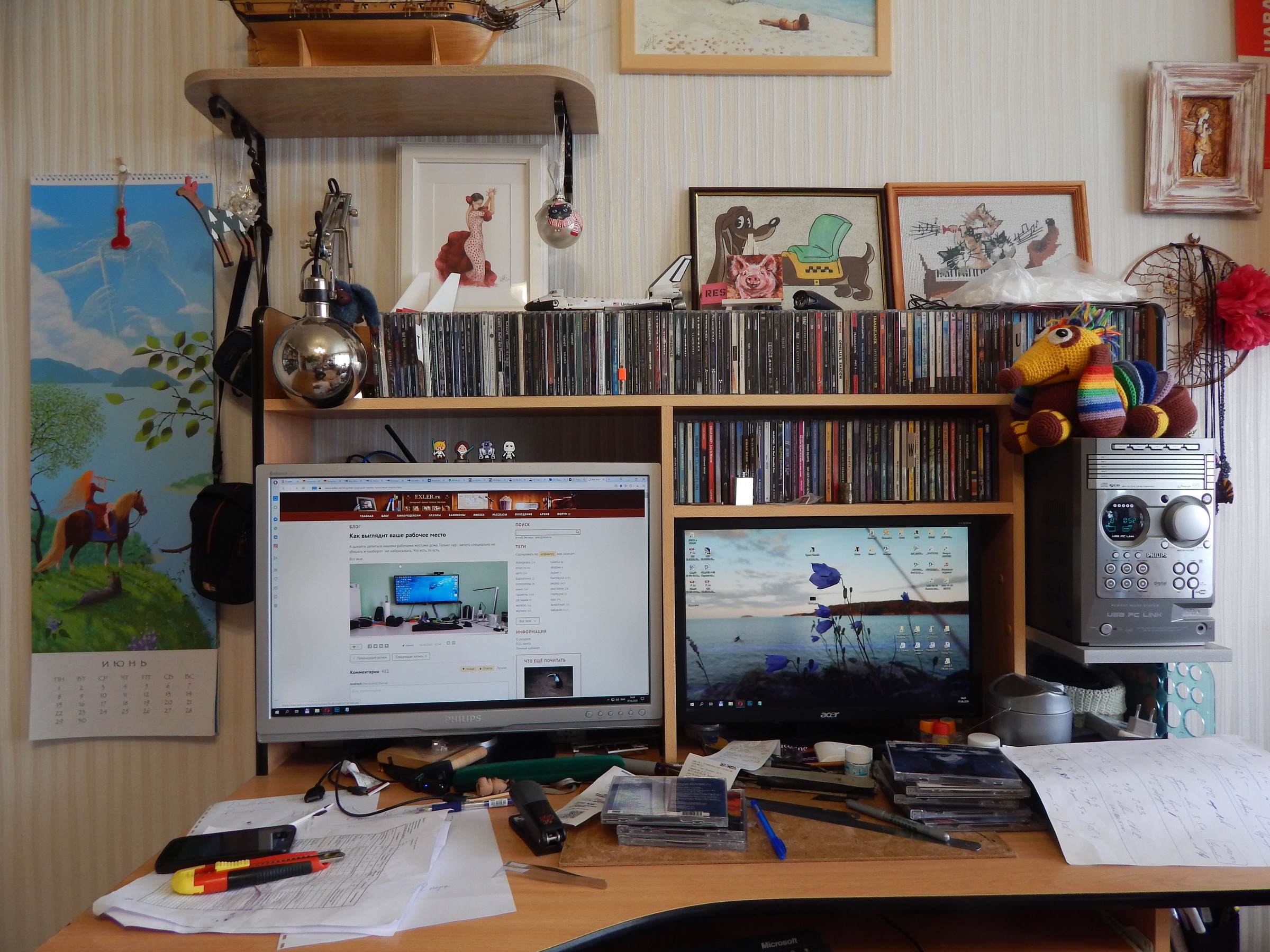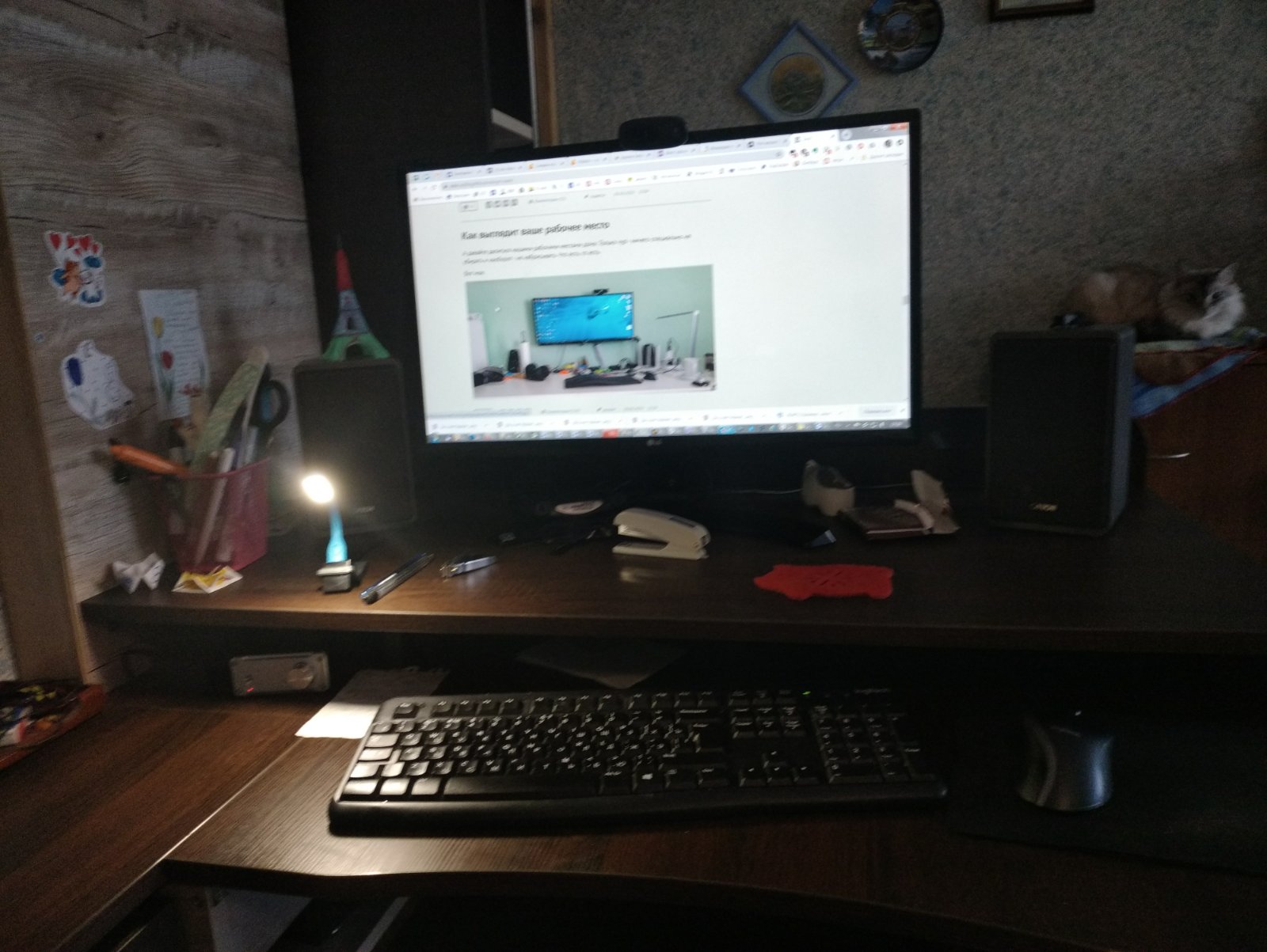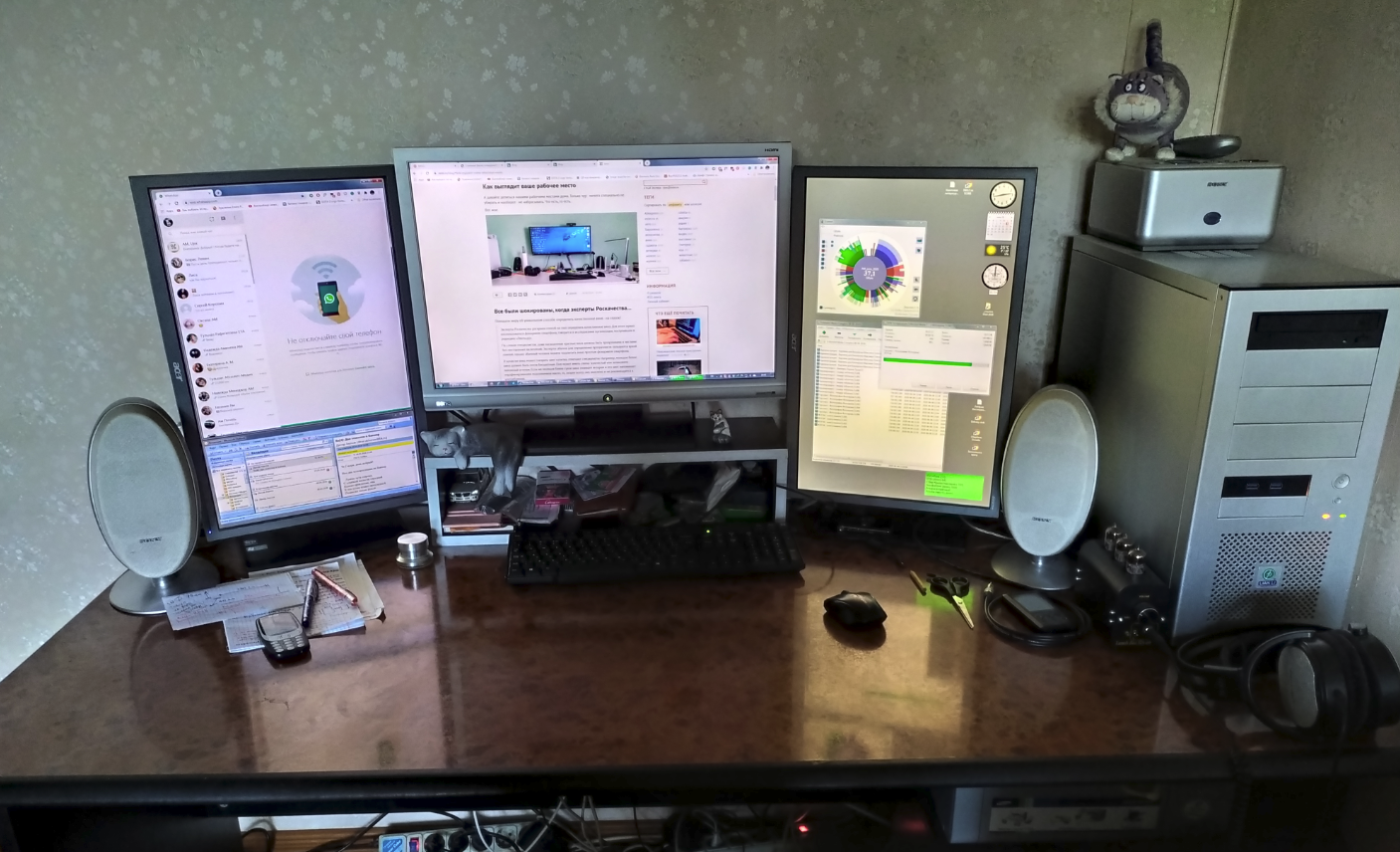 Кошка, иногда сидящая на системном блоке справа, ушла, не любит суеты. Ничего не убирал, бардак обычный.