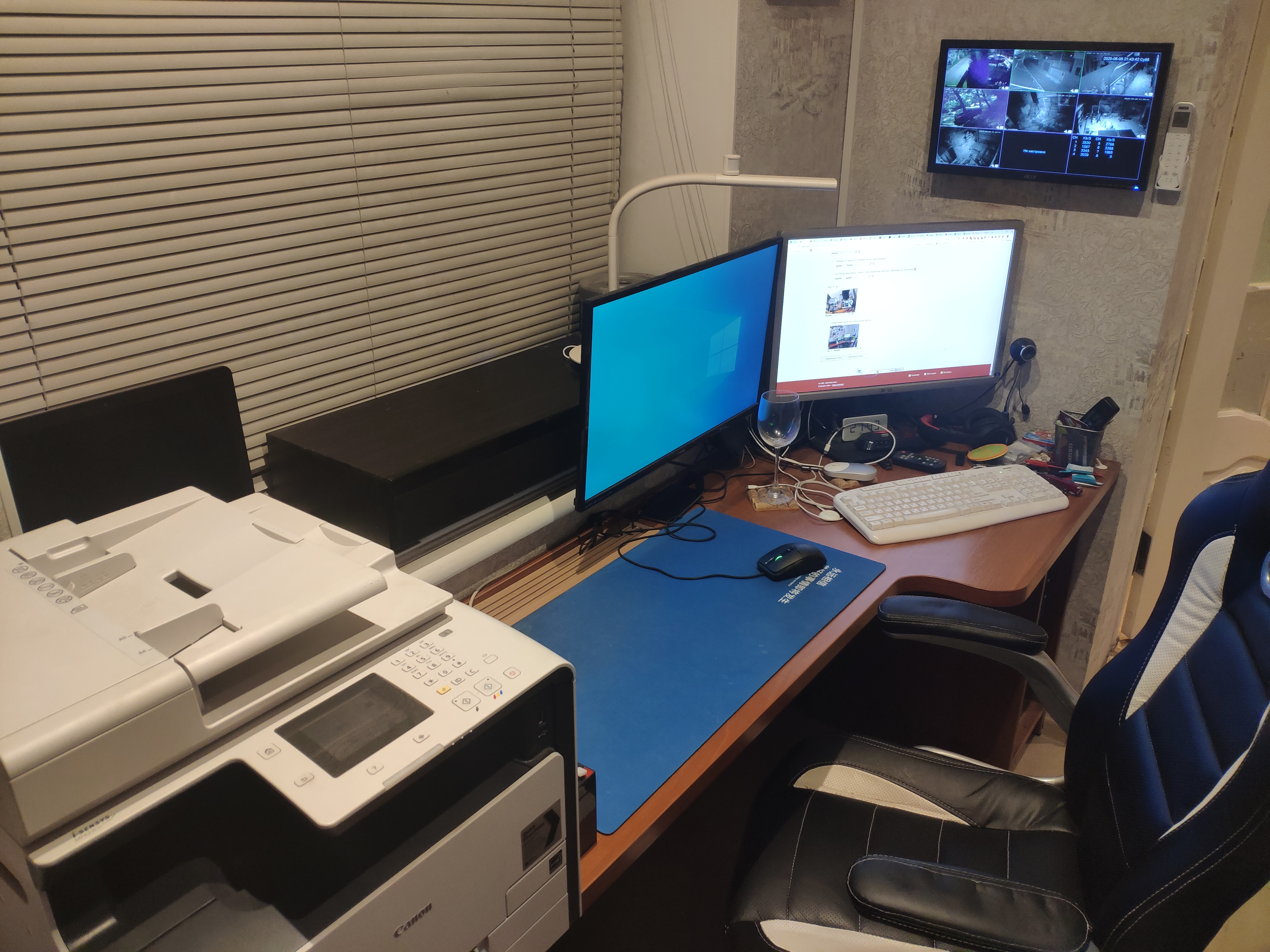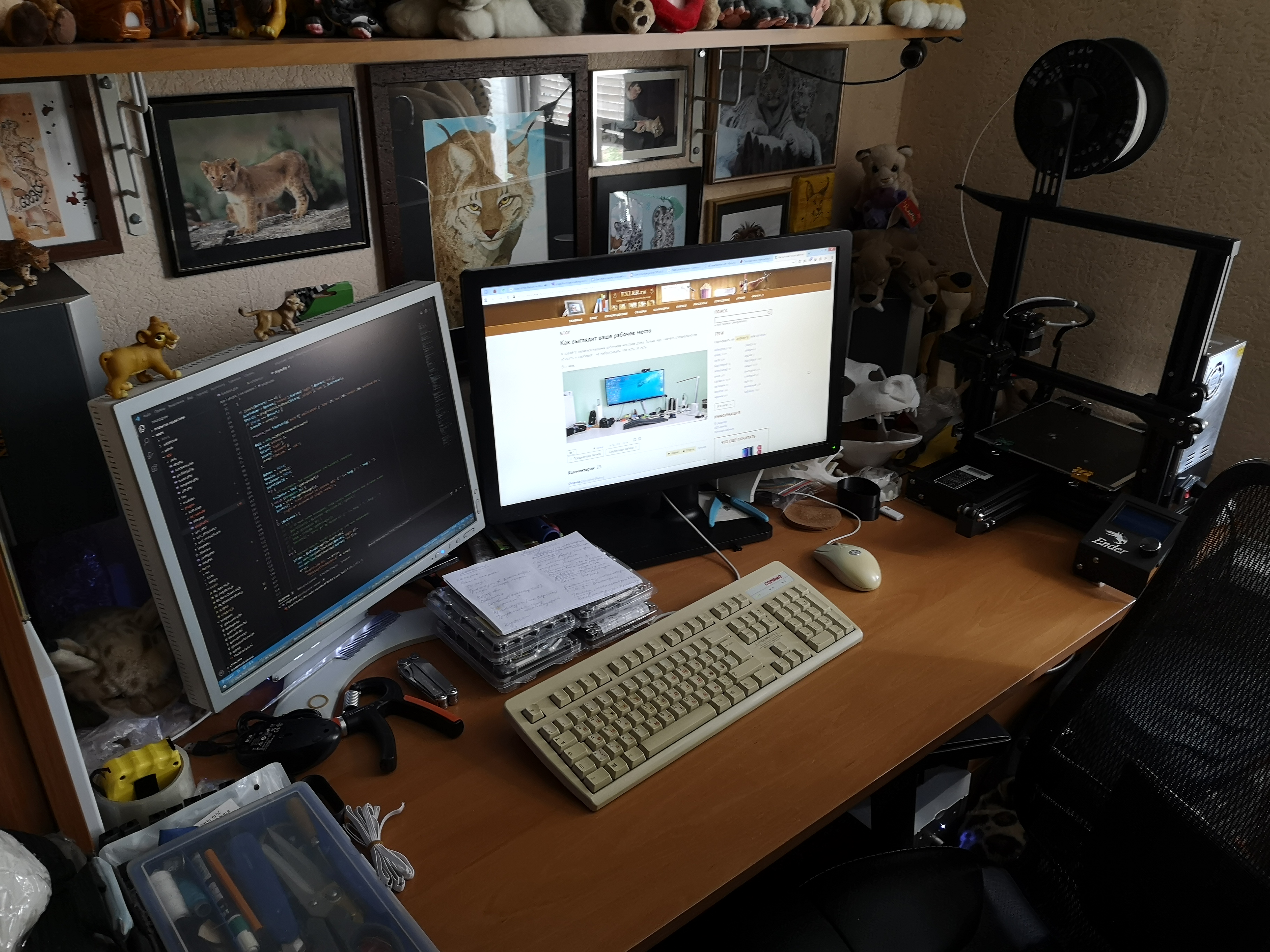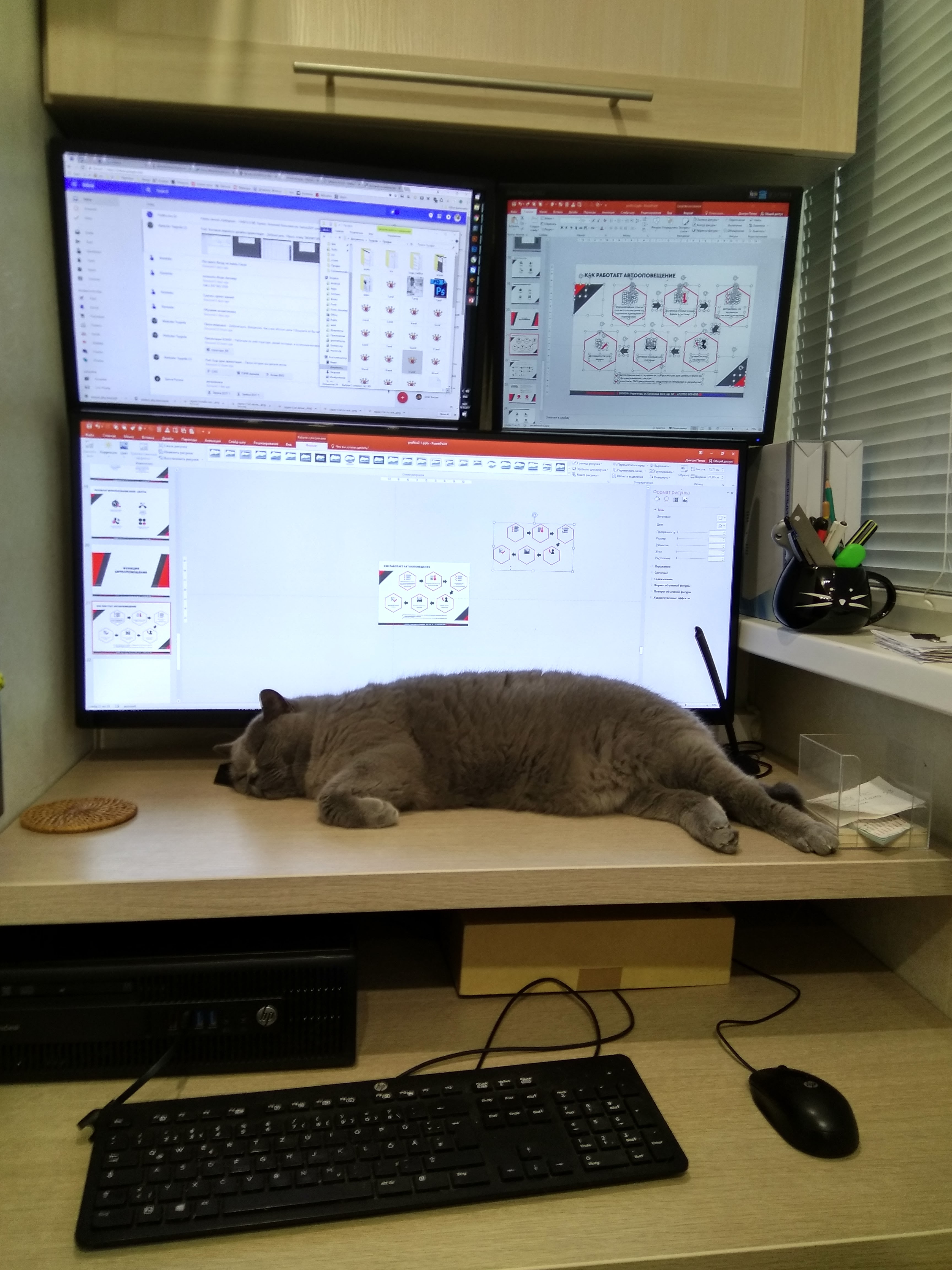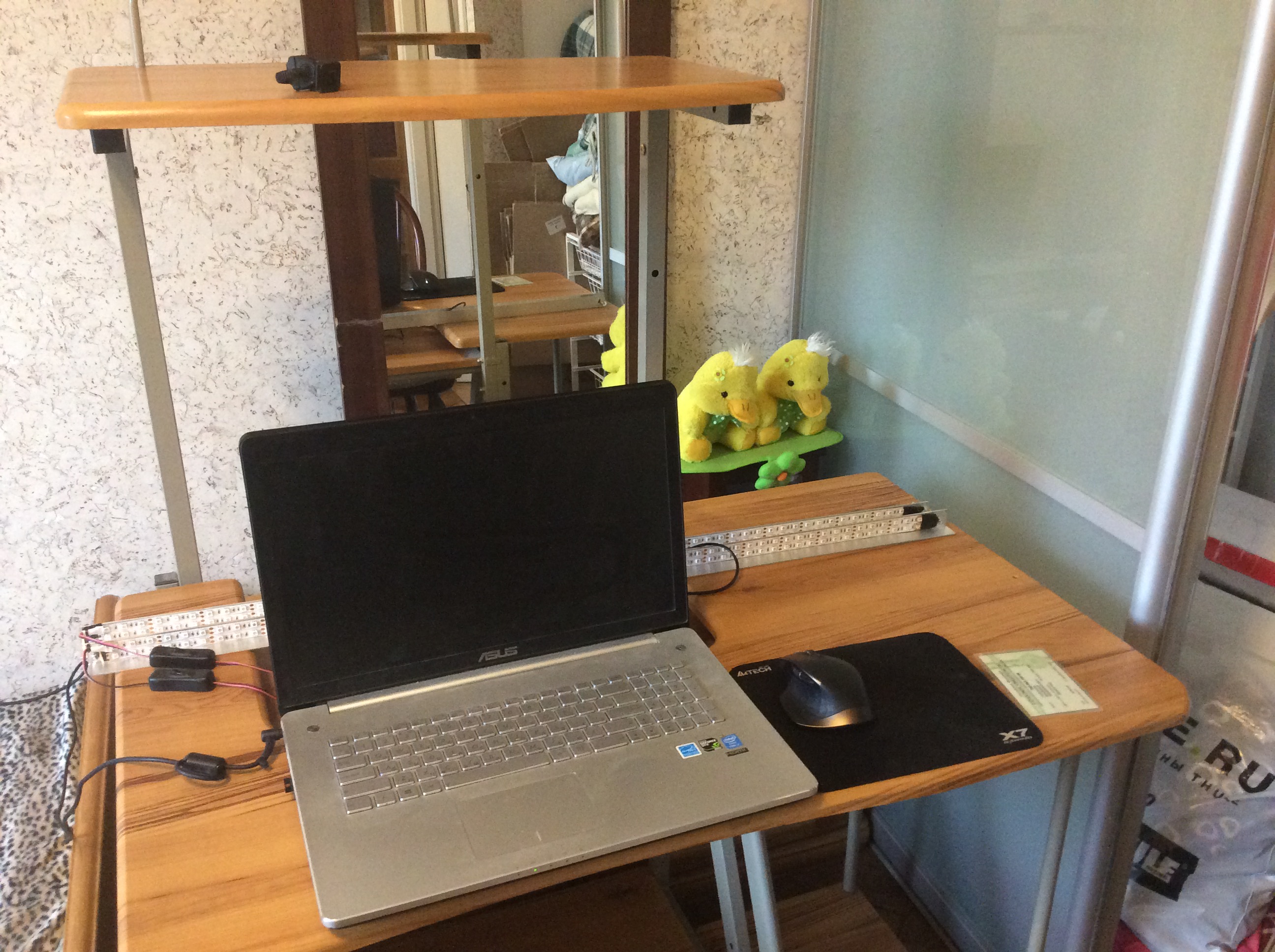 Кошка, иногда сидящая на системном блоке справа, ушла, не любит суеты. Ничего не убирал, бардак обычный.