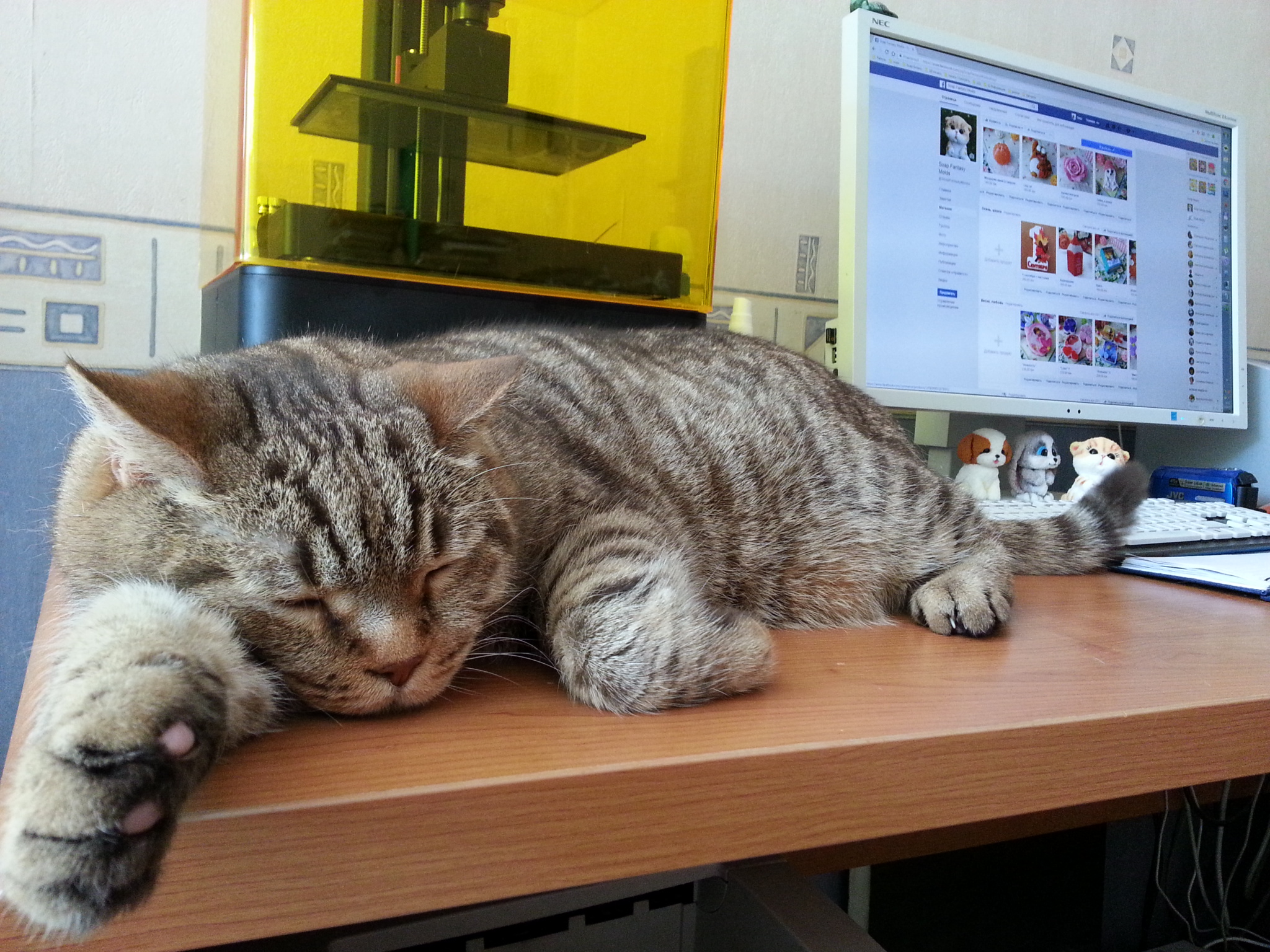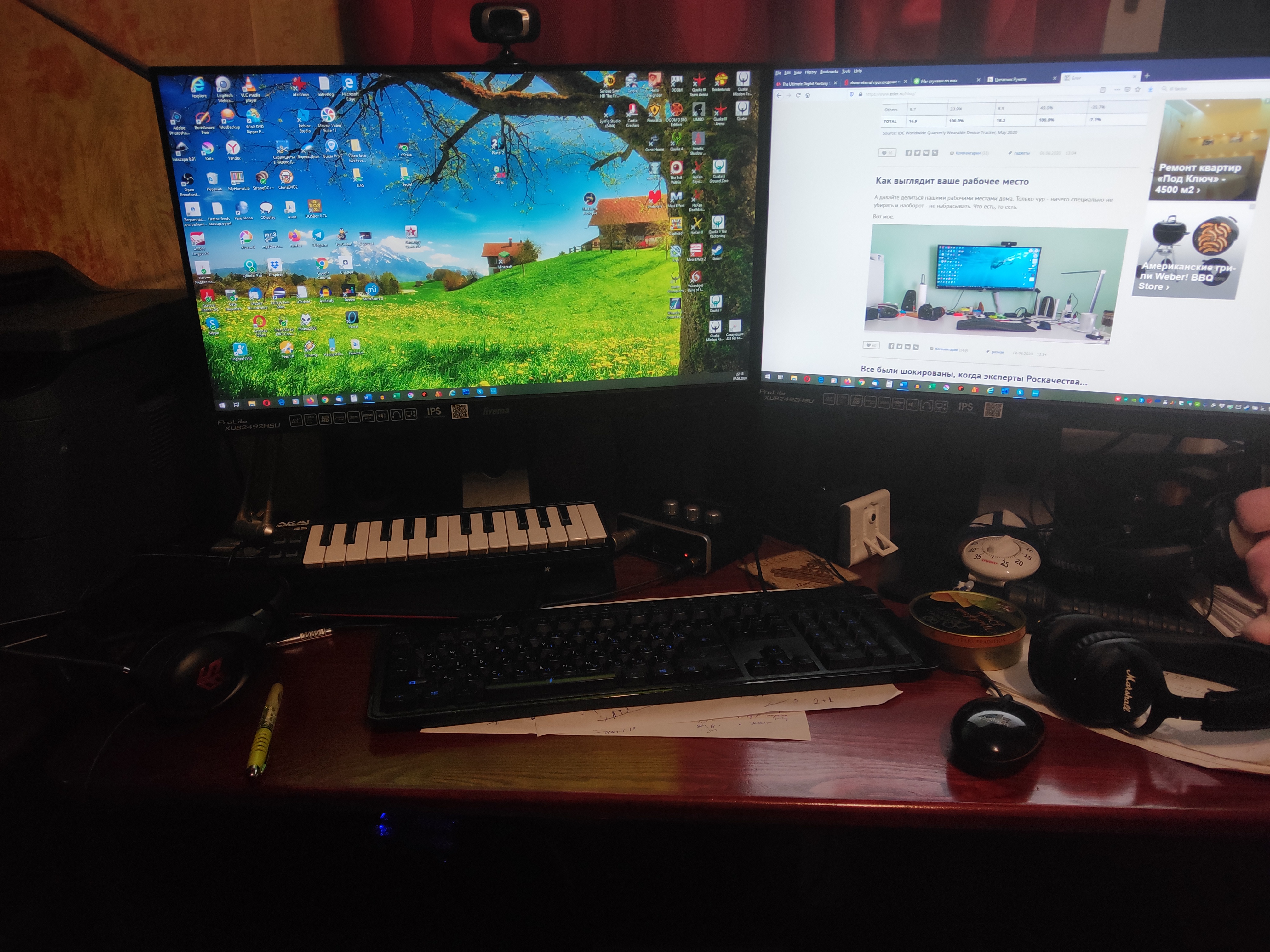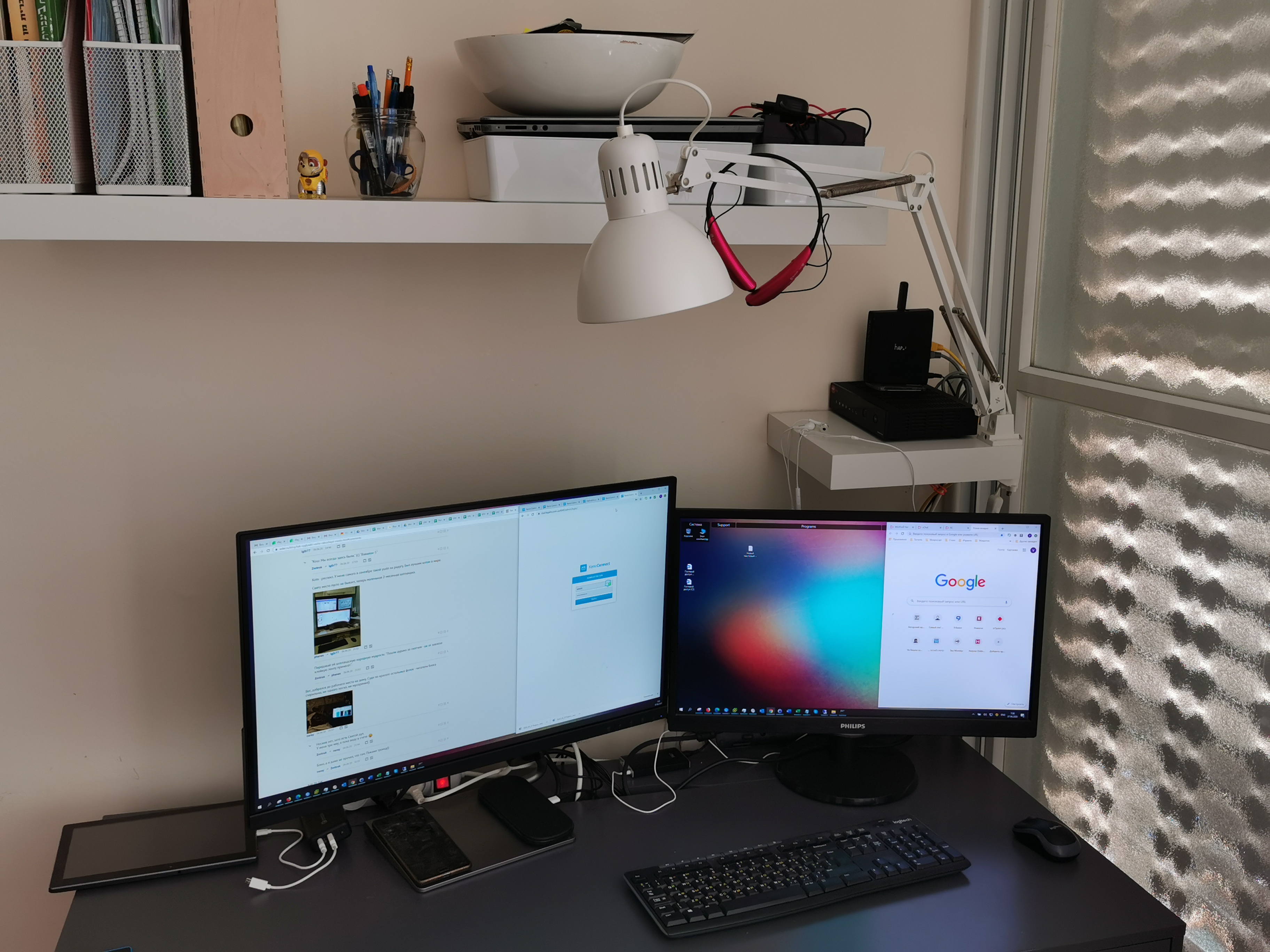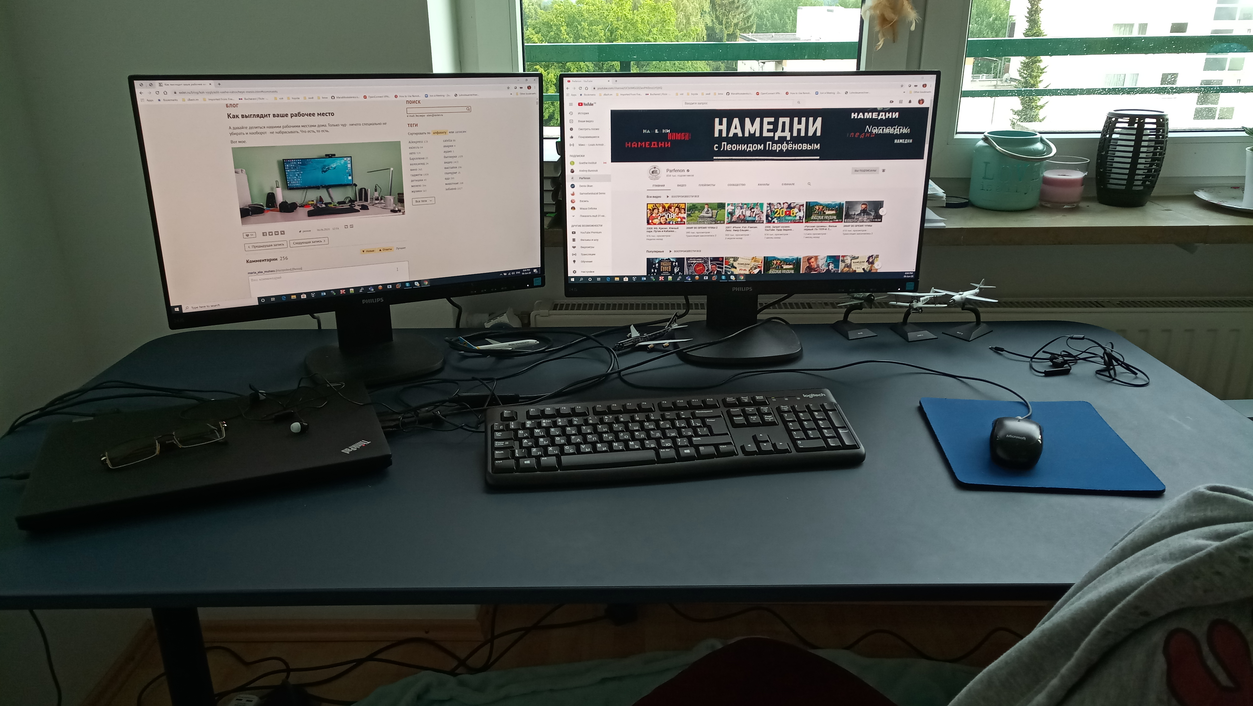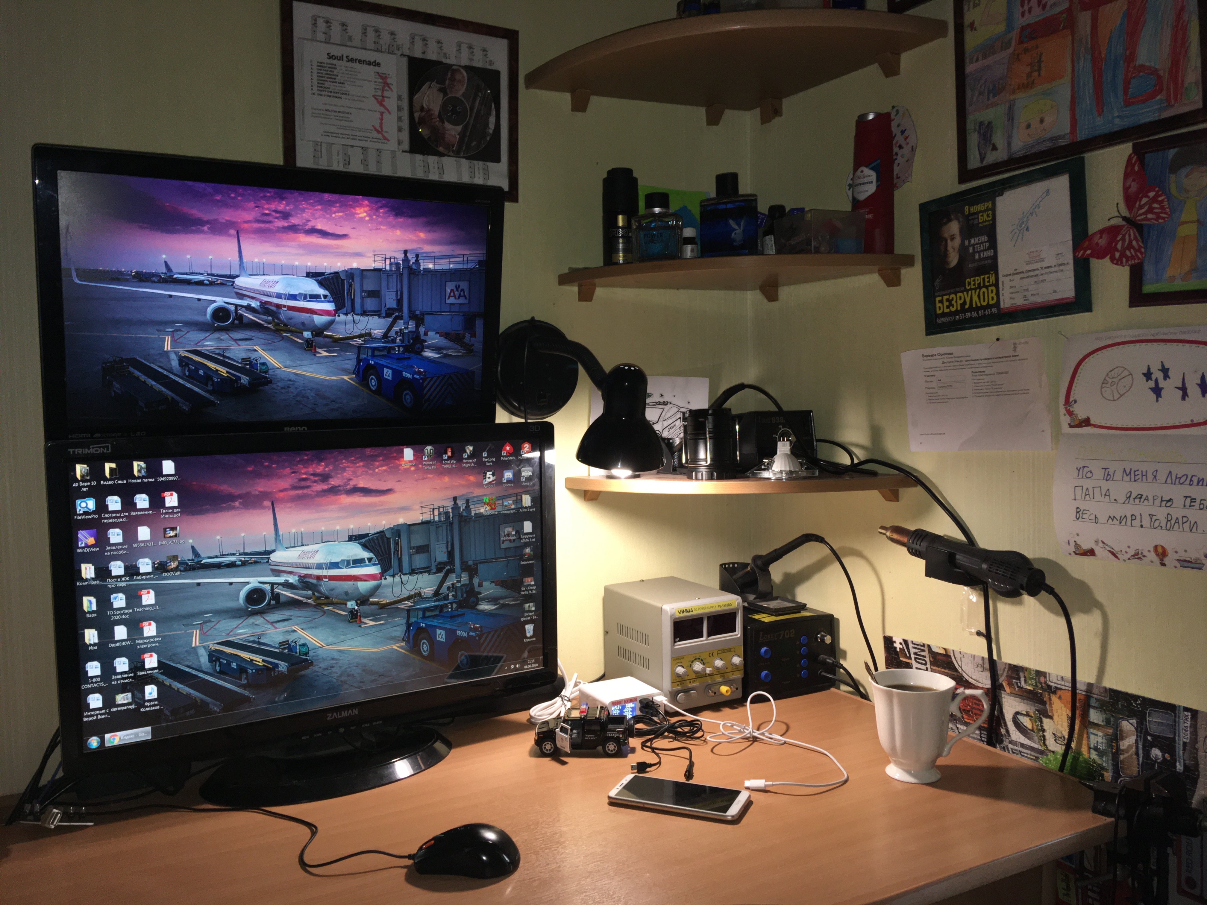 Кошка, иногда сидящая на системном блоке справа, ушла, не любит суеты. Ничего не убирал, бардак обычный.