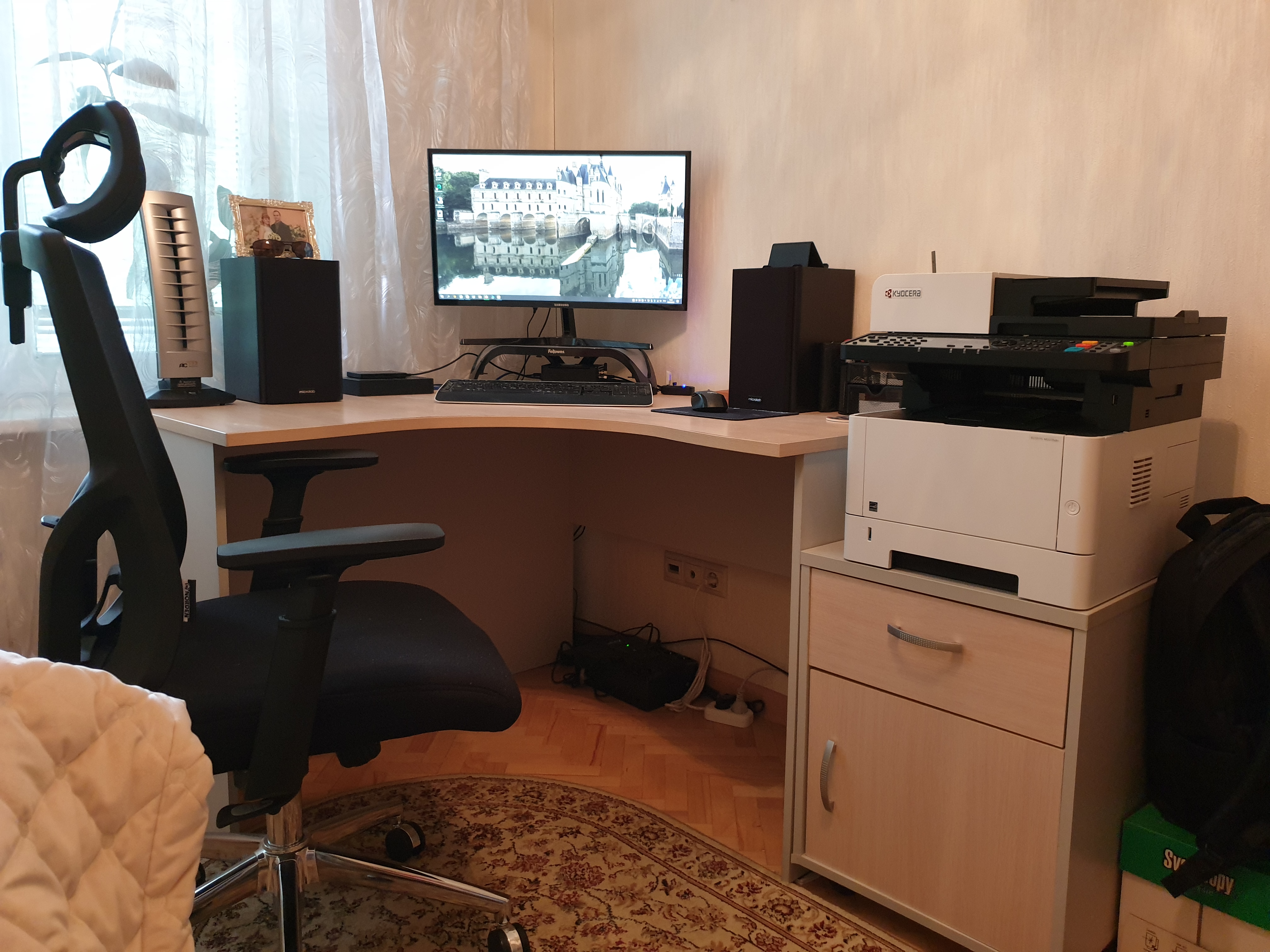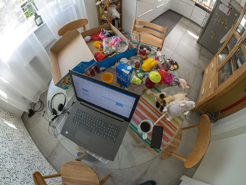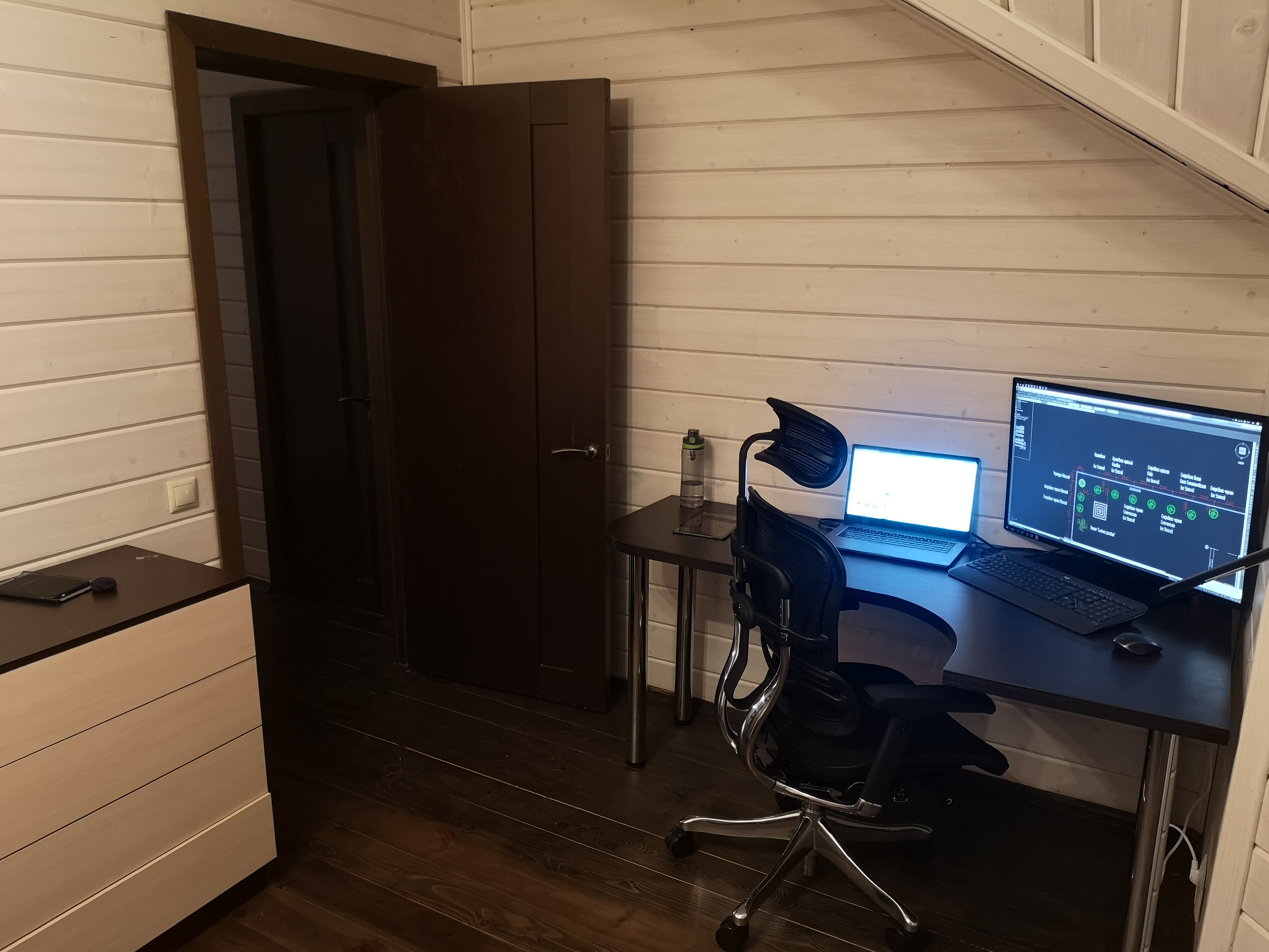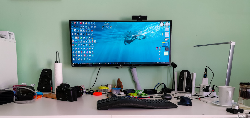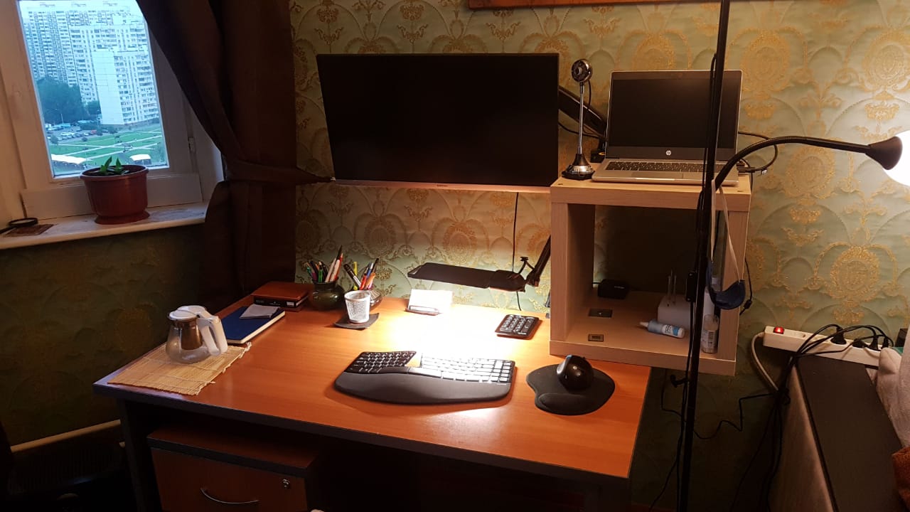 на самом деле есть еще большой рабочий кабинет (см. фото) с огромным монитором и всем делами, но т.к. кабинет в подвале, а надо следить за ребенком, который в основном на первом этаже, то сижу на кухне