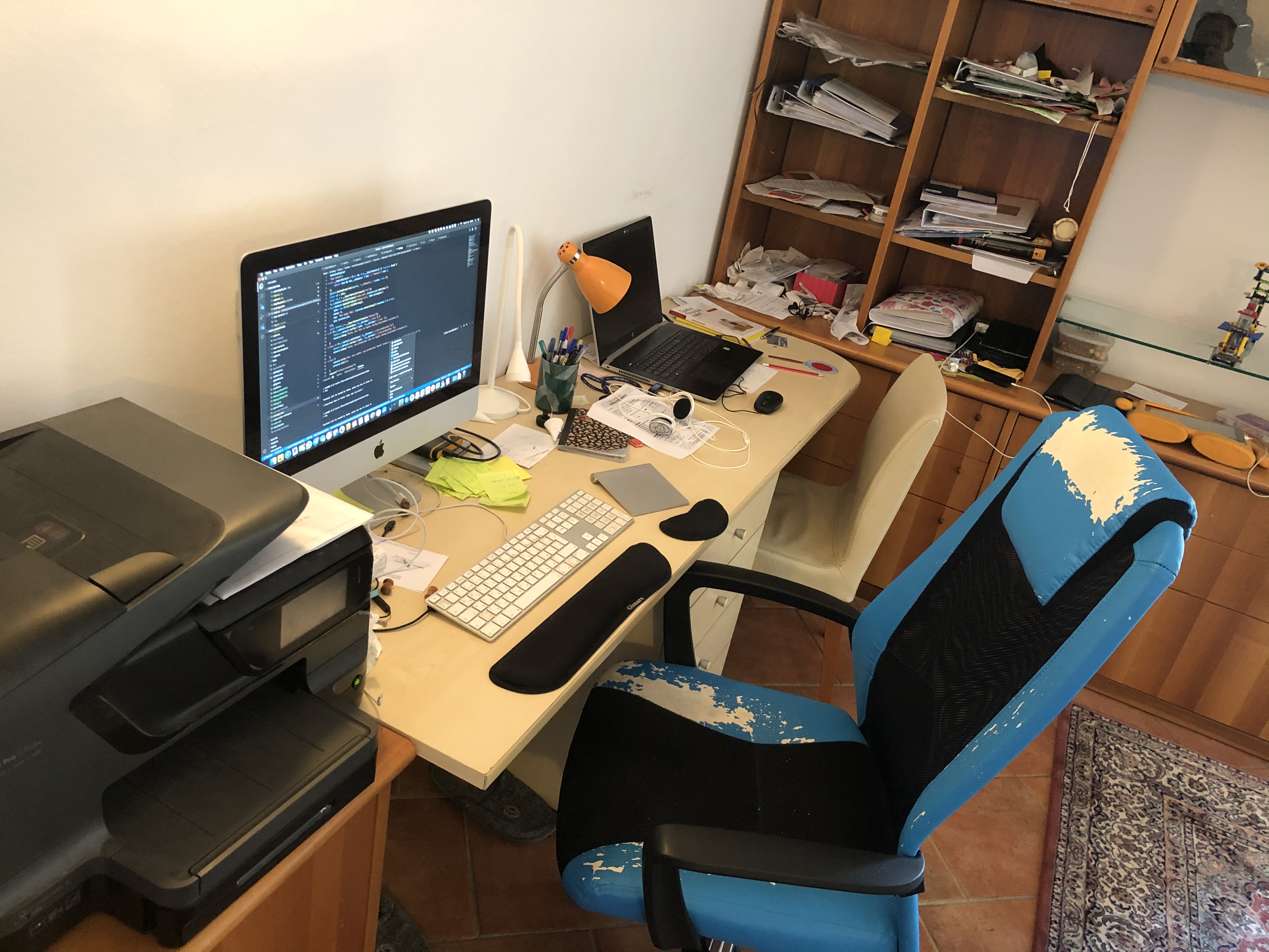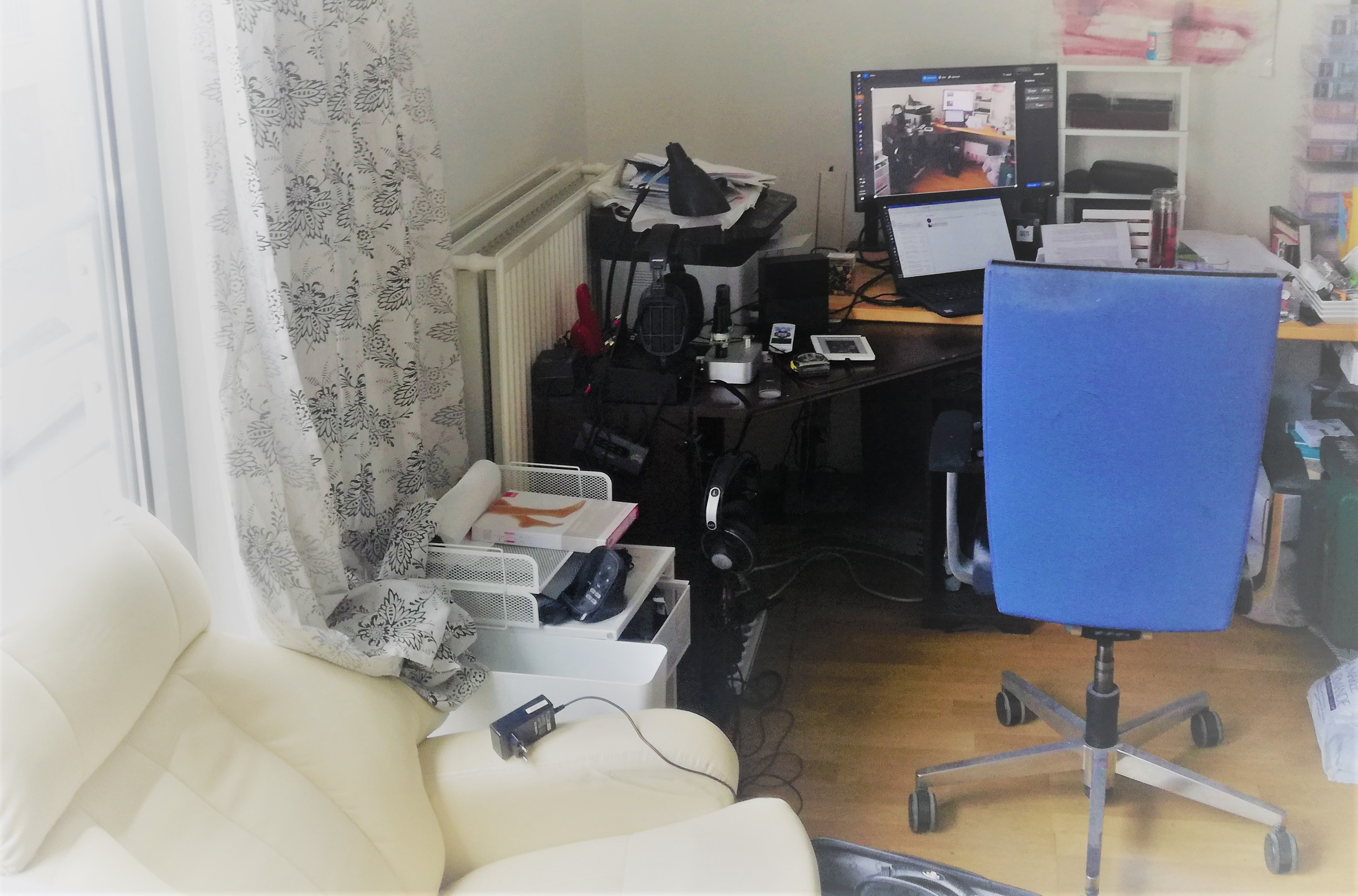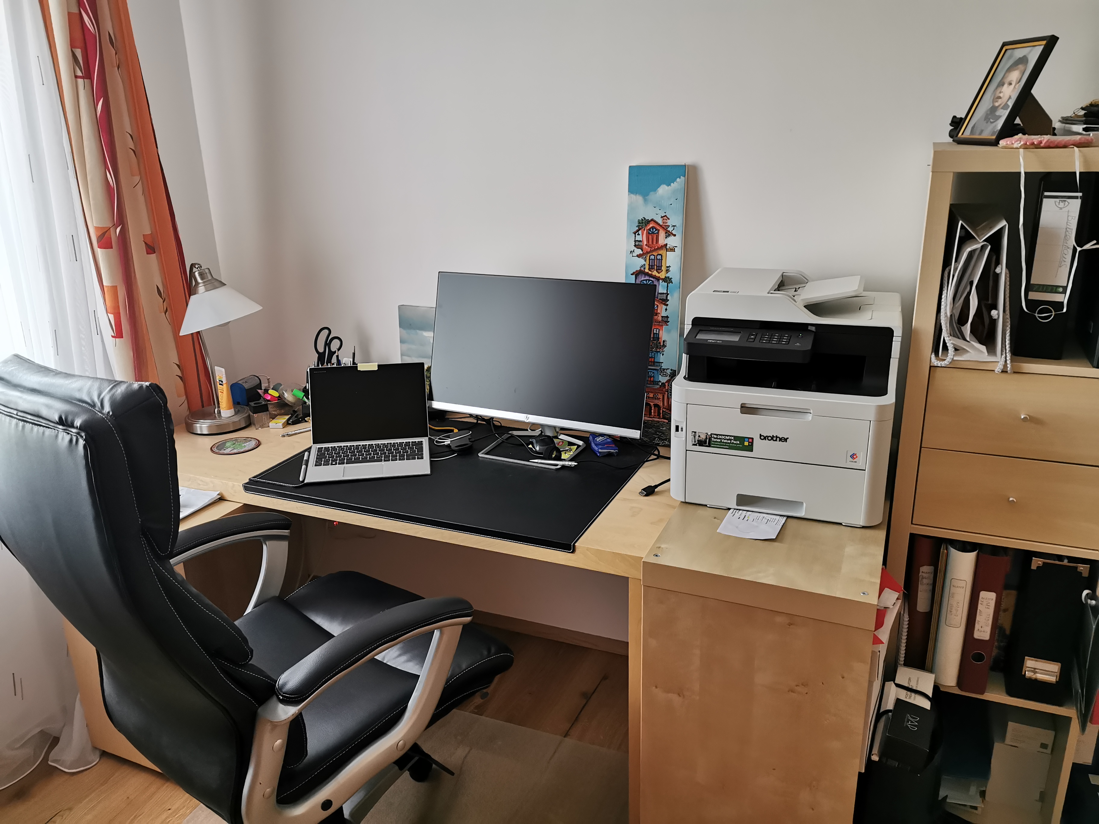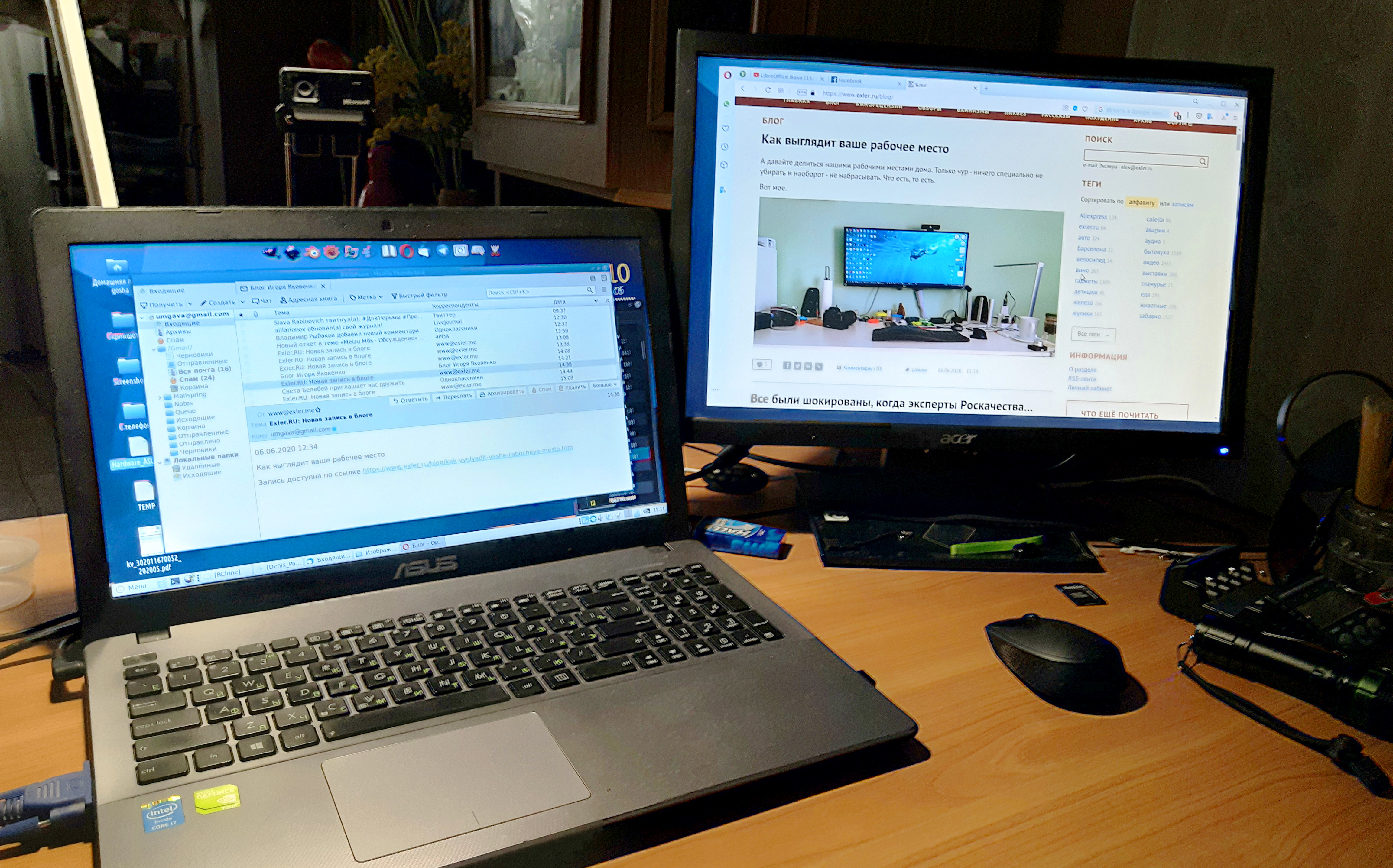 на самом деле есть еще большой рабочий кабинет (см. фото) с огромным монитором и всем делами, но т.к. кабинет в подвале, а надо следить за ребенком, который в основном на первом этаже, то сижу на кухне
