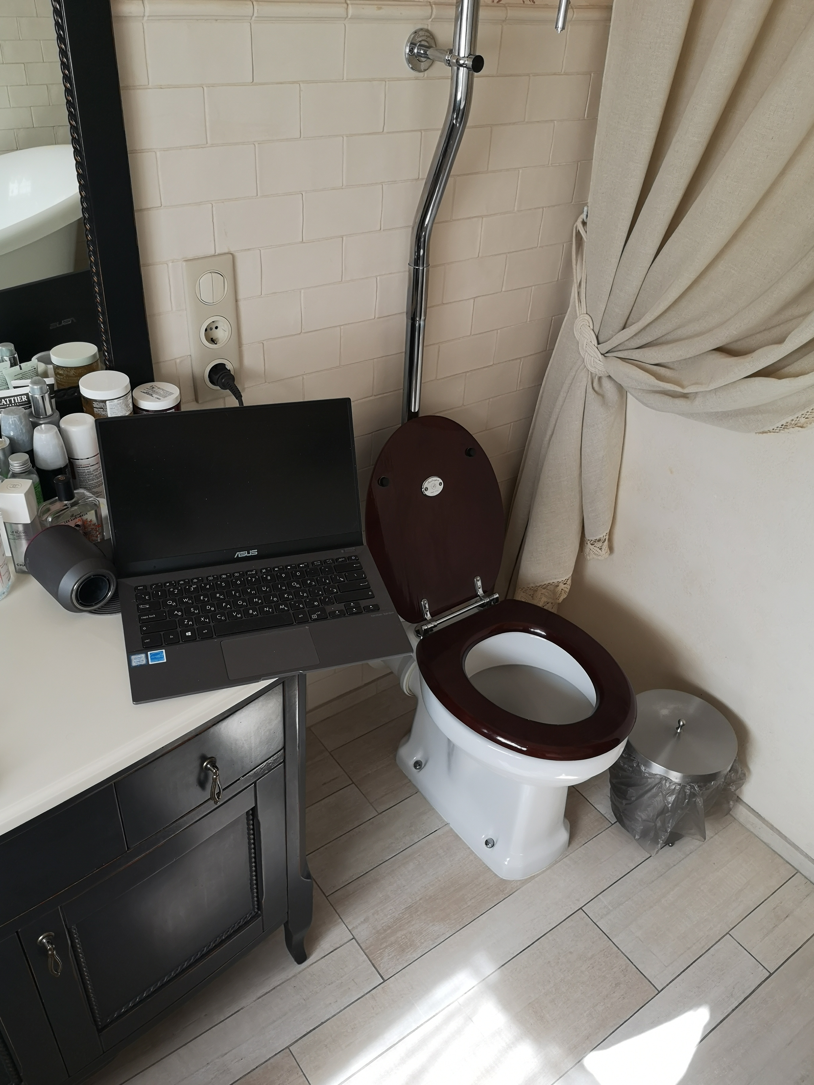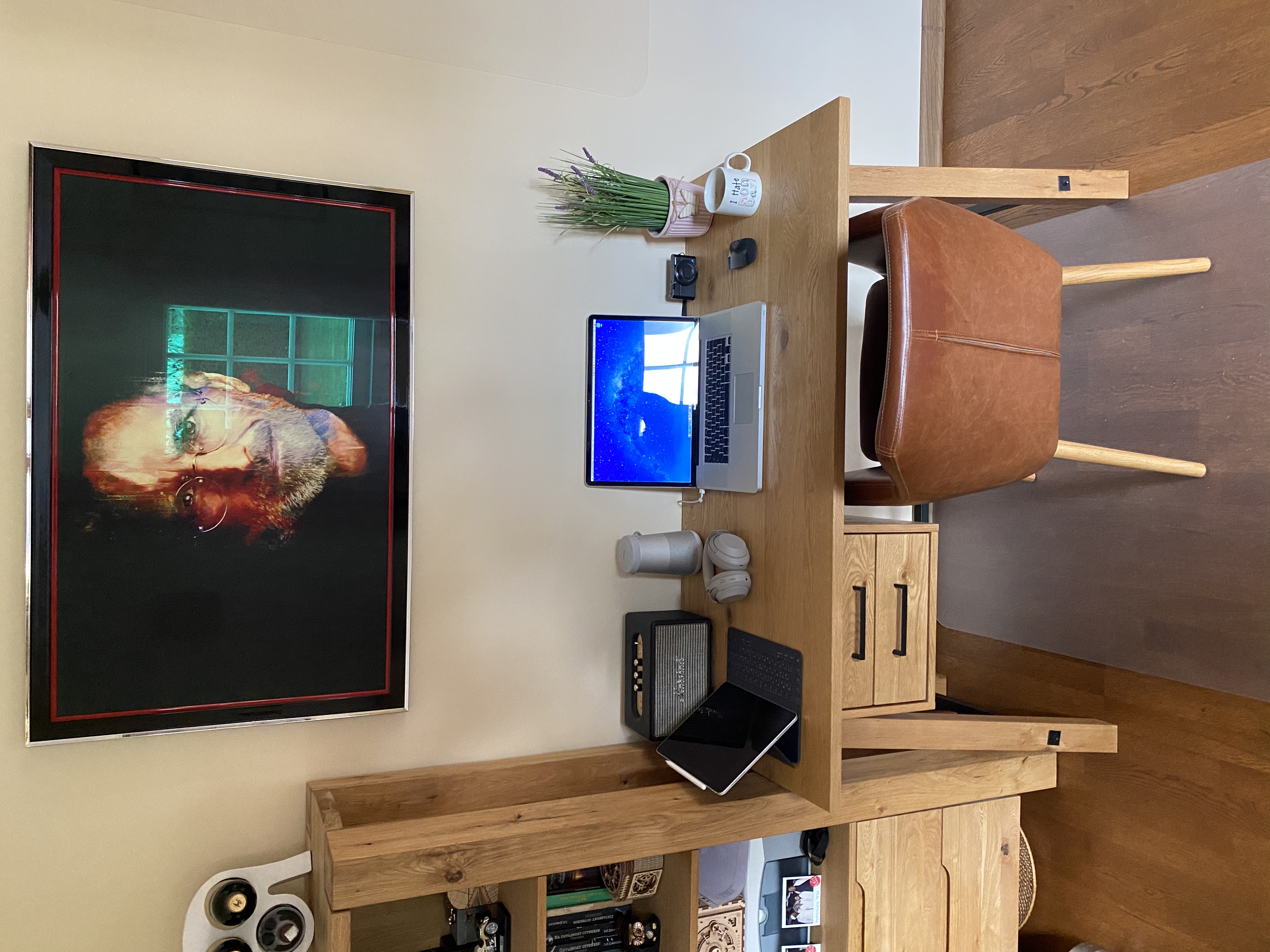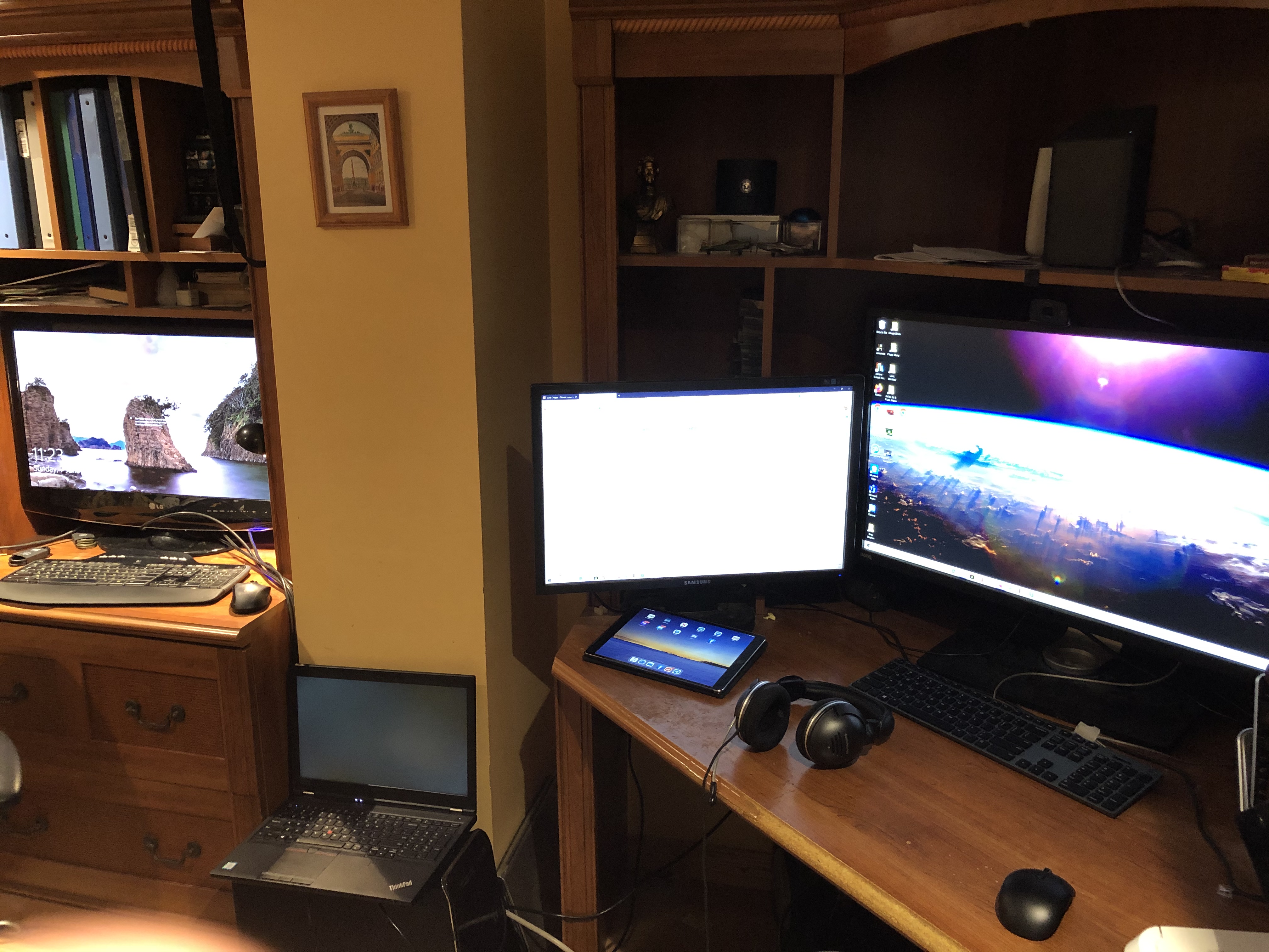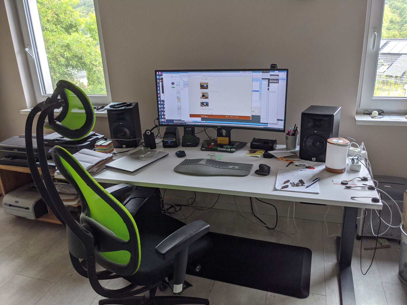 на самом деле есть еще большой рабочий кабинет (см. фото) с огромным монитором и всем делами, но т.к. кабинет в подвале, а надо следить за ребенком, который в основном на первом этаже, то сижу на кухне
