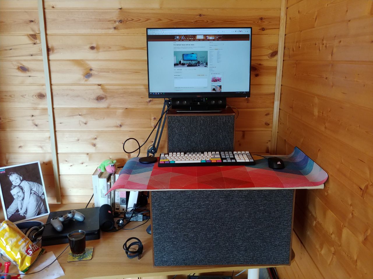 На даче организовал наконец стоячее рабочее место. Заодно старые советские колонки пригодились.