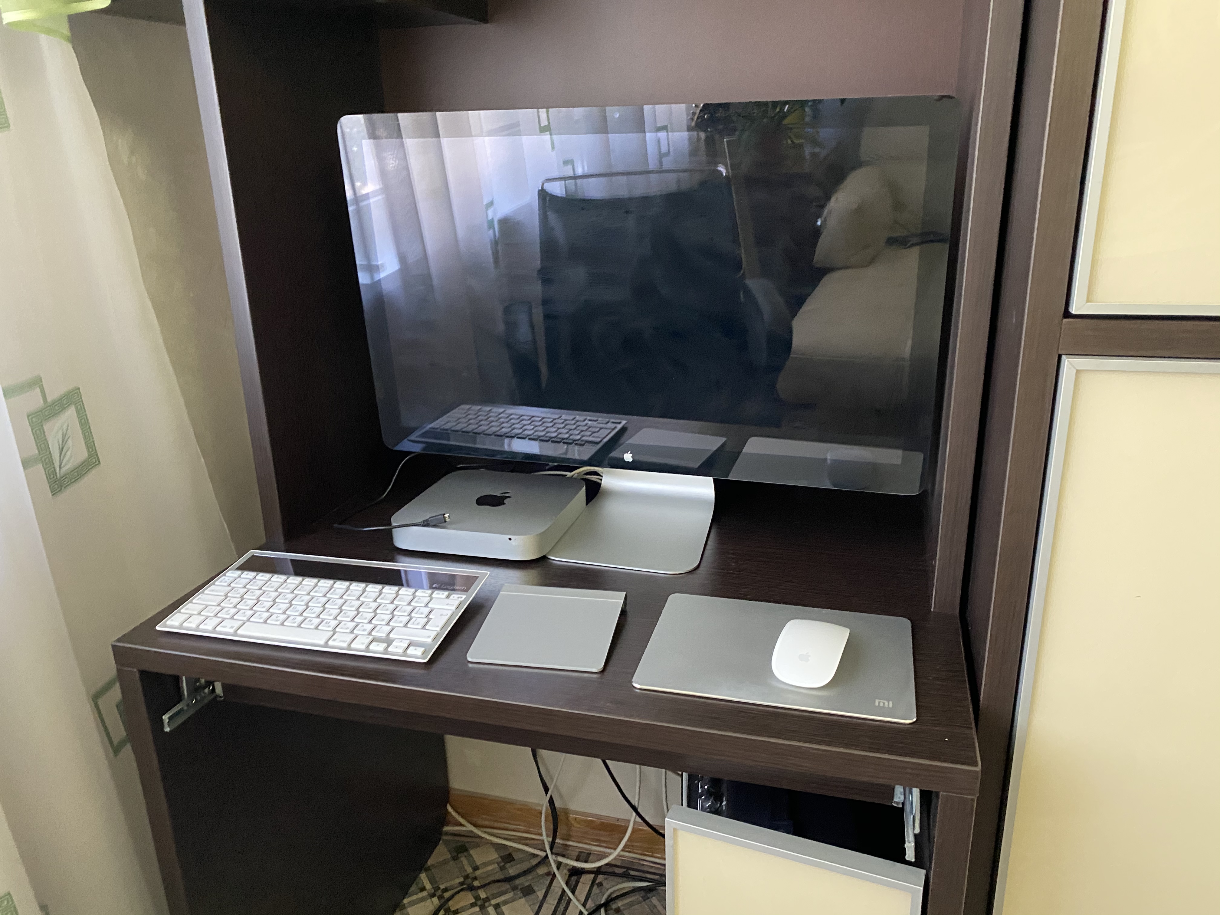 У меня дома места мало. Есть на кухне закуток, где я приделал к стене столик, на который еле компьютер помещается (моноблок).