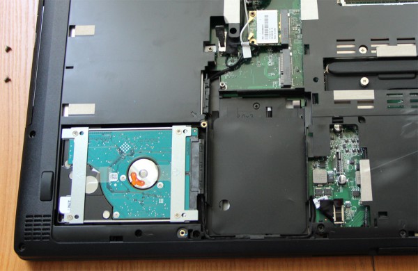 Понял, сказал я, поблагодарил милую девушку и положил трубку. После этого взял отвертку, отвернул шесть винтов у нижней крышки и снял ее. (Гарантия при этом не теряется, пломб там нет: крышка специально чтобы можно было ставить второй диск.) Под крышкой резко стало понятно, что второй SSD туда поставить - раз плюнуть: вон двухдюймовое посадочное место.