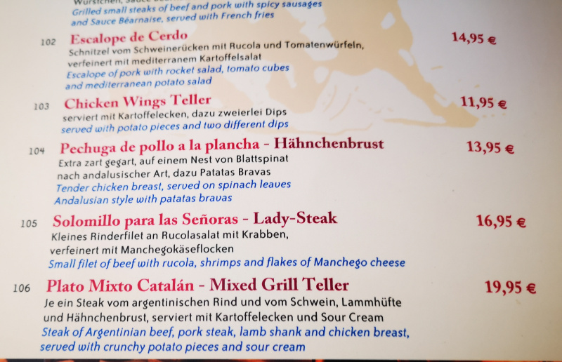 Заселился, зашел пообедать в ресторанчик при отеле - а он называется El Dorado, специализируется на испанской и даже каталанской кухне. Прям как не уезжал. И официантка по-испански говорила, причем мы при общении оба испытали огромное облегчение: ей не надо было говорить по-немецки, а мне не надо было говорить по-английски, потому что у меня поначалу английский с испанским очень путаются. Нужно минут двадцать и пару бокалов, чтобы я говорил по-английски не на смеси с испанским.