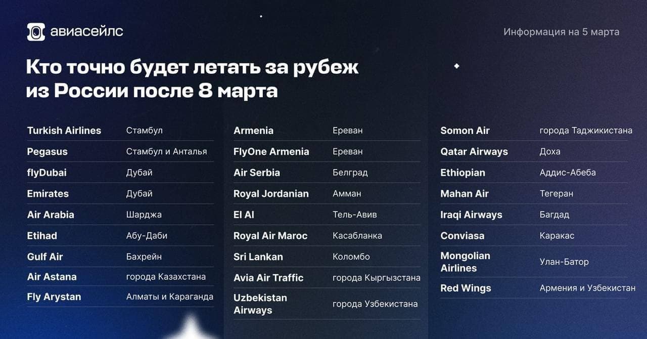Полезное от "Авиасейлс" - какие авиакомпании будут летать за рубеж из России после 8 марта.