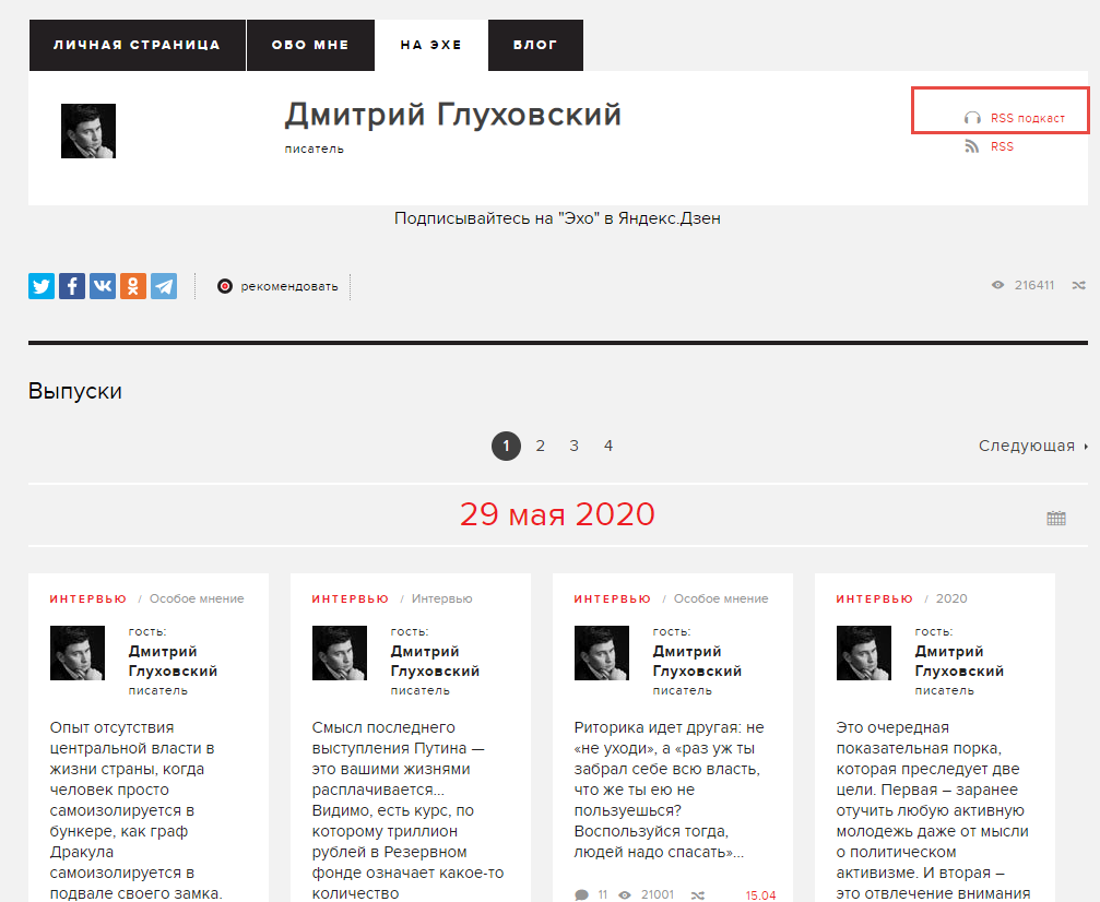 Например страница Дмитрия Глуховского https://echo.msk.ru/guests/607370-echo/