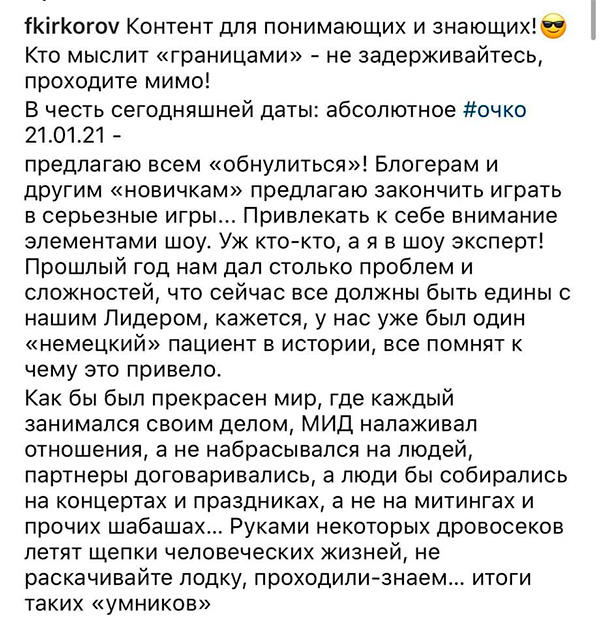 Правда, как-то небрежно выступил Филипп Бедросович, не сумел обуздать поток своих мыслей шальных, уж больно тревожился за то отечество, которое есть! Мы понимаем, что Киркорову, конечно же, лучше зад картофельному Пюреру вылизывать, что он недавно делал, а не в соцсети писать.