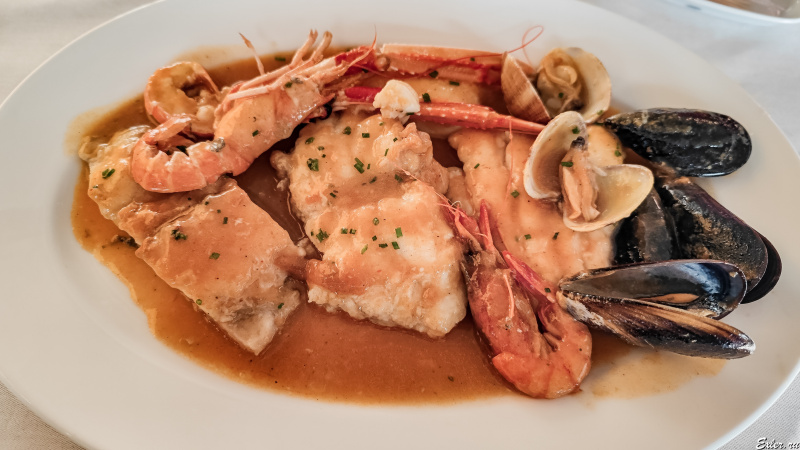 В данном случае в сарсуэлу входили: два вида креветок, моллюски и мидии, три вида рыбы - обязательная рыба-черт, мерлуса (хек) и моя любимая корвина. Приготовлено было совершенно замечательно: блюдо очень нежное и невероятно вкусное.