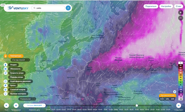 VentuSky - очень красивая, а главное - наглядная карта мира с визуальными и цифровыми показателями температуры, скорости ветра, осадков, облачности, атмосферного давления, гроз, снежного покрова. Прям в закладки, однозначно.