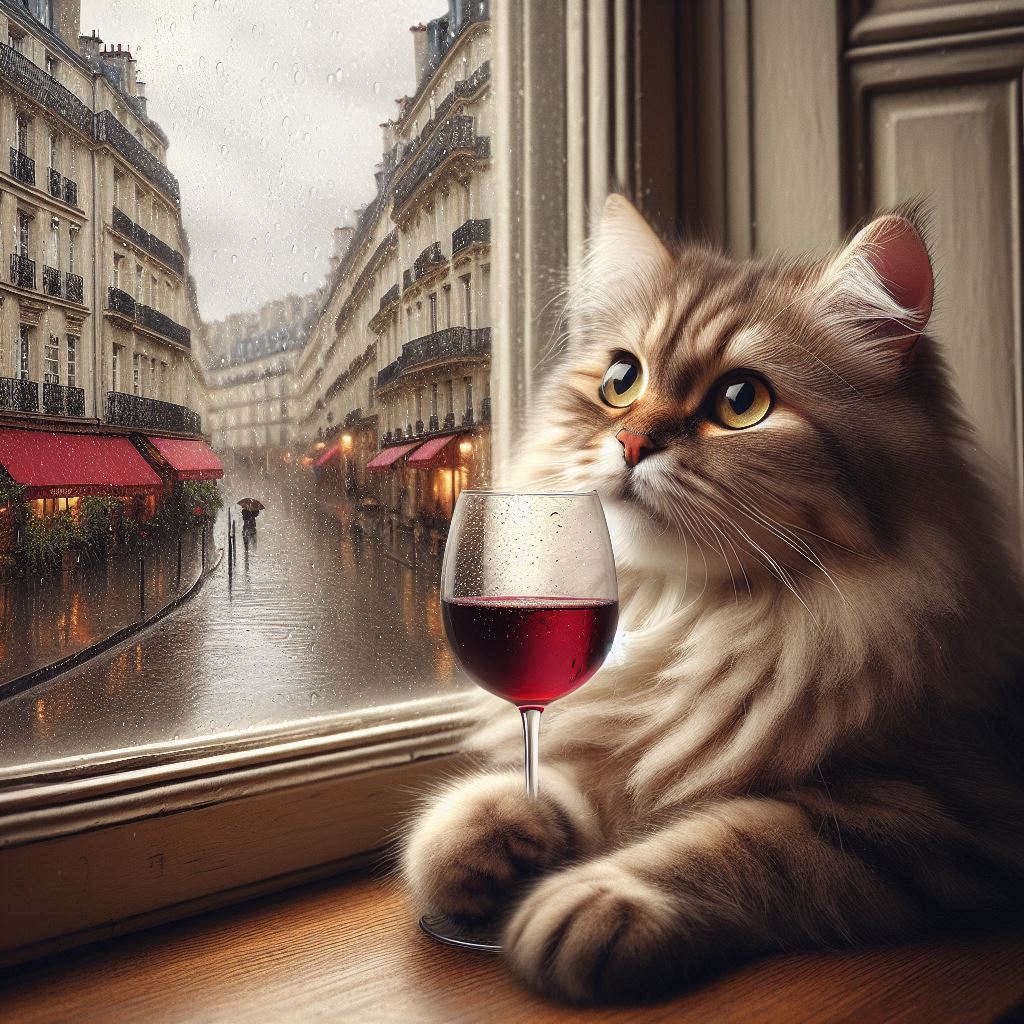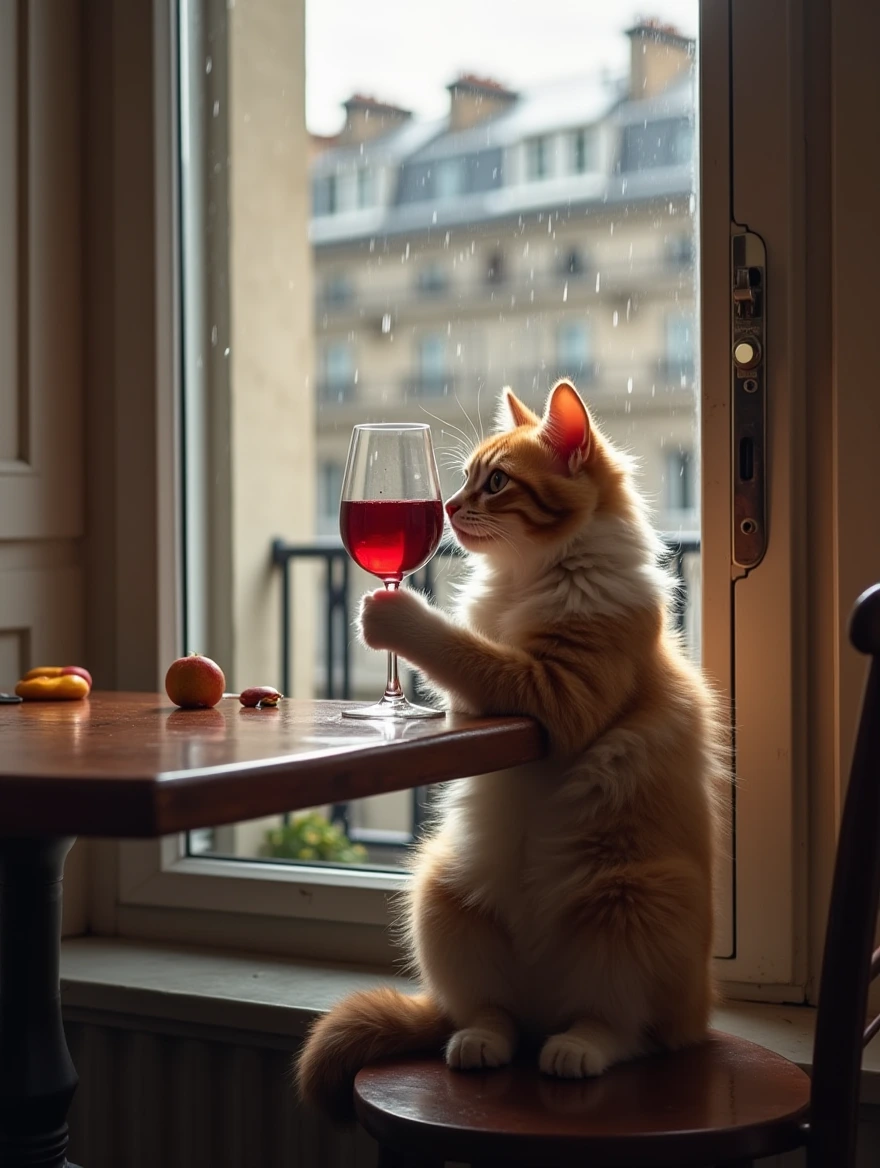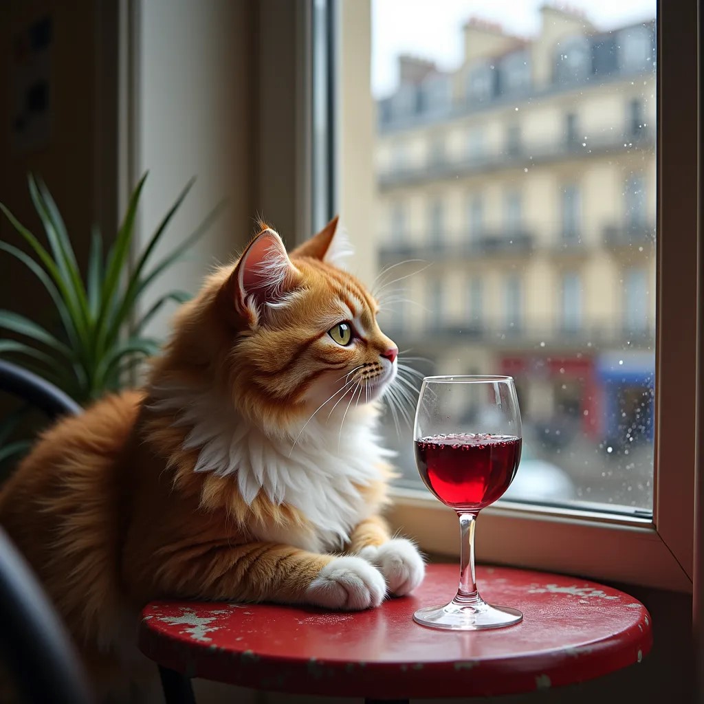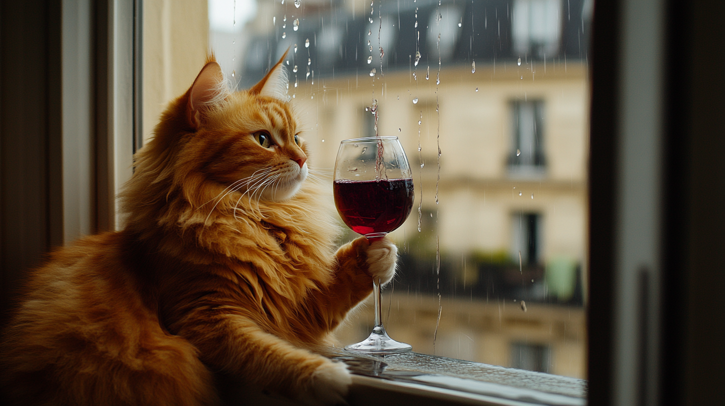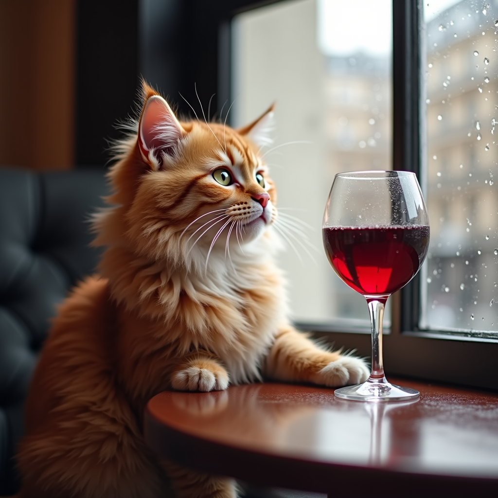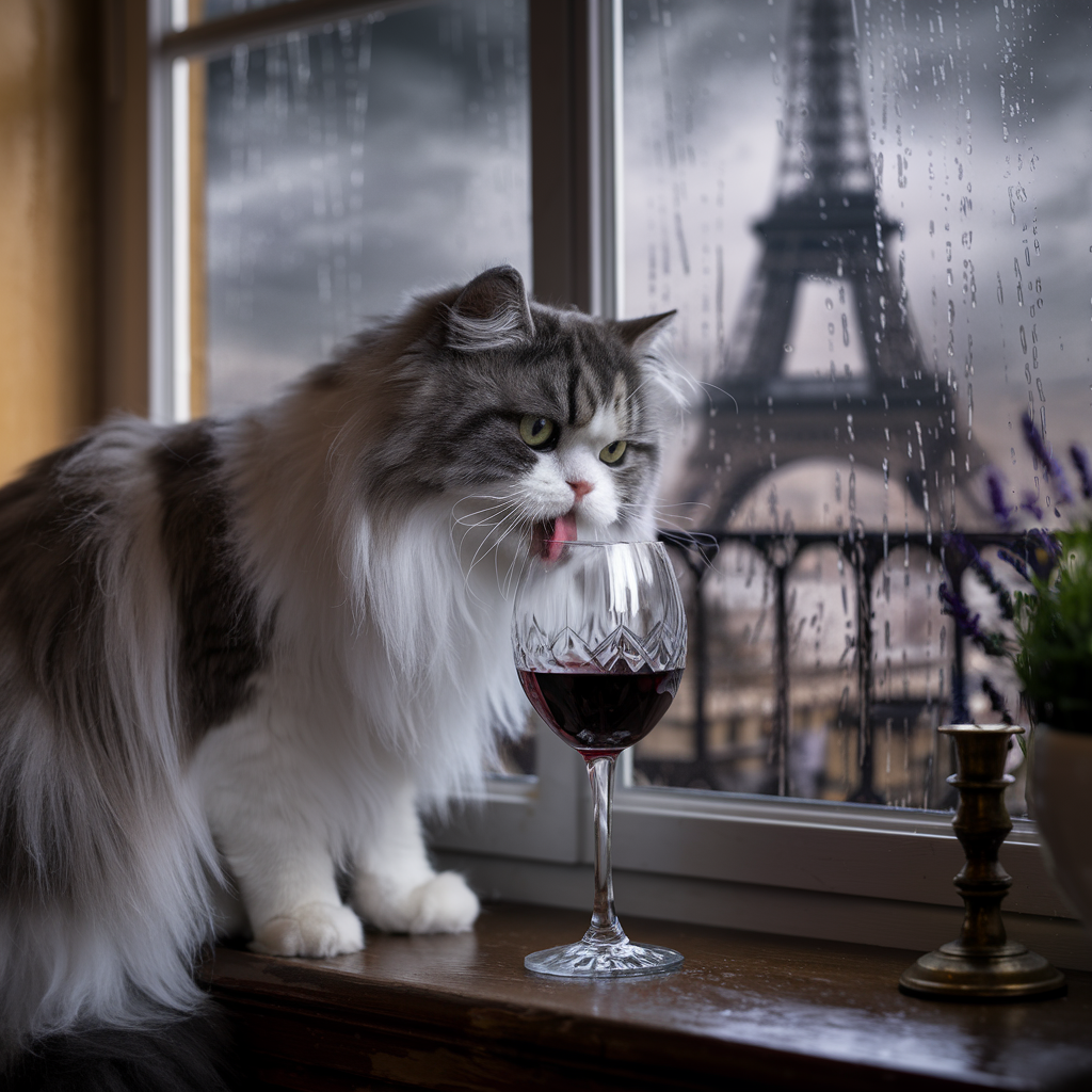 "Generate a realistic image of a fluffy and playful cat sipping red wine by a window on a rainy day in Paris".