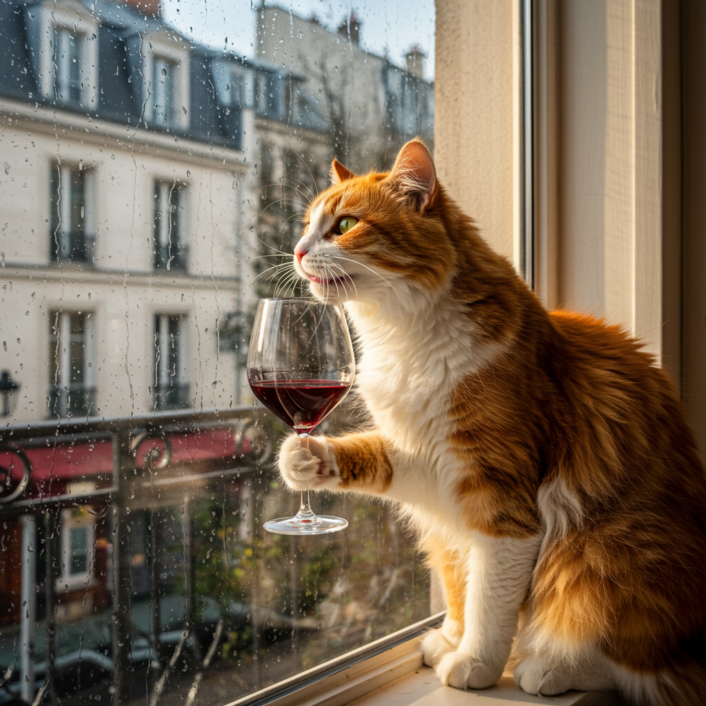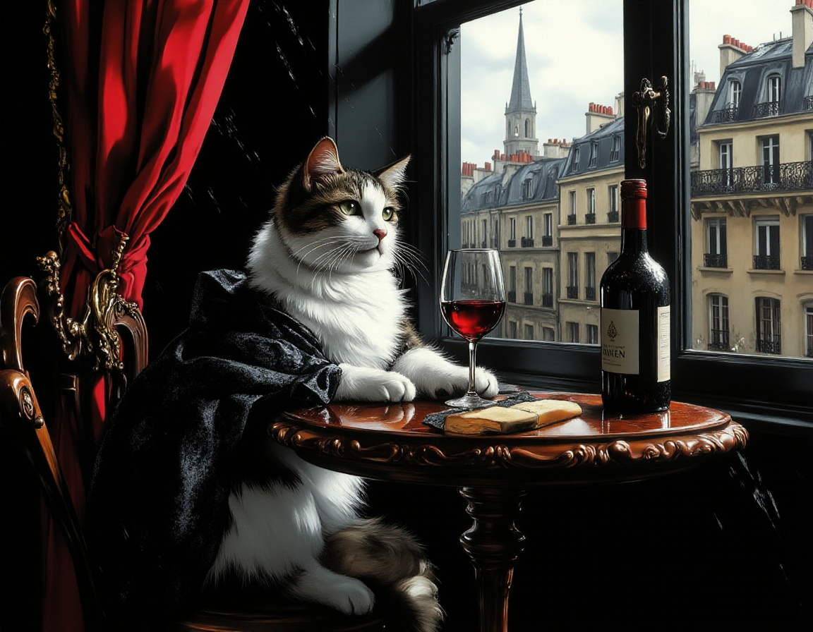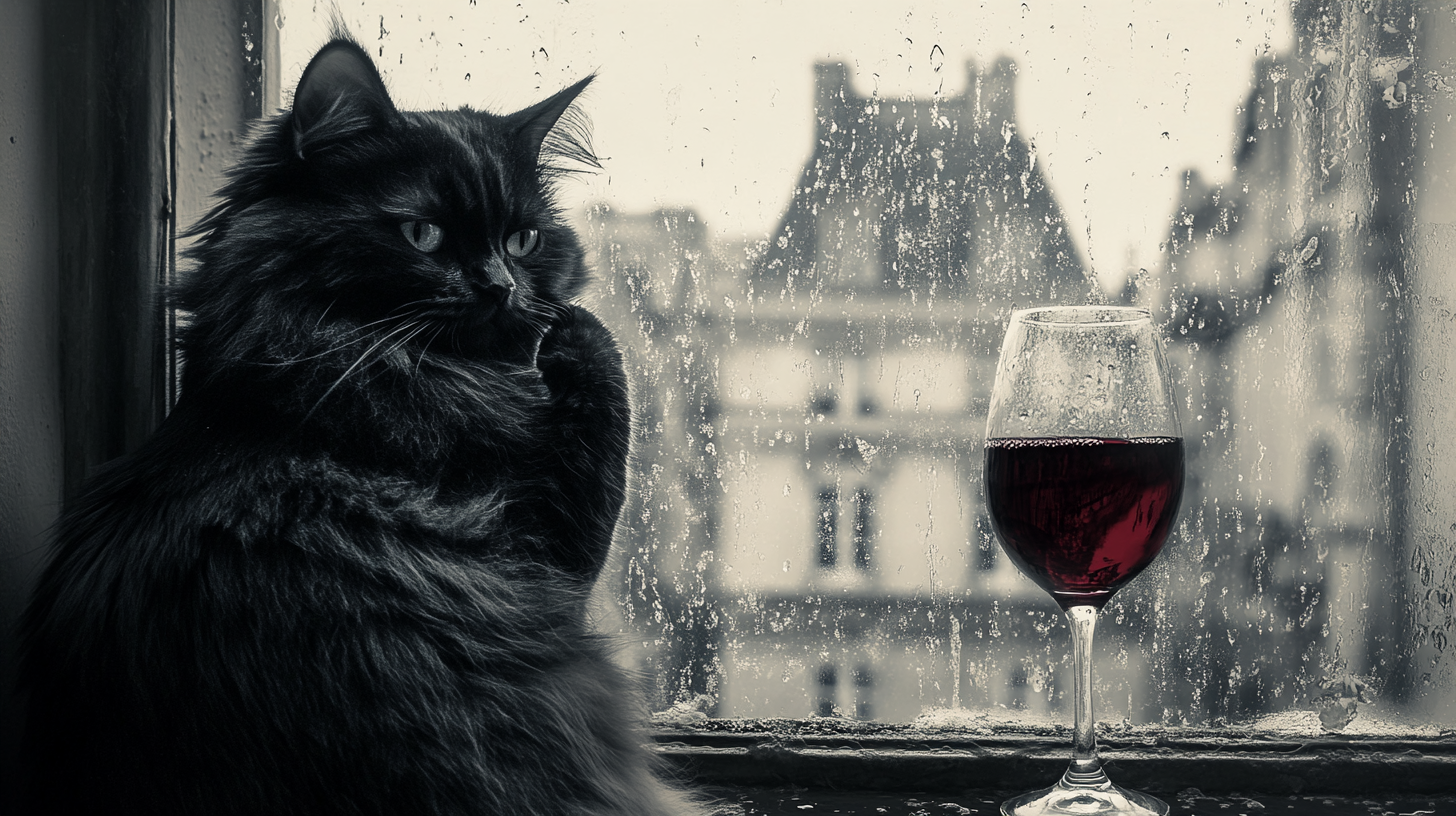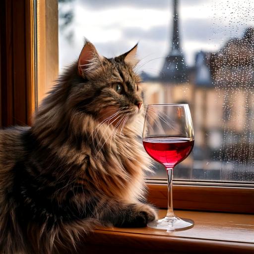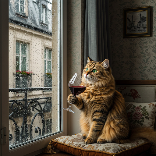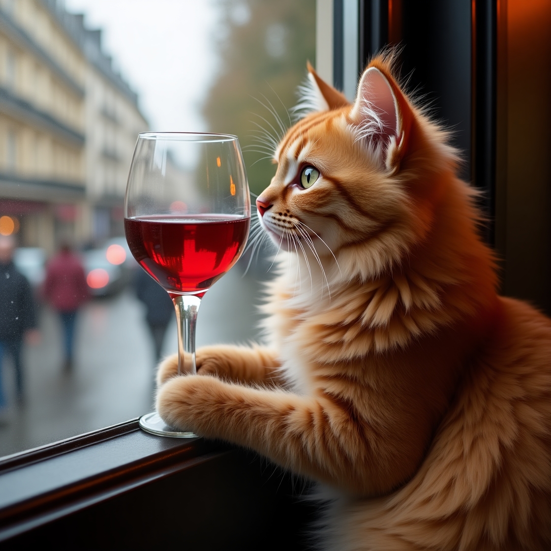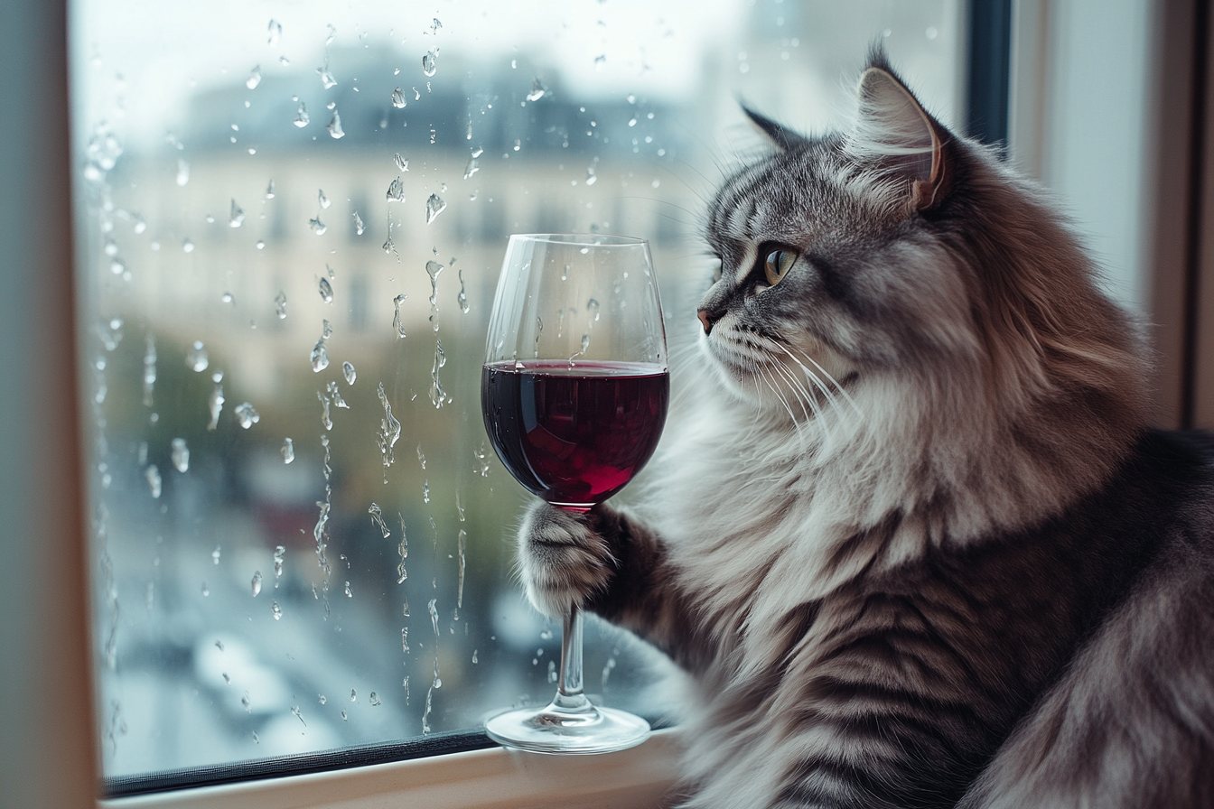 "Generate a realistic image of a fluffy and playful cat sipping red wine by a window on a rainy day in Paris".