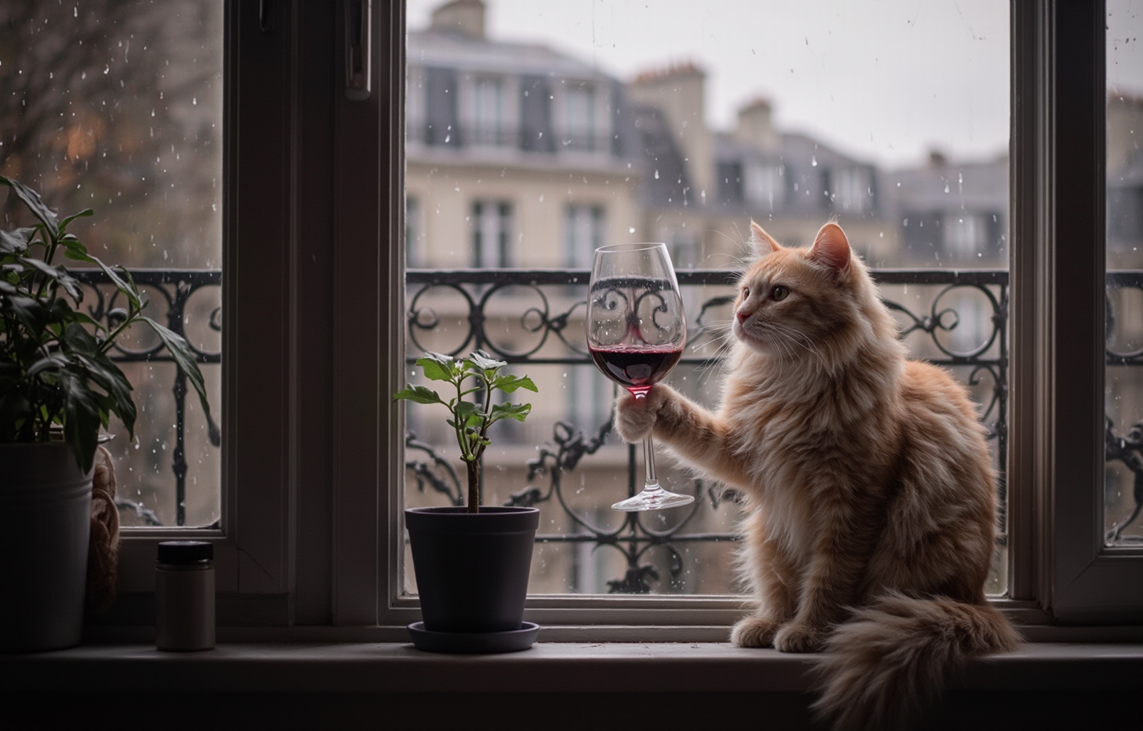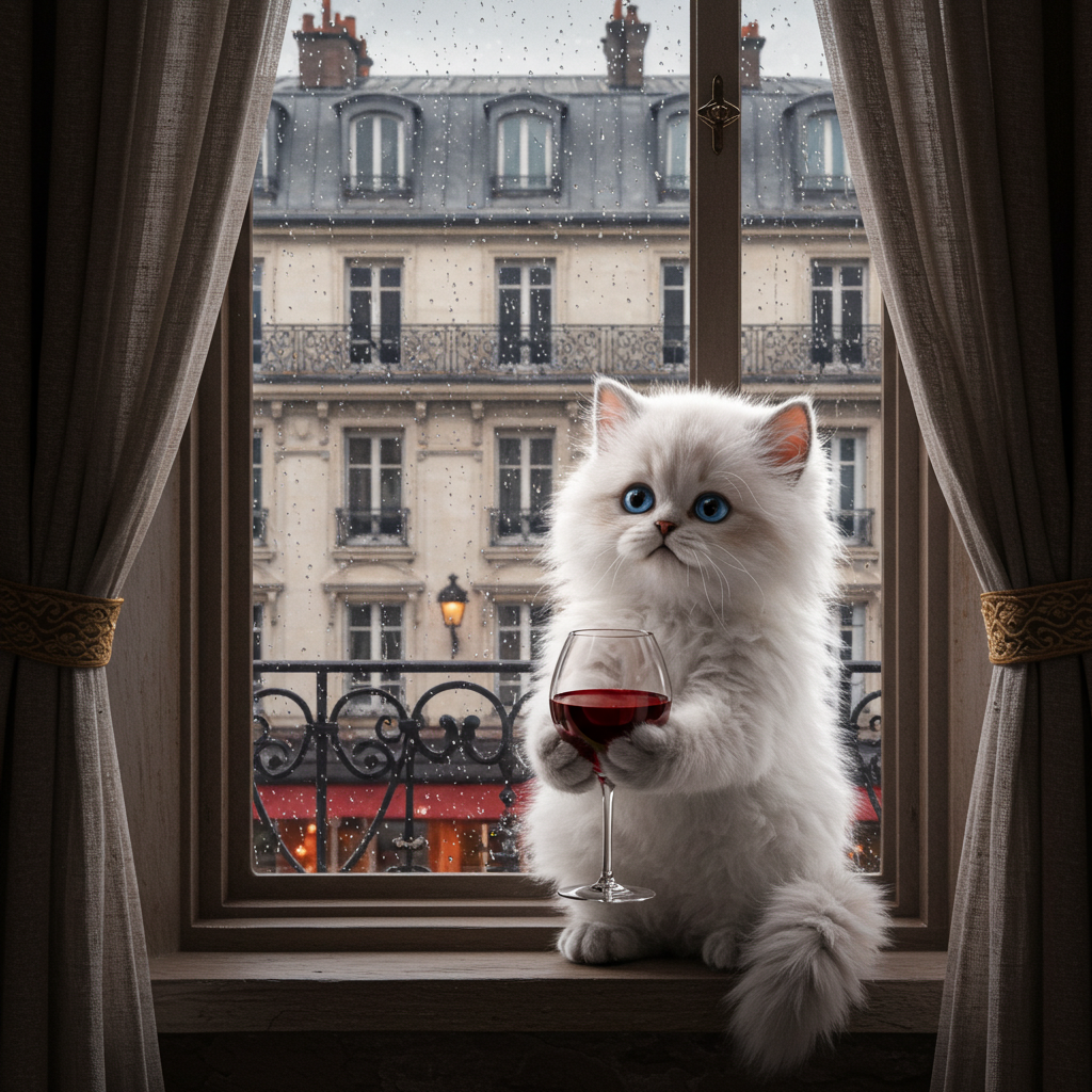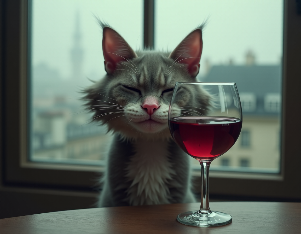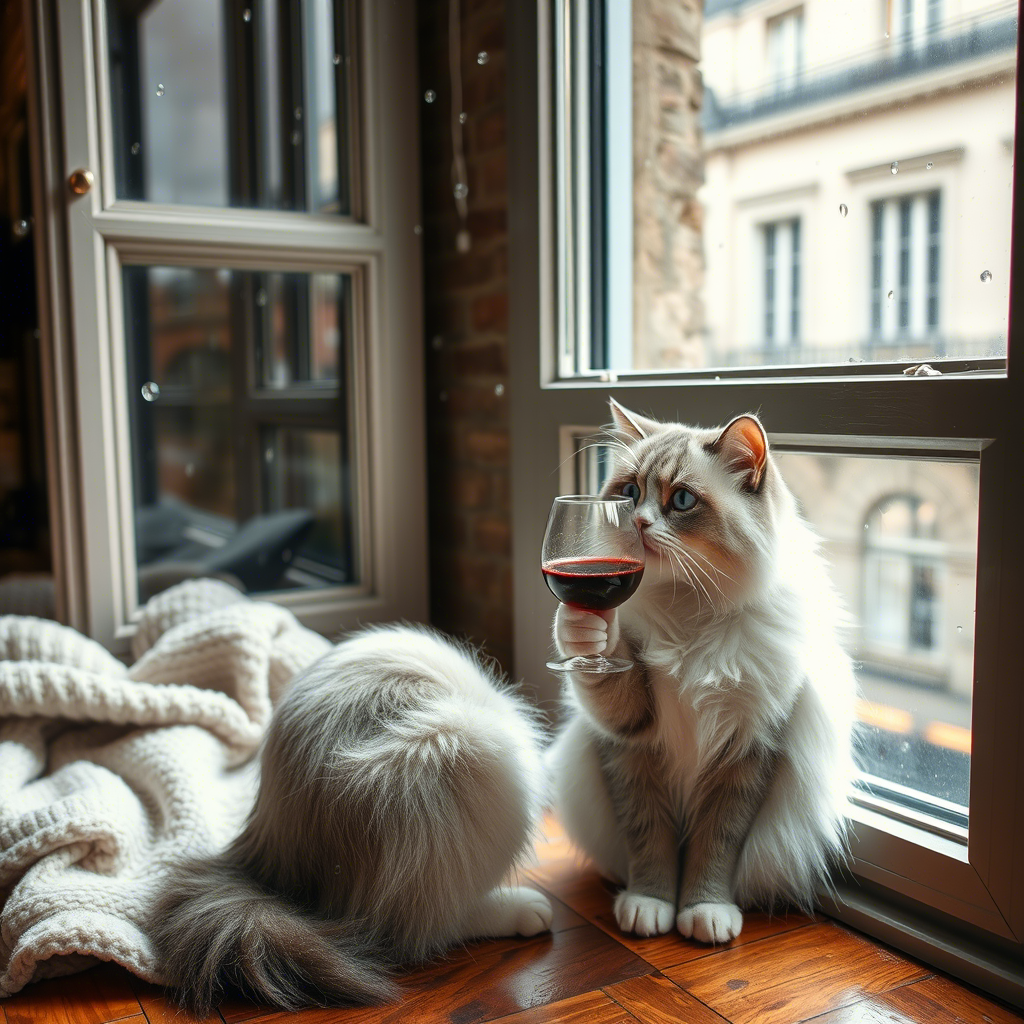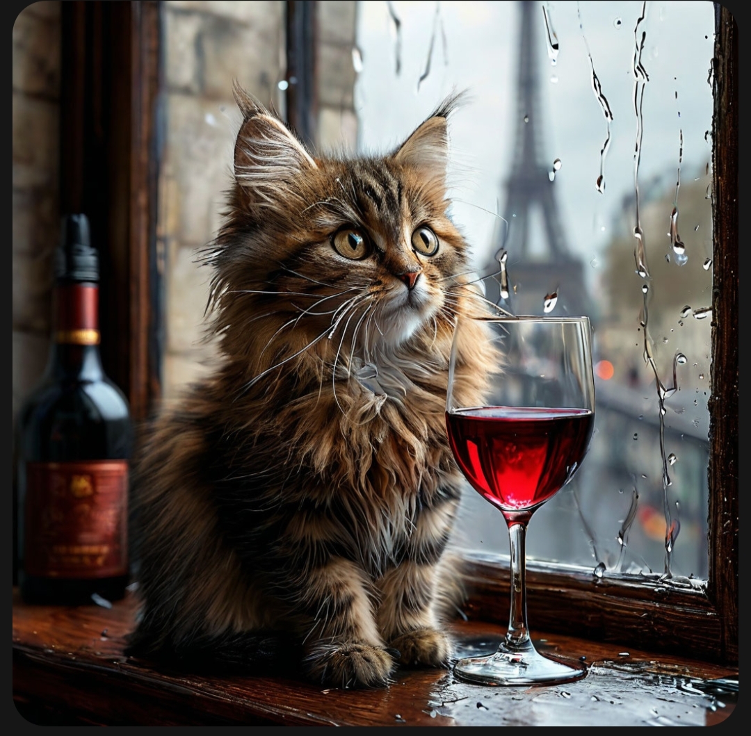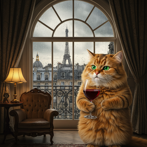 "Generate a realistic image of a fluffy and playful cat sipping red wine by a window on a rainy day in Paris".