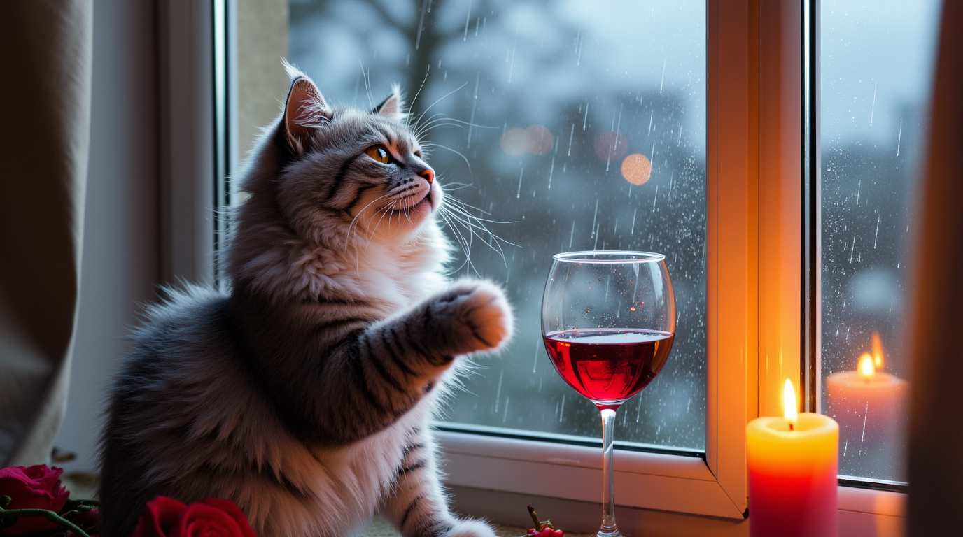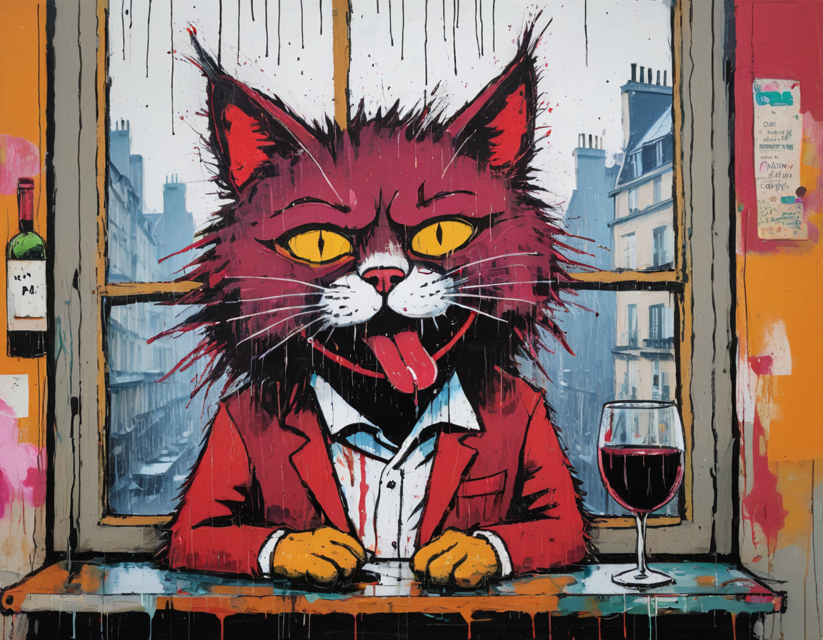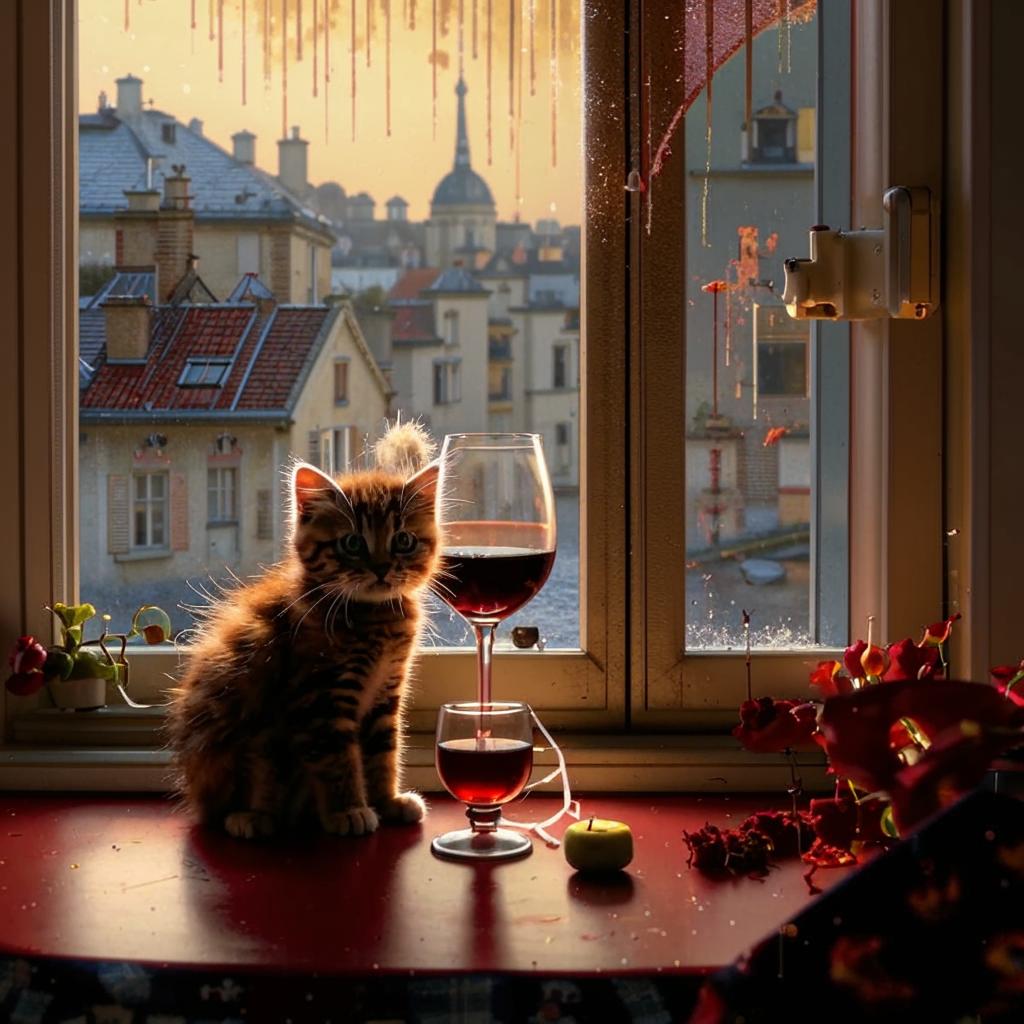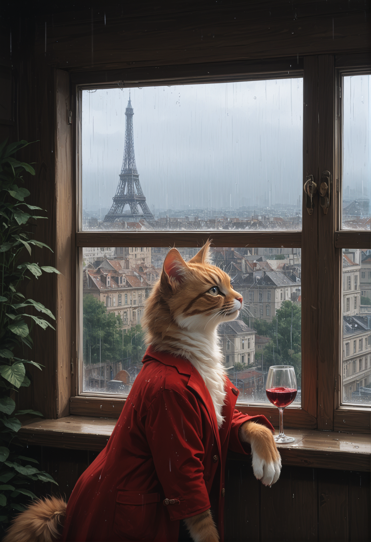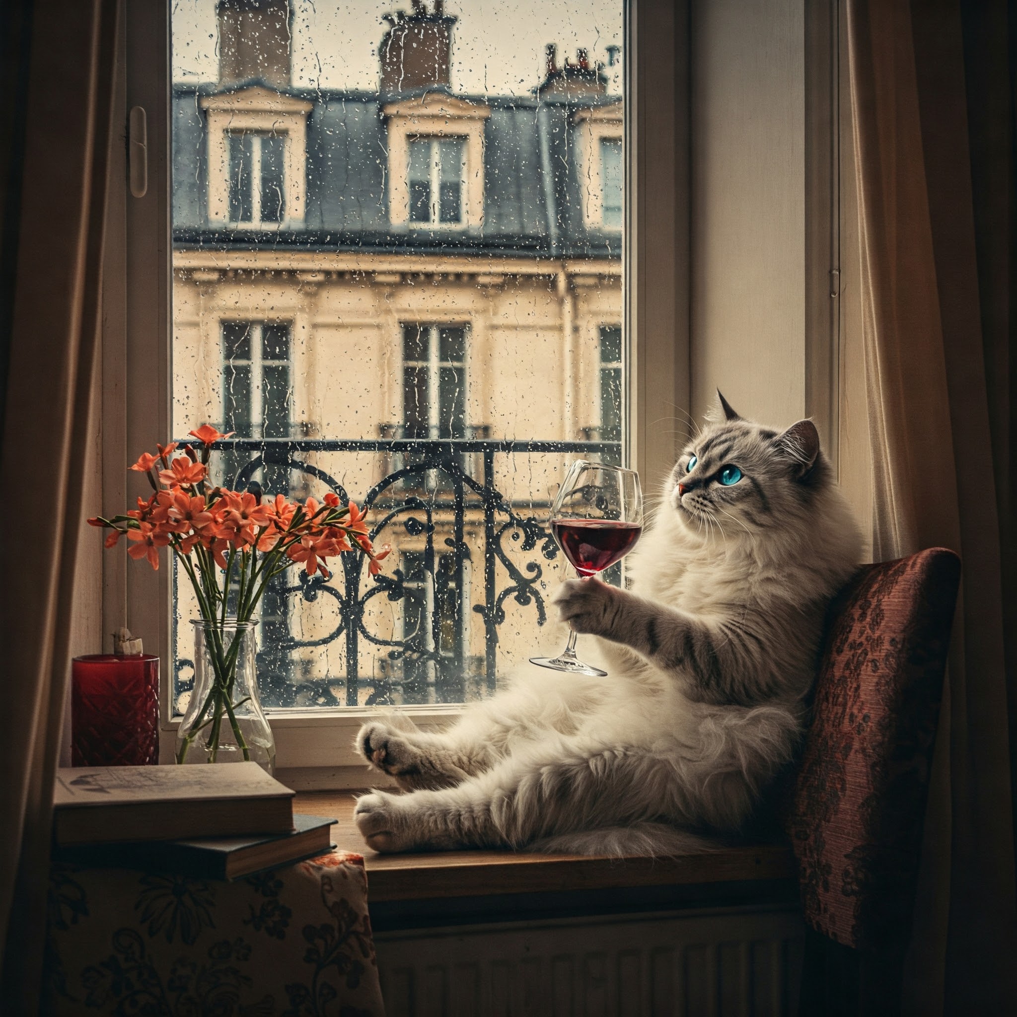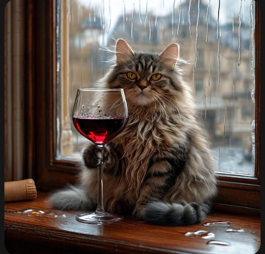 "Generate a realistic image of a fluffy and playful cat sipping red wine by a window on a rainy day in Paris".