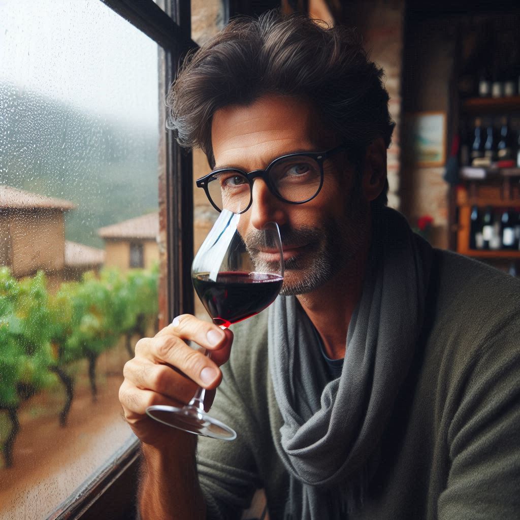 Generate a realistic image of Alex Exler sipping red wine by a window on a rainy day during his wine tour in Spain